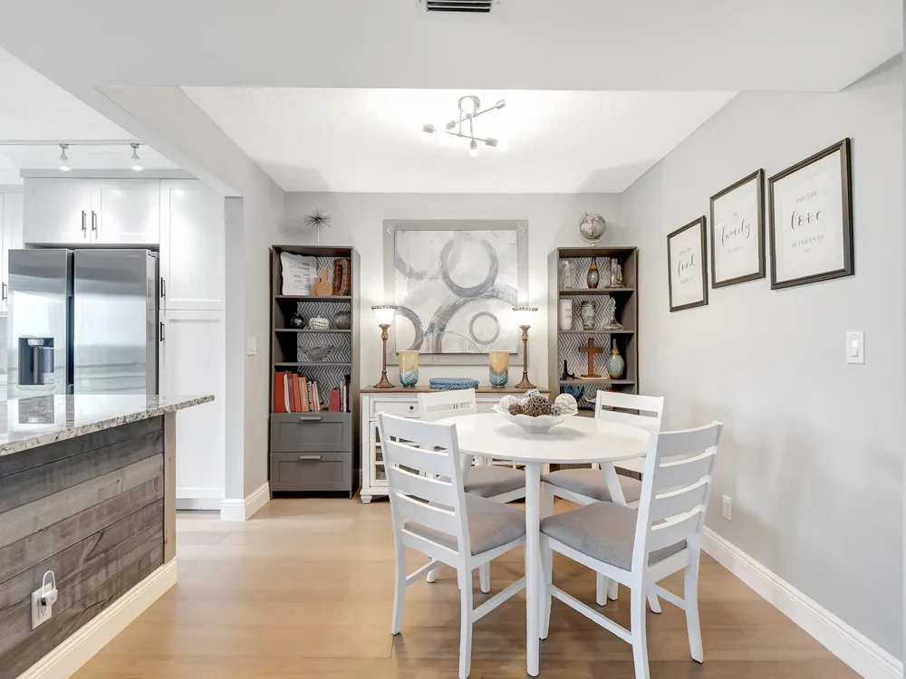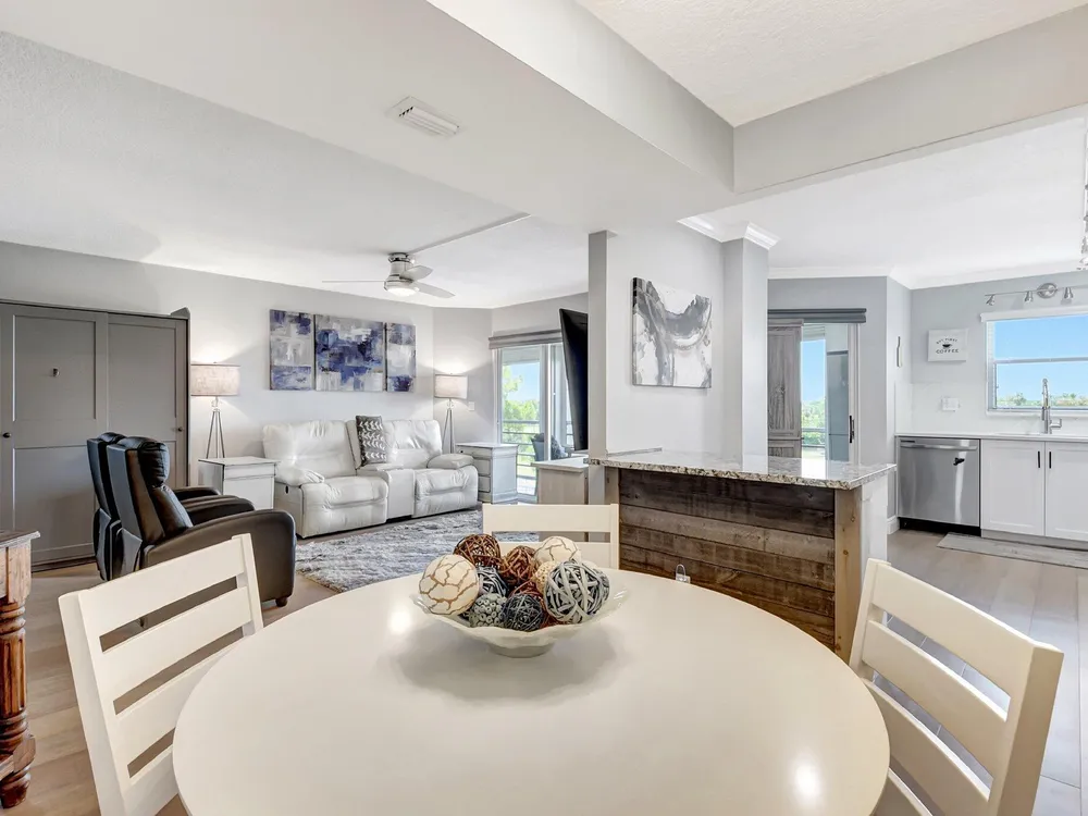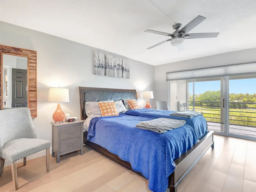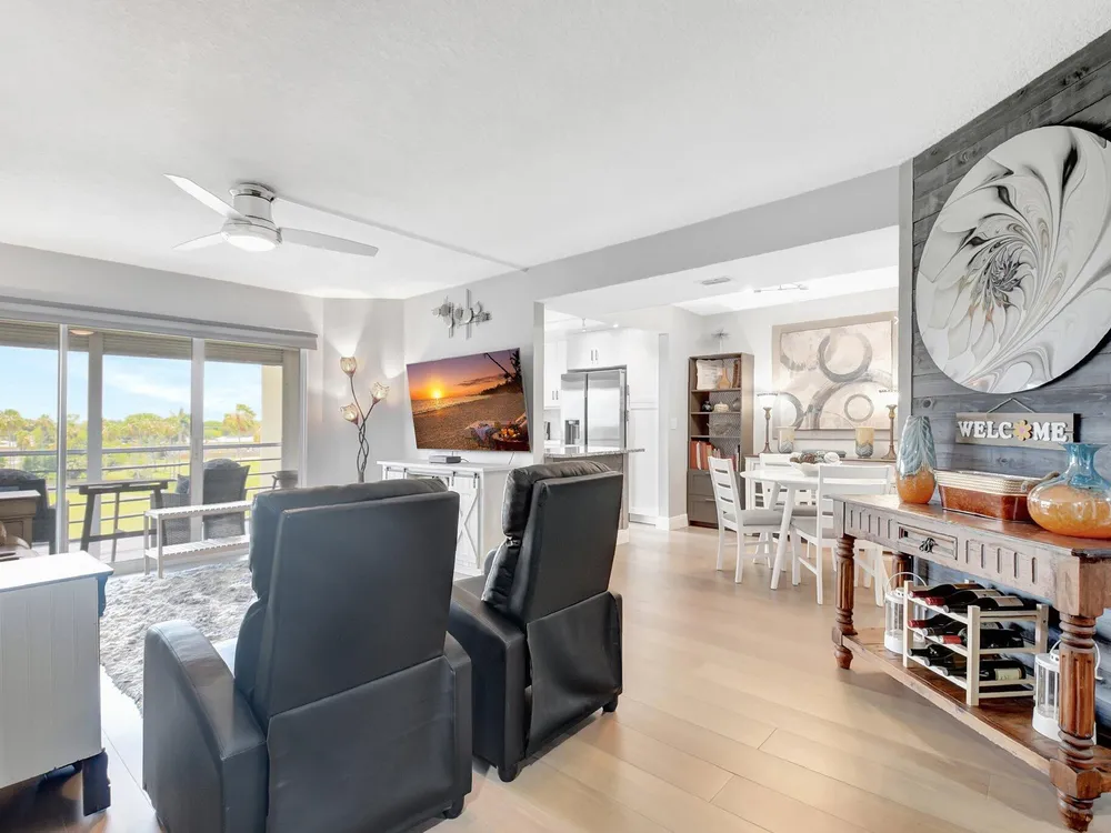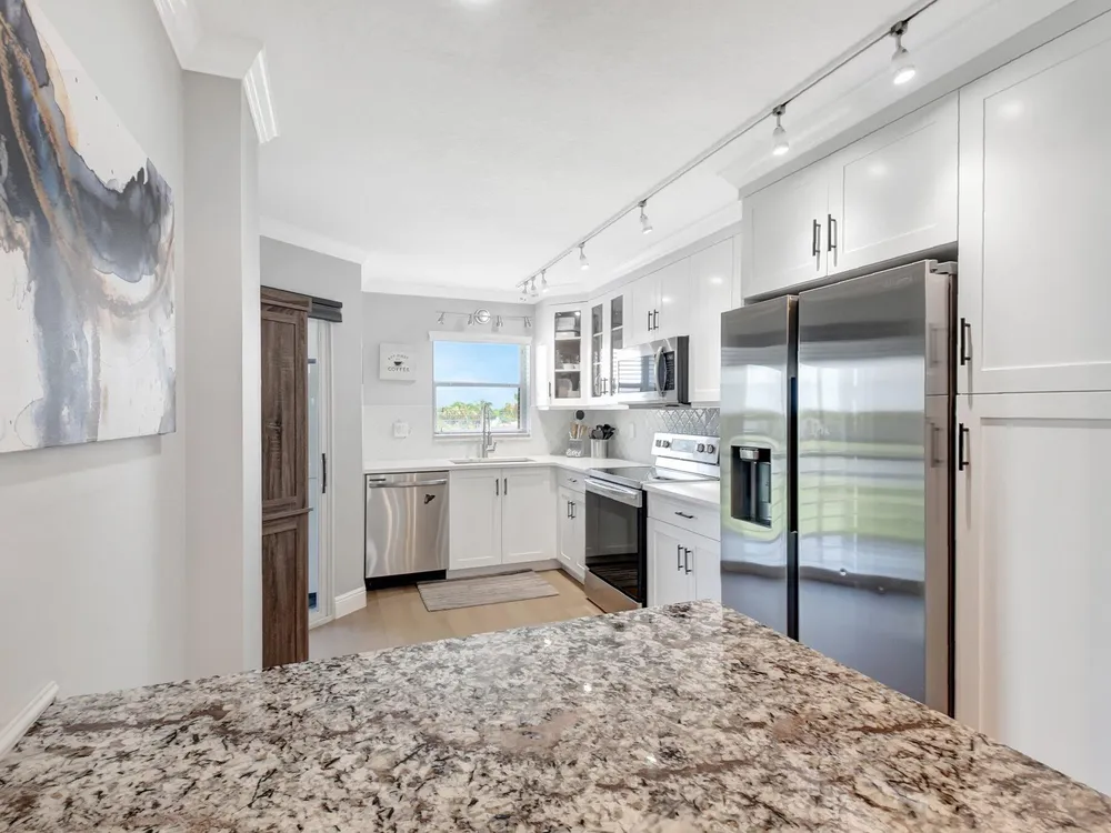 Golf course views with this lovely unit! Newer A/C, hot water heater, washer, dryer and disposal. New Bamboo floors, baths are tiled. New vanities and plumbing fixtures. New lighting, ceiling fans and wall mirrors. new doors, kitchen cabinets, countertops and backsplash. New peninsula between kitchen and dining. New window treatments throughout, Upgraded closet units in MBR.