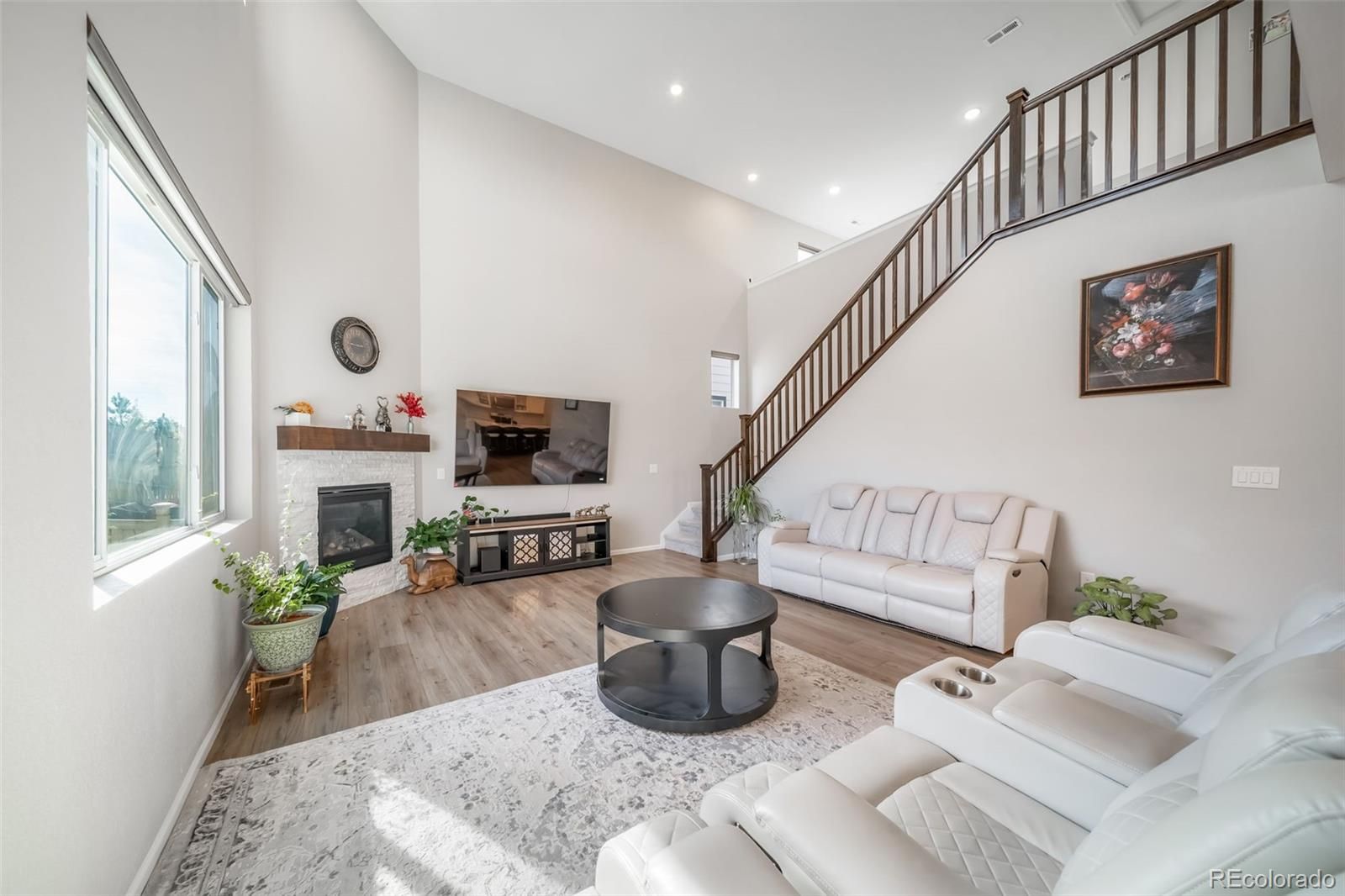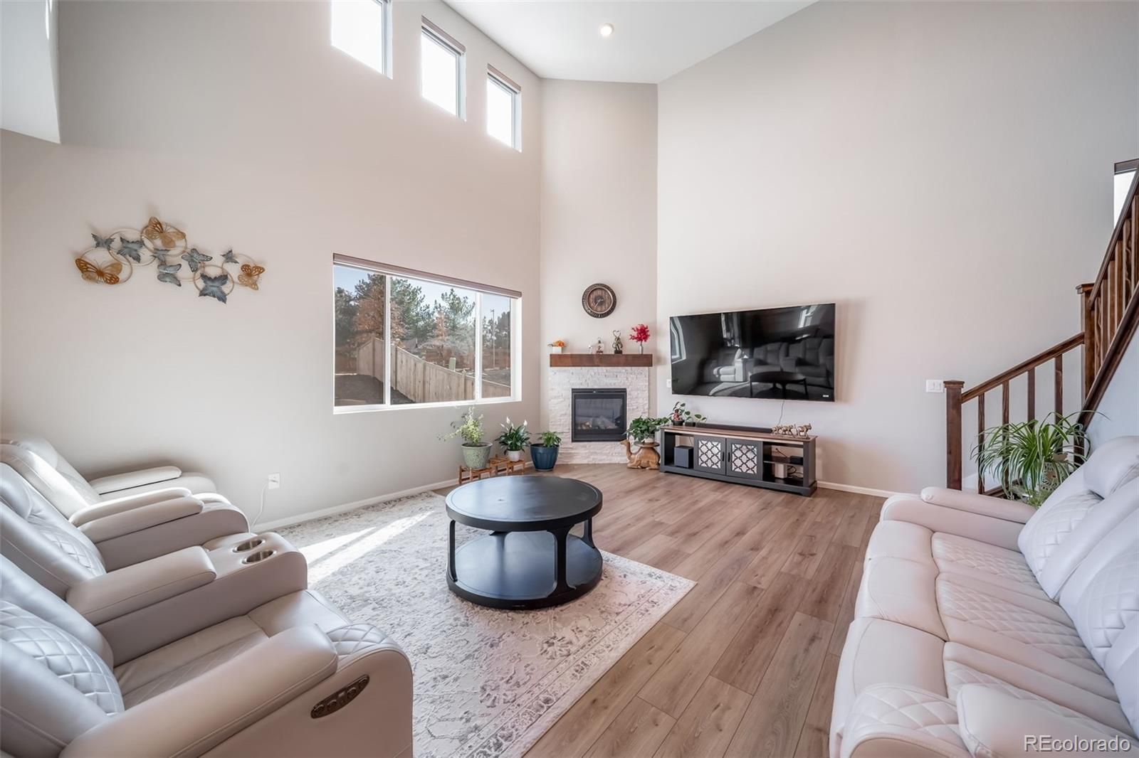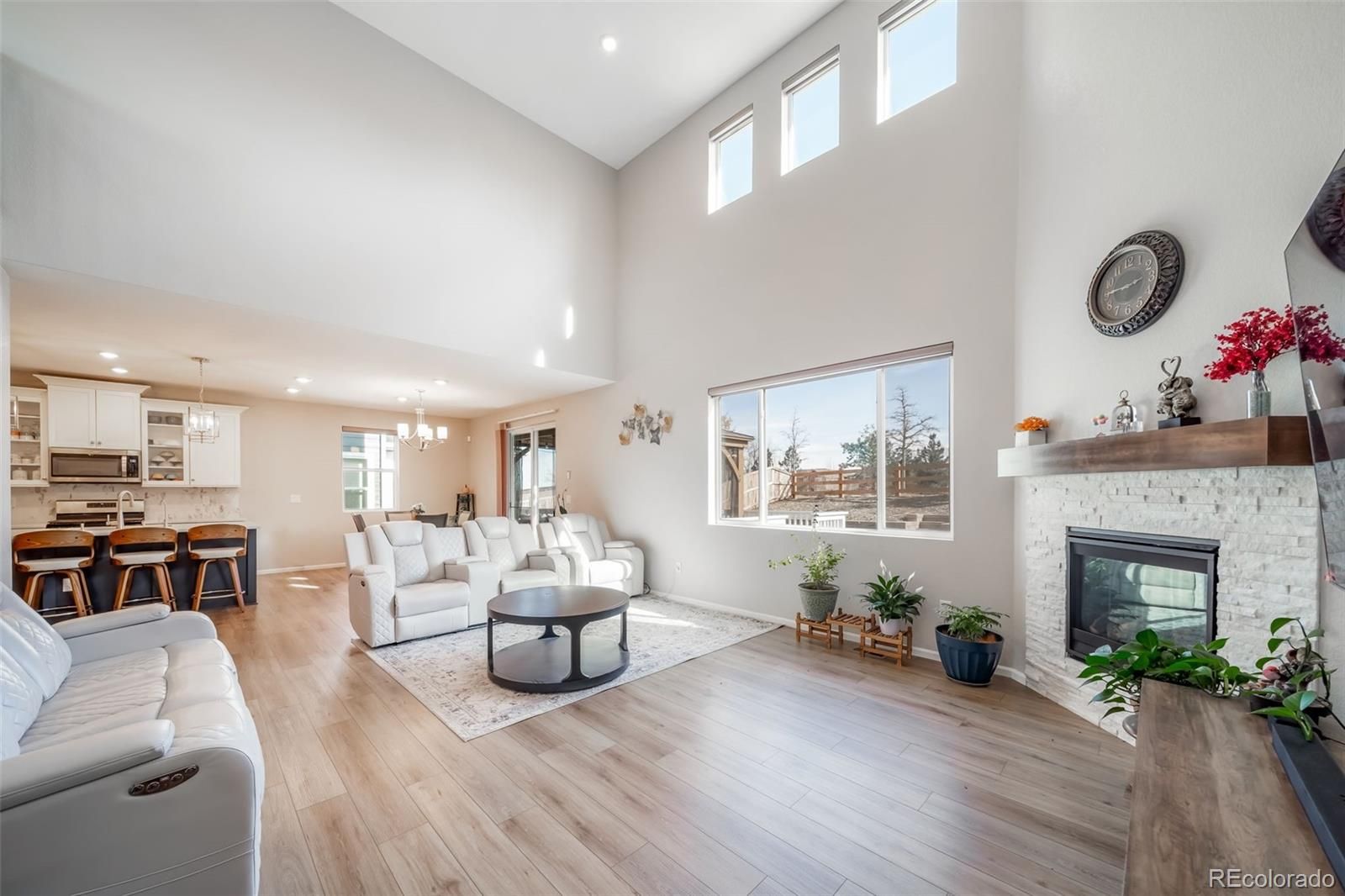 Welcome to this stunning, move-in-ready contemporary home that perfectly blends modern design with functional living. Featuring a striking blue-grey and stone exterior, this property offers curb appeal that stands out in a charming, well-maintained neighborhood. The exterior showcases a beautiful mix of horizontal siding, board-and-batten accents, and natural stone masonry. A welcoming front porch leads to a sleek black entry door, while the oversized driveway and two-car garage provide ample parking. Step inside to a grand, two-story great room bathed in natural light from expansive, tiered windows. The heart of the home features: Vaulted Ceilings: Creating an open, voluminous feel. Modern Fireplace: A floor-to-ceiling focal point with a rustic wood mantle and white stone surround. Laminate Wood Flooring: Durable and stylish flooring that flows seamlessly through the main living areas. Home Office/Flex Room, located off the main entryway, has elegant French glass doors that open into a bright room perfect for a home office, study, or guest bedroom. Seamless Transitions with an open layout ensure the living area, staircase, and upper loft remain connected, ideal for entertaining. Low-Maintenance Yard, at the front and side yards feature professional xeriscaping with decorative river rock and drought-resistant plantings. A private outdoor space in a fenced side yard offers privacy for pets or outdoor relaxation. Solar panels are installed and paid off.. Essentially NO ELECTRICAL BILL FOR LIFE.