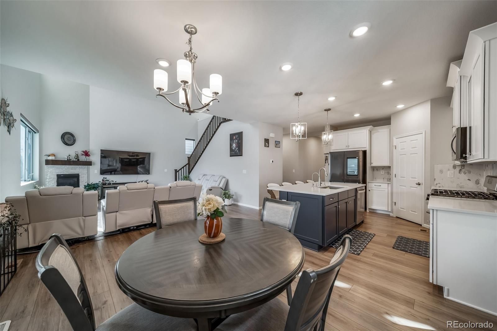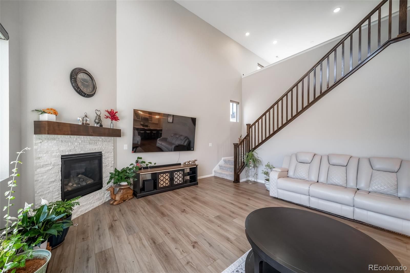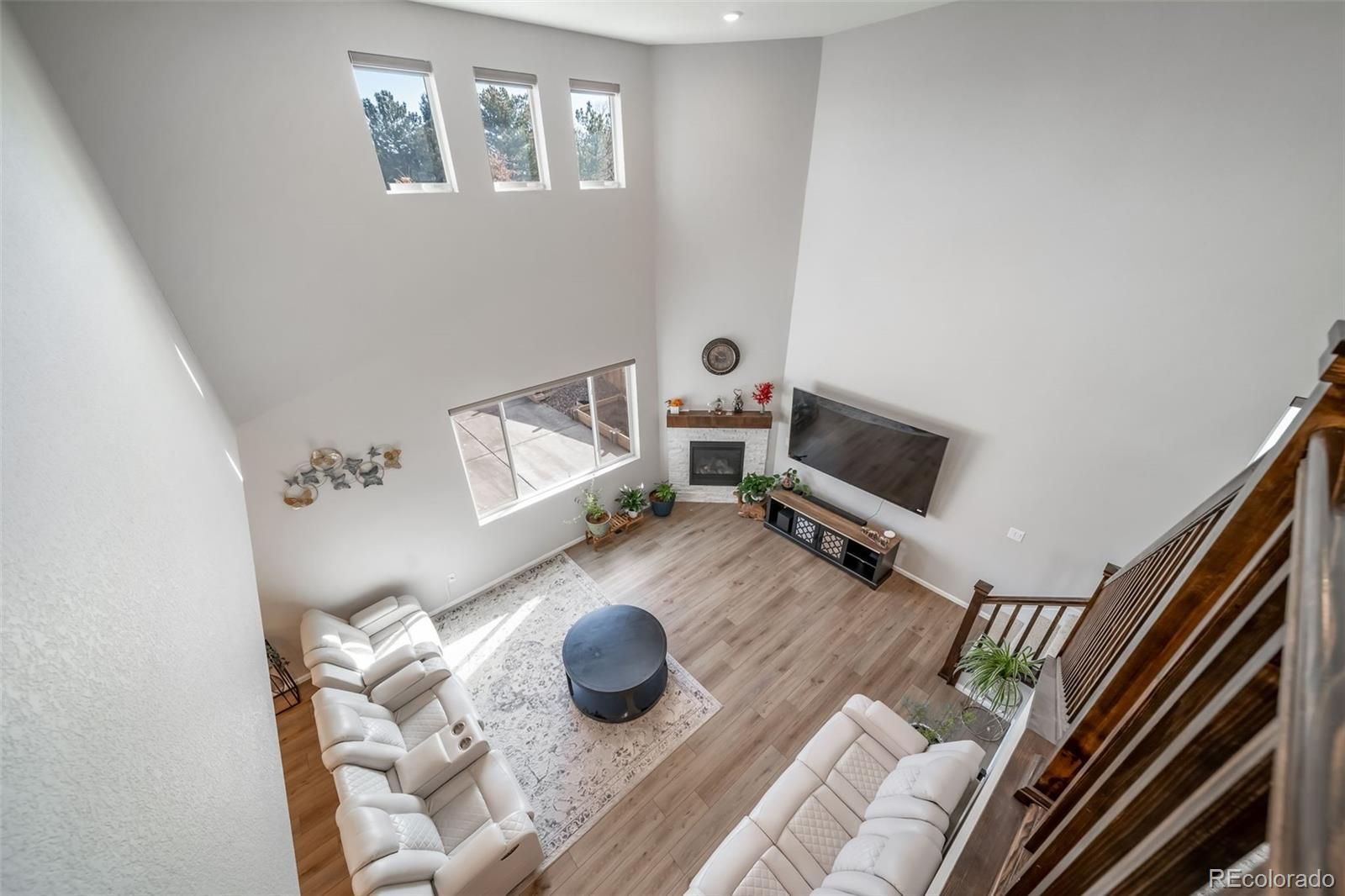 Welcome to this stunning, move-in-ready contemporary home that perfectly blends modern design with functional living. Featuring a striking blue-grey and stone exterior, this property offers curb appeal that stands out in a charming, well-maintained neighborhood. The exterior showcases a beautiful mix of horizontal siding, board-and-batten accents, and natural stone masonry. A welcoming front porch leads to a sleek black entry door, while the oversized driveway and two-car garage provide ample parking. Step inside to a grand, two-story great room bathed in natural light from expansive, tiered windows. The heart of the home features: Vaulted Ceilings: Creating an open, voluminous feel. Modern Fireplace: A floor-to-ceiling focal point with a rustic wood mantle and white stone surround. Laminate Wood Flooring: Durable and stylish flooring that flows seamlessly through the main living areas. Home Office/Flex Room, located off the main entryway, has elegant French glass doors that open into a bright room perfect for a home office, study, or guest bedroom. Seamless Transitions with an open layout ensure the living area, staircase, and upper loft remain connected, ideal for entertaining. Low-Maintenance Yard, at the front and side yards feature professional xeriscaping with decorative river rock and drought-resistant plantings. A private outdoor space in a fenced side yard offers privacy for pets or outdoor relaxation. Solar panels are installed and paid off.. Essentially NO ELECTRICAL BILL FOR LIFE.