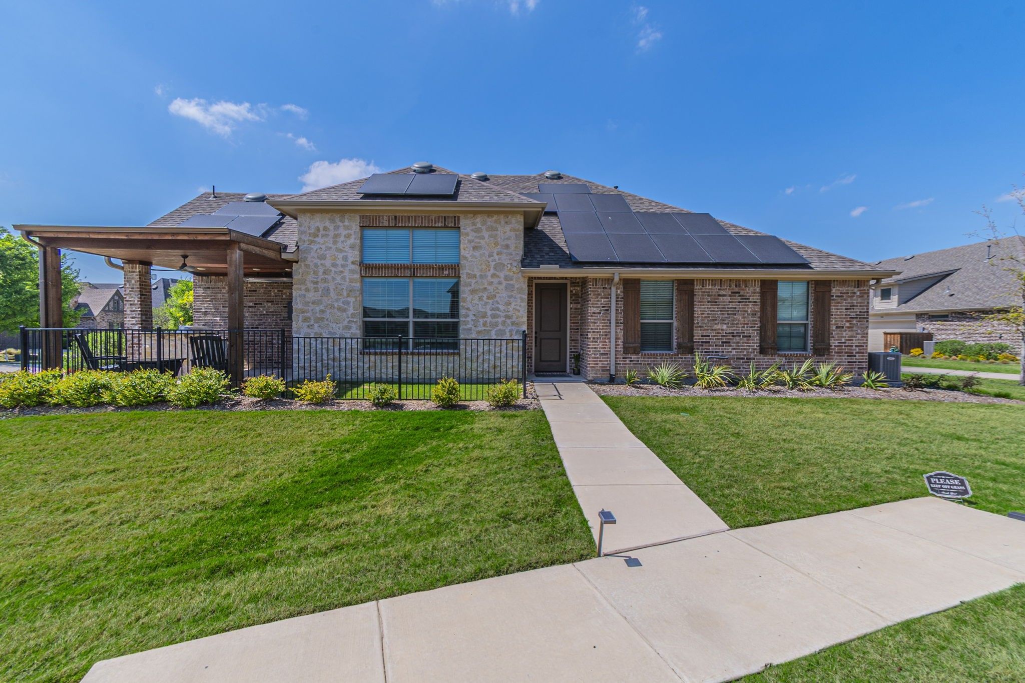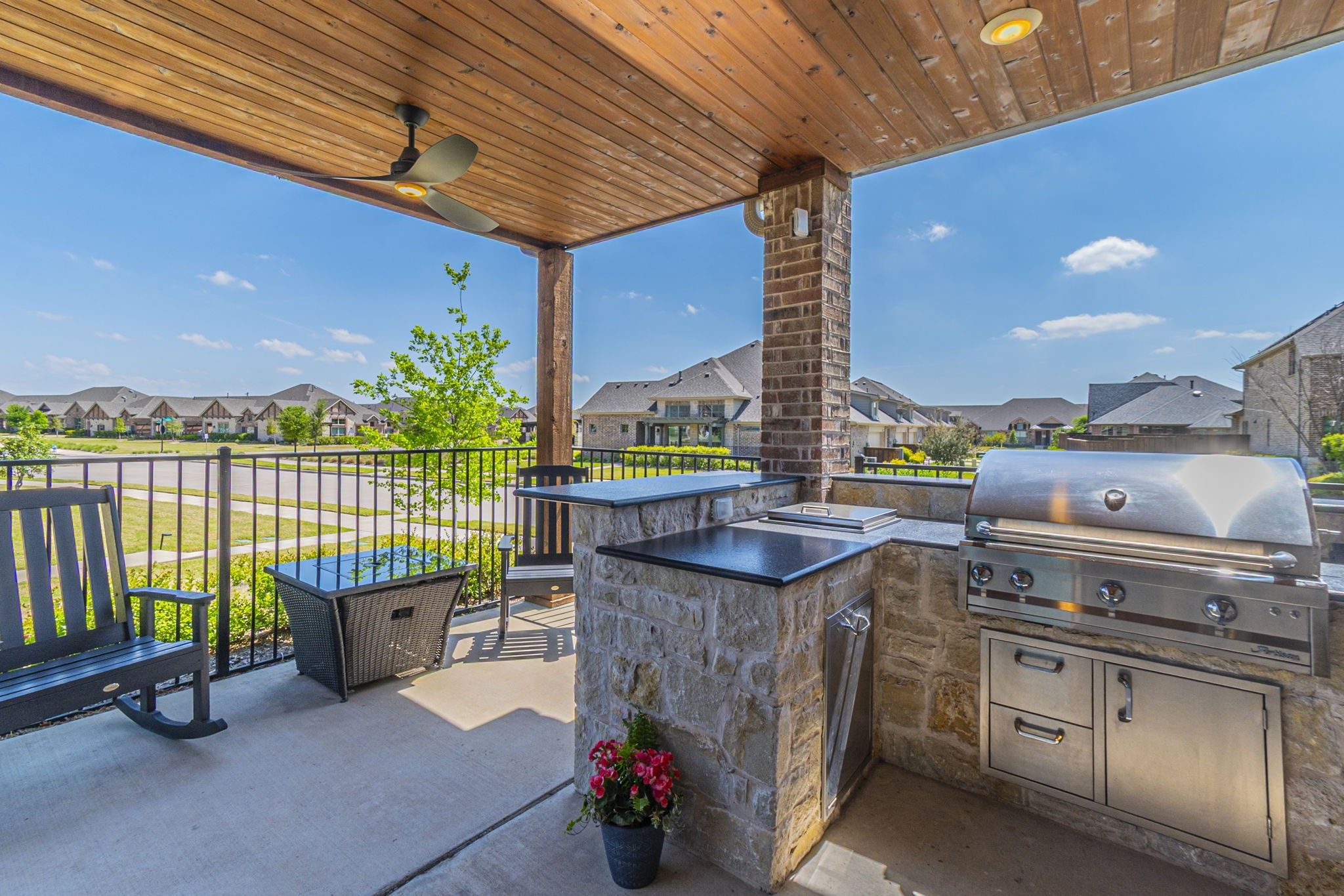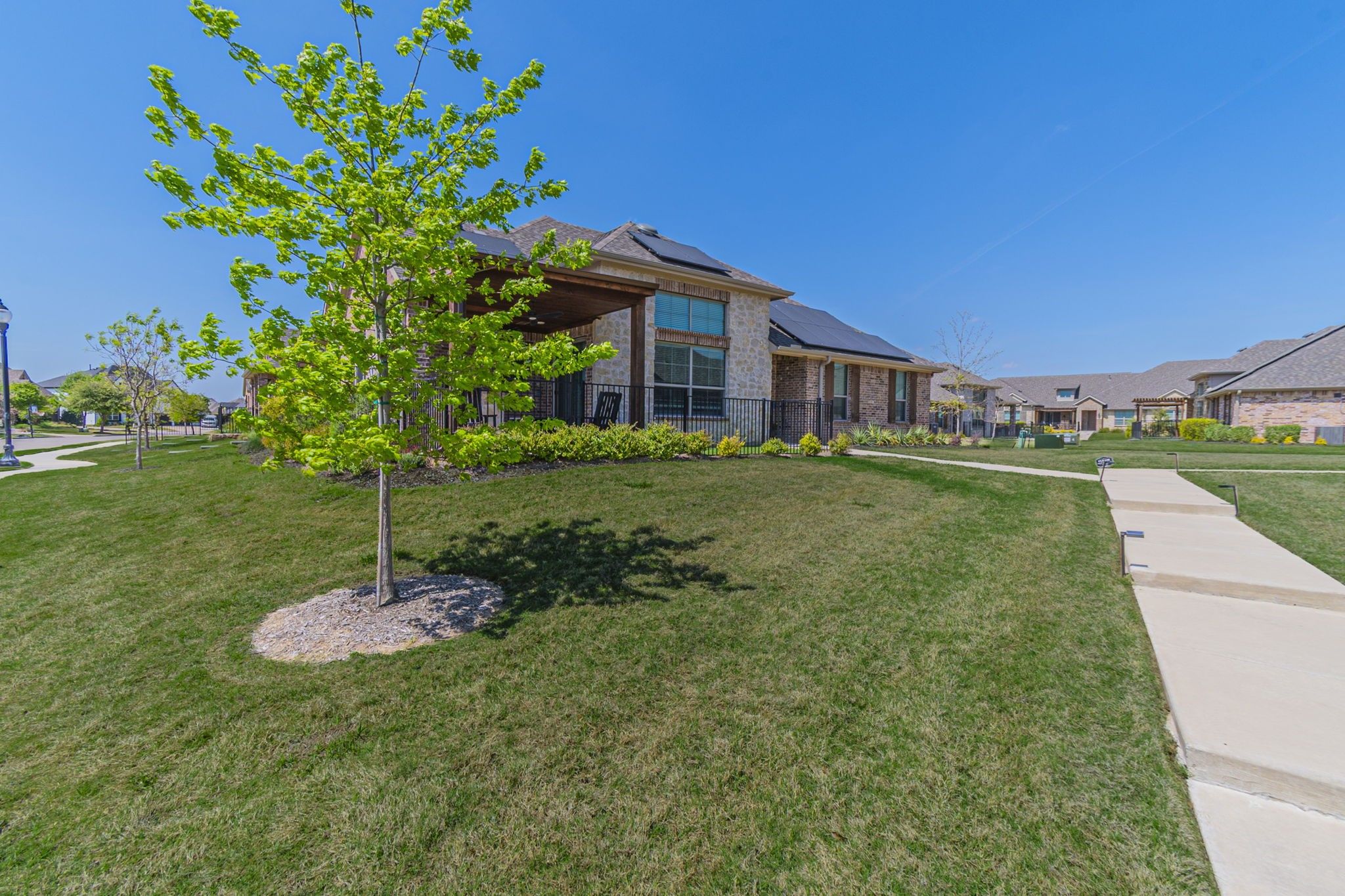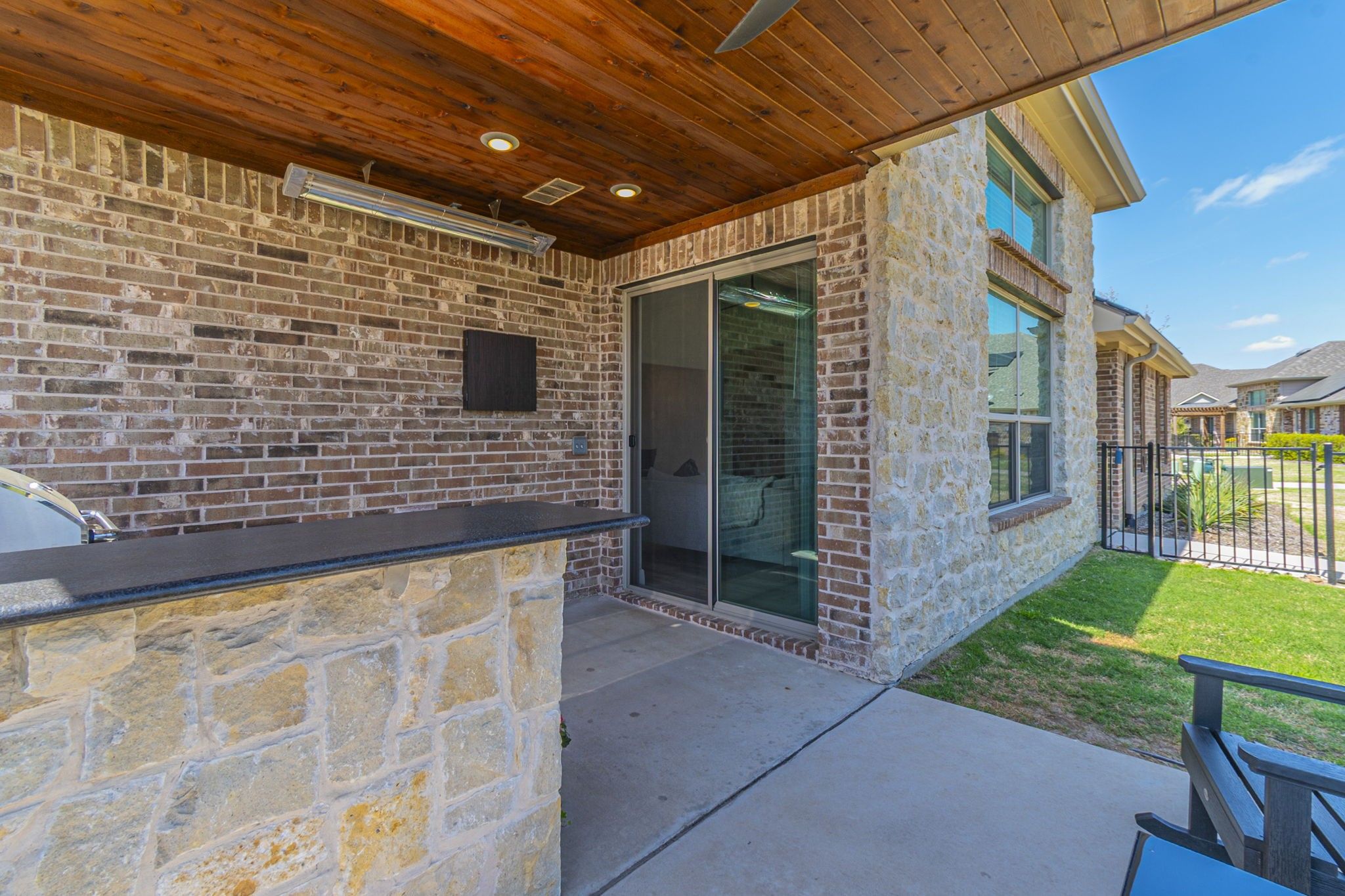 Discover this exceptional 3-bedroom, 2-bathroom Geneva plan Villa by Grenadier Homes in the highly sought-after Windsong Ranch community of Prosper, TX, offering 1,702 sq ft of single-story, low-maintenance living with custom upgrades and the privacy and light of an end-unit position. Step inside to an open layout with vaulted ceilings creating a bright, spacious feel. The gourmet kitchen features a large island ideal for prep and dining, quartz countertops, dark cabinetry, a gas stovetop, and a custom additional cabinet built by the owner for enhanced storage. It flows seamlessly into dining and family areas, filled with natural light from extra end-unit windows. The primary suite offers a spa-like ensuite with quartz countertops on a double vanity, elegant cabinetry, and modern lighting. Two additional bedrooms provide flexibility for guests, office, or hobbies. A highlight is the upgraded outdoor kitchen on the covered patio, with natural gas grill, built-in heater for year-round use, stone countertops, and storage—extending indoor living to the private end-unit yard for entertaining or relaxation. Owned solar panels convey, providing energy savings, lower utility costs, and long-term value through efficiency and potential tax benefits. This lock-and-leave villa sits in award-winning Windsong Ranch, with access to the 5-acre Crystal Lagoon (white-sand beaches, kayaking, paddleboarding), multiple pools, splash park, fitness center, tennis, pickleball, basketball courts, trails, parks, playgrounds, amphitheater, disc golf, dog park, community garden, and on-site Café. Community events foster connection, with front yard maintenance often included in HOA. Convenient to Prosper ISD schools, shopping, dining, and highways, this home blends premium upgrades, privacy, and resort-style living.
