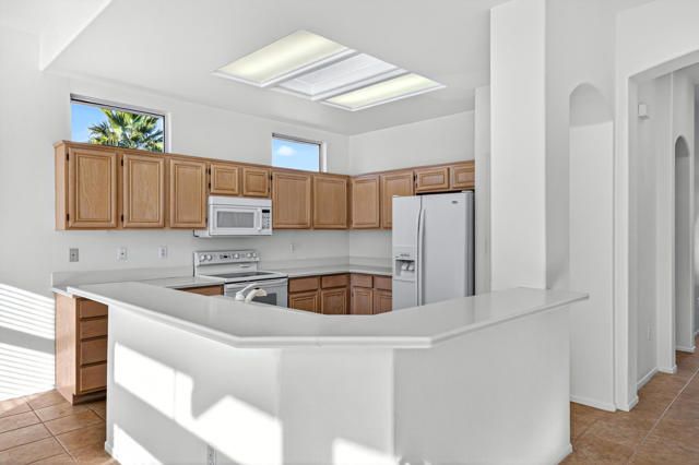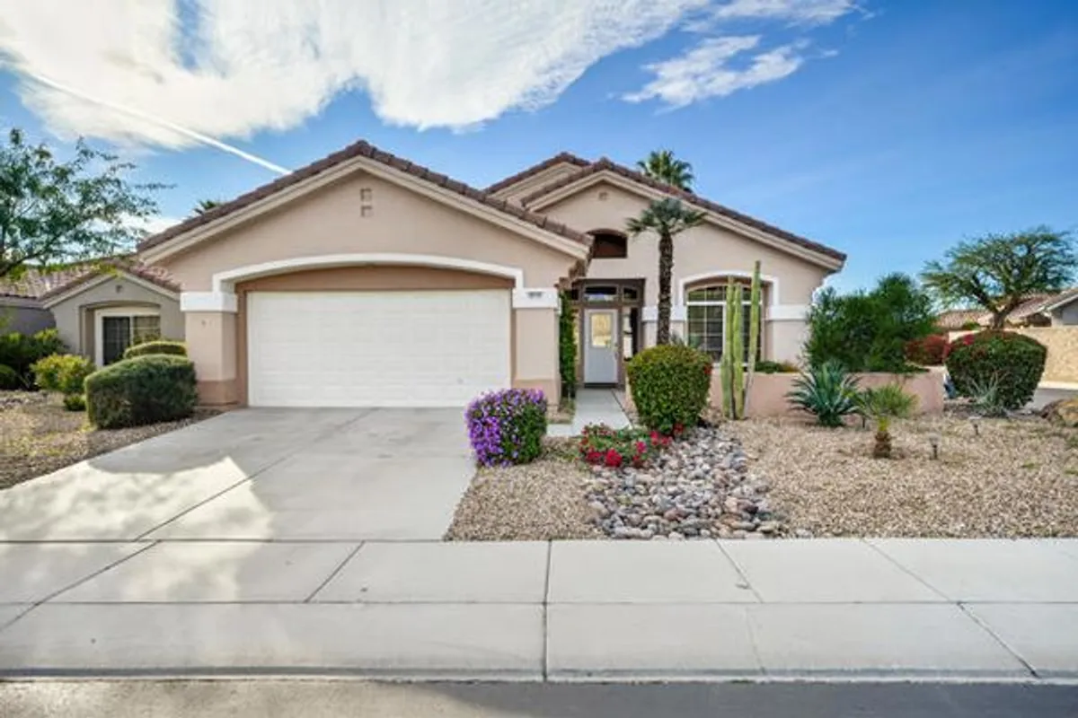 Located on a desirable corner lot in the premier 55+ active adult community of Sun City Palm Desert, this inviting Towle floor plan offers 1,475 square feet (EST.) of thoughtfully designed living space. Built in 1994, the home features a weep screed and is filled with natural light and an open, welcoming layout ideal for both everyday living and entertaining. The spacious great room showcases vaulted ceilings, tile flooring, and expansive windows that flood the space with sunlight. The open-concept kitchen offers ample cabinetry, generous counter space, a breakfast bar, skylights, and clerestory windows--creating a bright and airy setting for casual meals or hosting guests. Large windows and sliding glass doors provide seamless indoor-outdoor living and open to a private patio surrounded by mature desert landscaping--perfect for morning coffee or relaxing evenings. The primary suite serves as a comfortable retreat with a walk-in closet and an en-suite bath featuring dual vanities and a spacious walk-in shower. A guest bedroom and nearby full bath offer flexibility for visitors or a home office. Additional highlights include ceiling fans throughout, laundry conveniently located in the attached garage, and a new garage door and motor installed in May 2025. The corner lot location enhances privacy and curb appeal with low-maintenance landscaping. Sun City Palm Desert residents enjoy recently updated clubhouses, newly repaired streets completed in 2025, championship golf courses, multiple pools, fitness centers, tennis and pickleball courts, walking trails, and a vibrant calendar of social activities--all set against beautiful mountain backdrops.
