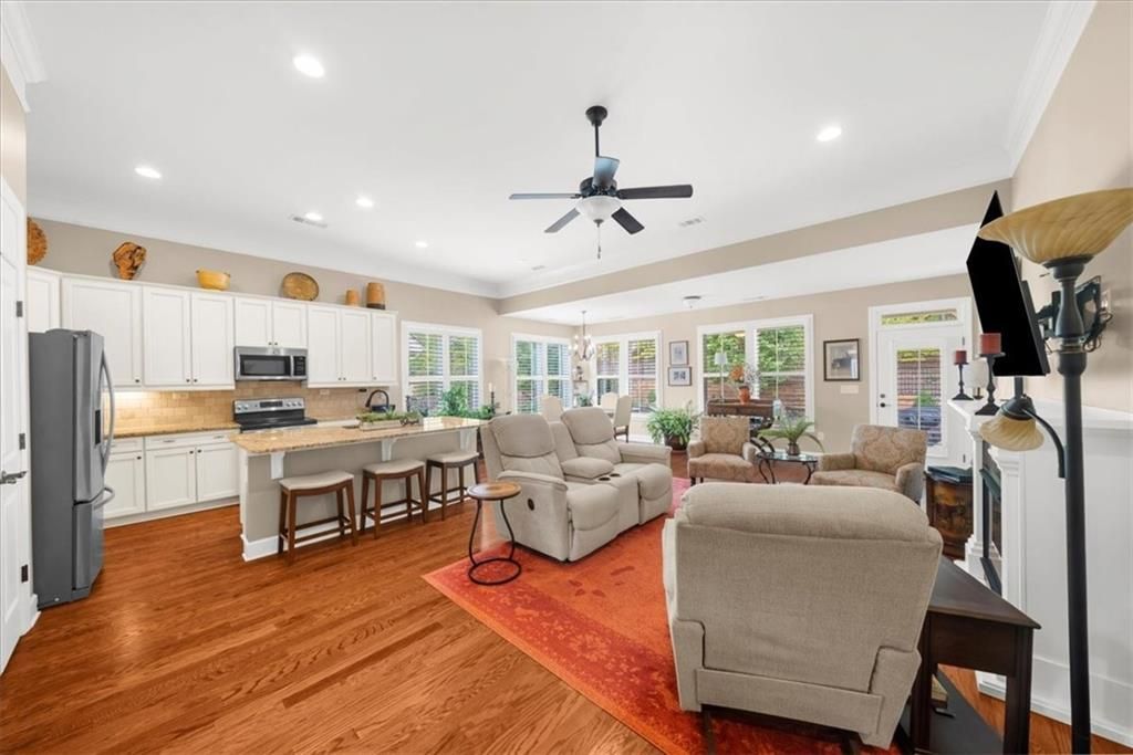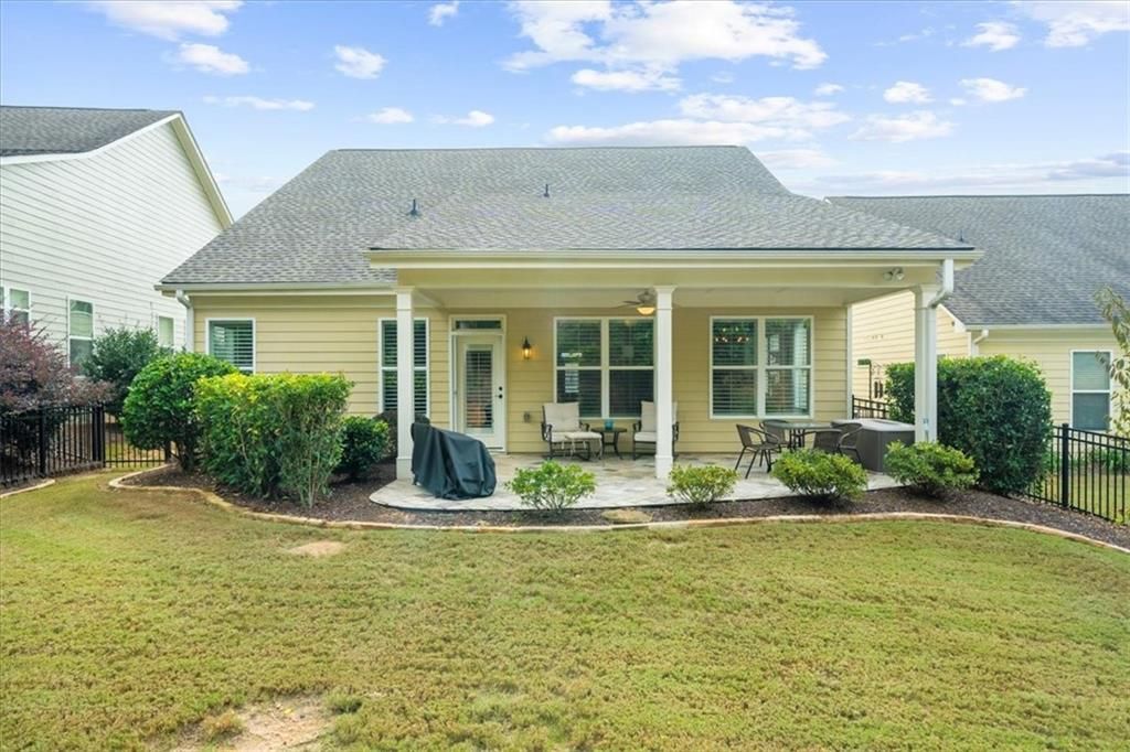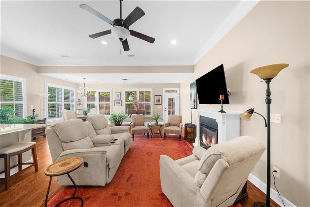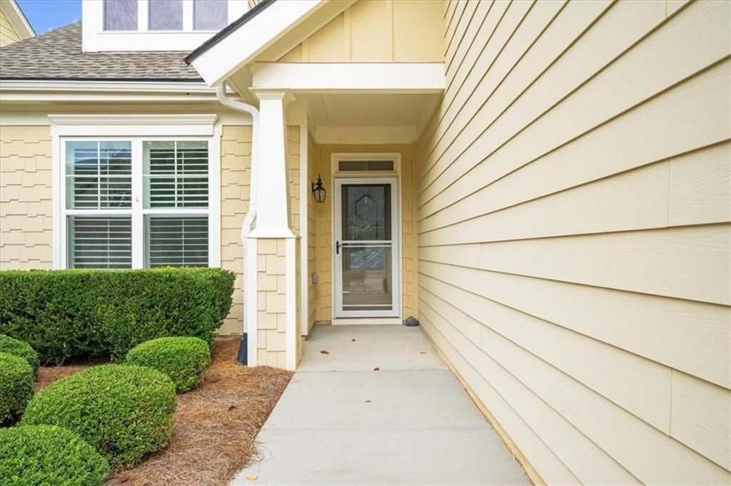 Welcome to the award-winning 55+ community of Cresswind at Lake Lanier. This meticulously maintained Beechwood model showcases pride in ownership and offers a comfortable living experience with 1,654 square feet of thoughtfully designed space. Interior highlights include two spacious bedrooms, two full baths, an open sunroom, a large kitchen and dining areas, and a cozy desk with a granite top and built-in bookshelves. An unfinished bonus room provides flexibility for storage or future customization. The interior features neutral paint colors, natural light that fills the home, complemented by crown molding in the great room and primary bedroom. Beautiful hardwood floors run throughout the living areas, while ceramic tiles enhance the baths and laundry room. Elegant plantation shutters are installed throughout, providing style and privacy. A glass-and-screened storm door allows fresh air when desired and offers views from the living room. An electric fireplace provides a warm and inviting ambiance. Kitchen features include desirable white cabinetry, attractive light granite countertops, stainless-steel appliances—including an electric range also plumbed for gas, a refrigerator, and dishwasher. A generous pantry offers plenty of storage for kitchen essentials. The spacious island provides seating, a double sink, and a sleek stainless-steel dishwasher. The desk nook offers a designated area for office work. The sizable primary bedroom suite is enhanced by a tray ceiling and a ceiling fan, adding comfort and visual interest. The en-suite bath features a walk-in shower, dual vanities with drop-in sinks set on elegant granite counters, a double-door storage closet, and a spacious walk-in closet for ample storage. The secondary bedroom and bath are ideal for providing visitors with convenience and privacy. The home also includes a 444 sq ft unfinished bonus room, perfect for added storage. This space is plumbed for a bath, offering an opportunity to finish it for extra living space as desired. A generous laundry room includes cabinets and a sink for added functionality. Both the washer and dryer are included, ensuring a seamless move-in. Step outside through the retractable screen door to a fully fenced, private backyard oasis. The large, covered patio—originally 8 ft but extended to 14.5 ft—is finished with beautiful granite pavers, stone edging, and river rock for adequate drainage. A natural gas line is installed, making grilling on warm summer nights convenient. Lush landscaping surrounds the backyard, featuring trees, tea olives, hydrangeas, and additional plantings for a vibrant outdoor space. An extended garage offers extra room for vehicles or storage. A new roof was installed in 2024, providing peace of mind for years ahead. The award-winning Cresswind at Lake Lanier boasts a 43,000 sq ft, three-story clubhouse with indoor and outdoor pools, kayaking, fishing, courtesy boat docks, over 120 clubs, arts & crafts room, pickleball, tennis, fitness classes, poker, games, billiards, chorus, concerts, dances, and more! An on-site activities director, property manager, and maintenance team ensure everything runs smoothly. The residents are friendly, welcoming, and eager to include new neighbors in all activities! I have lived at Cresswind at Lake Lanier for 12 years, and I know you will enjoy the Cresswind lifestyle!