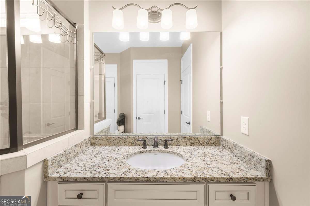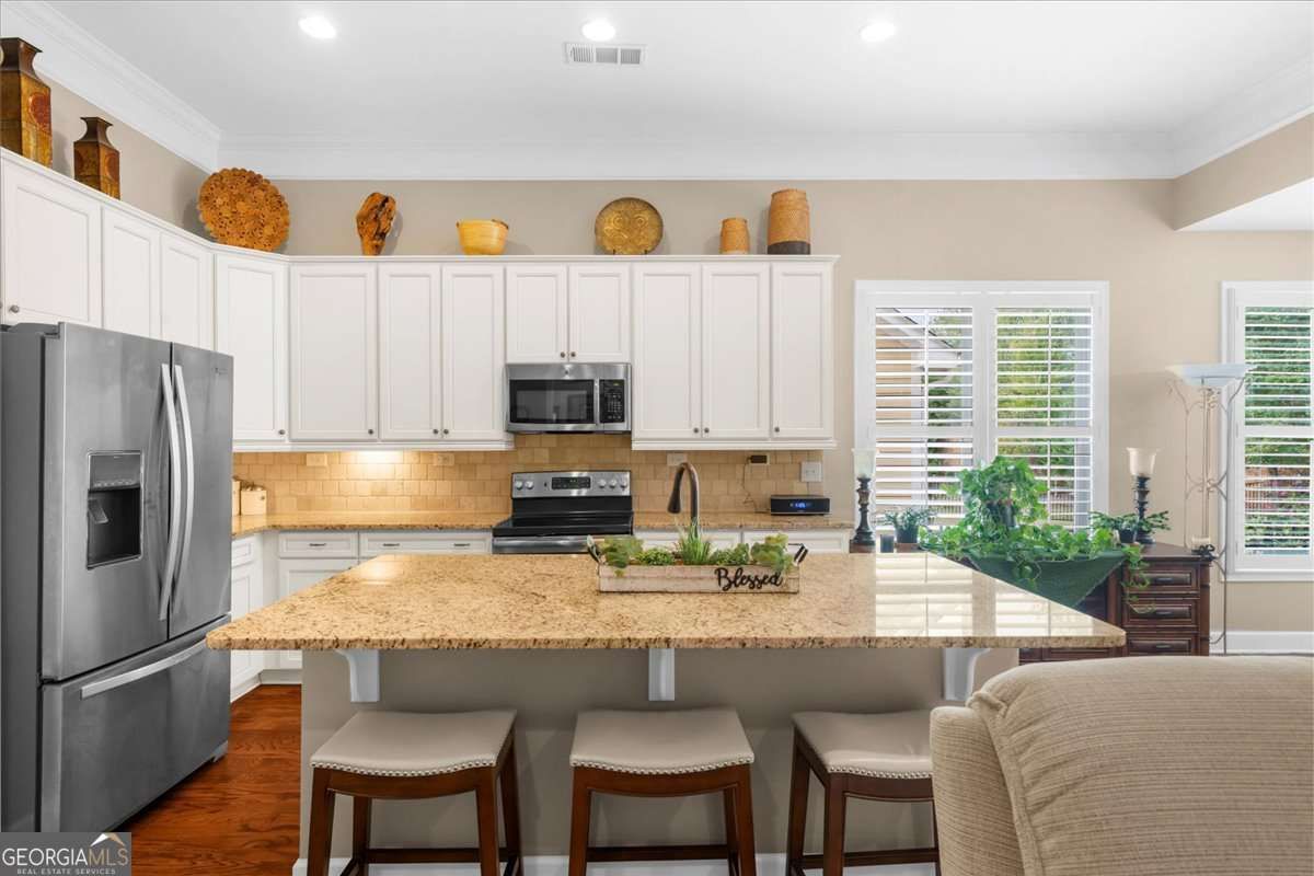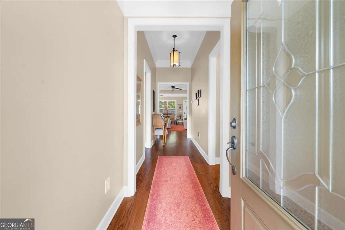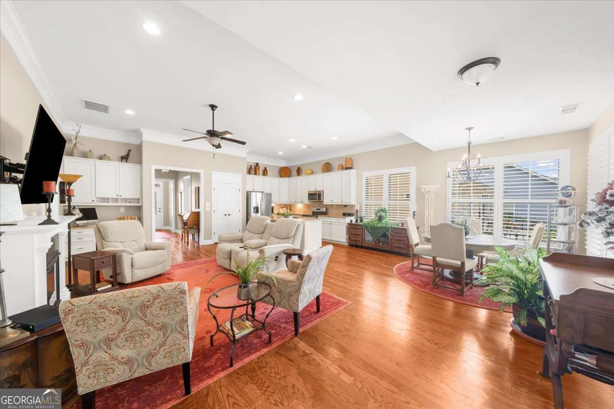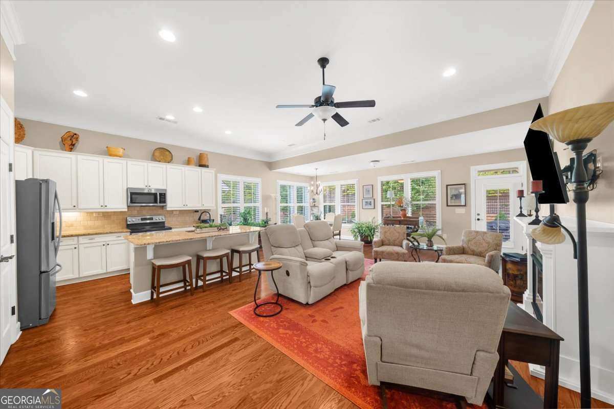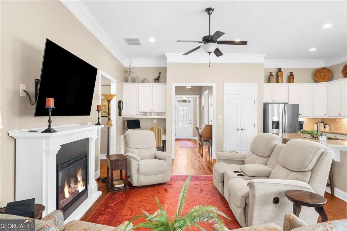 Welcome to the award-winning 55+ community of Cresswind at Lake Lanier. This meticulously maintained Beechwood model showcases pride in ownership and offers a comfortable living experience with 1,654 square feet of thoughtfully designed space. Interior Highlights include two spacious bedrooms, and two full baths, an open sunroom, spacious kitchen and dining areas and a cozy desk with a granite top and built-in bookshelves. An unfinished bonus room offers flexibility for storage or future customization. The interior features neutral paint colors, natural light that fills the home, complemented by crown molding in the great room and primary bedroom. Beautiful hardwood floors run throughout the living areas, while ceramic tiles enhance the baths and laundry room. Elegant plantation shutters are installed throughout, providing style and privacy. A glass and screened storm door let in fresh air when desired and offers views from the living room. An electric fireplace provides a warm and inviting ambiance. Kitchen features include desirable white cabinetry; attractive light granite countertops; stainless-steel appliances, featuring an electric range that is also plumbed for gas, a refrigerator and dishwasher. A spacious pantry provides plenty of storage for kitchen essentials. The spacious island features seating, a double sink, and a sleek stainless-steel dishwasher. The sizable primary bedroom suite is enhanced by a tray ceiling with a ceiling fan, contributing to both comfort and visual interest. The en-suite bath features a walk-in shower, dual vanities with drop-in sinks set in elegant granite counters, a double door storage closet and a spacious walk-in closet for ample storage. The secondary bedroom and bath are ideal for providing convenience and privacy for visitors. The home also features a 444 sq ft unfinished bonus room, perfect for additional storage needs. This space is plumbed for a bath, offering the opportunity to finish it for extra living space as desired. A generous laundry room includes cabinets and a sink for added functionality. Both the washer and dryer are included with the property, ensuring a seamless move-in experience. Step outside through the retractable screen door to a fully fenced, private backyard oasis. The large, covered patio, originally 8 ft, has been extended to 14.5 ft and is finished with beautiful granite pavers, stone edging, and river rock for effective drainage. A natural gas line is installed, making grilling on warm summer nights convenient and enjoyable. Lush landscaping surrounds the backyard, featuring trees, tea olives, hydrangeas, and additional plantings for a vibrant and inviting outdoor space. An extended garage provides extra space for vehicles or storage. A new roof was installed in 2024, ensuring peace of mind for years to come. The award-winning Cresswind at Lake Lanier boasts a 43,000 sq ft, 3-story clubhouse with indoor and outdoor pools, kayaking, fishing, courtesy boat docks, over 120 clubs, arts & crafts room, pickleball, tennis, indoor & outdoor pools, gym, dance & fitness classes, poker, games, billiards, plays, chorus, concerts, dances and more! An on-site activities director, property manager and maintenance crew keep everything running smoothly. The residents are welcoming, friendly and anxious to include new neighbors in all the activities! I have lived at Cresswind at Lake Lanier for 12 years and I know you will enjoy the Cresswind lifestyle!