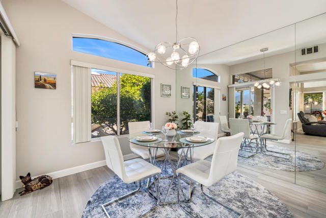 55+ Sun City Palm Desert. Del Webb's 'Best Bang for your Buck' active retirement community in the desert. Spectacular peek-a-boo golf course and mountain views!! Super low HOA dues, golf courses, pools, fitness centers, tennis, pickle ball etc. This popular 2 bedroom/2 bathroom Gorham model is located near the Mountain View Clubhouse, close to the dog park and walking area. The home features wood-like' porcelain tile throughout, high ceilings, transom windows for extra natural light, special architectural details. Upgrades include motorized remote control drop shades on patio, new furnace and AC coil and control board, landscape lighting in front and back, new water heater, new kitchen appliances, interior and exterior paint, master bedroom and bath remodel, patio extension, and garage mini-split. The beautiful curb appeal has easy maintenance desert landscaping and lighting. Inside, the remodeled kitchen features quartz counters with glass tile backsplash, white cabinets with hardware, extra pantry with plenty of storage, newer appliances and gas cooktop, recessed lighting and amazing skylight, and eat in breakfast bar and dining area with sliding door to the patio. The custom mirrored wall expands the views in every direction! The living room has a custom wall and built-in media cabinet, upgraded fan/light combo and views to the patio. The master suite has upgraded fan/light, vertical blinds, closet #1 with 2-level design, window with a view, full bath includes quartz counter, double vanity, custom tile shower with frameless glass shower enclosure and decorative tile, new toilet, upper LED lighting, and closet #2 with 2-level design. The guest bedroom and bath are on the opposite side of the home for maximum privacy, bath is has upgraded quartz counter and cabinet and glass surround at the tub/shower. The laundry was moved to the garage opening the space to a small office/hobby room and storage area. The garage has washer and dryer and a new mini-split AC and built-ins. Now for the BEST PART!!! The serenity of the private backyard with stunning landscape lighting and multiple seating and dining areas complete with peek-a-boo mountain and golf course views and the tranquil sounds of the fountain. This home is perfect for entertaining family and friends for the holidays or simply relaxing with a cold beverage after a day on the golf course or tennis courts. 'Buy Where you Love to Play...Sun City Pal