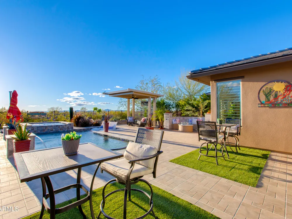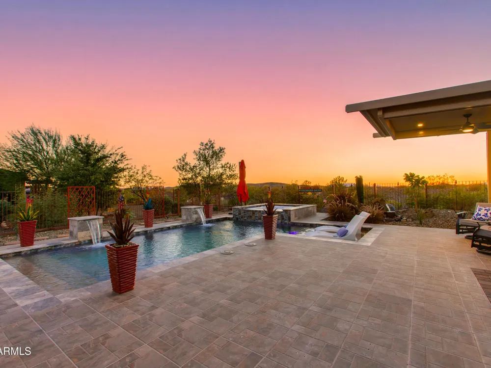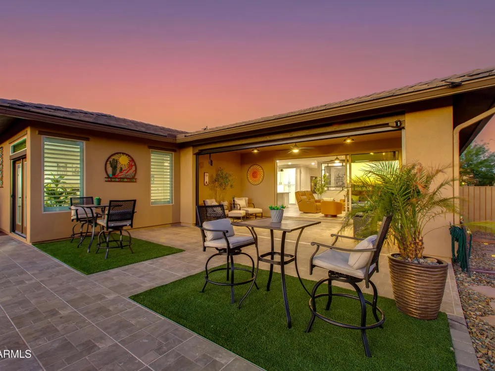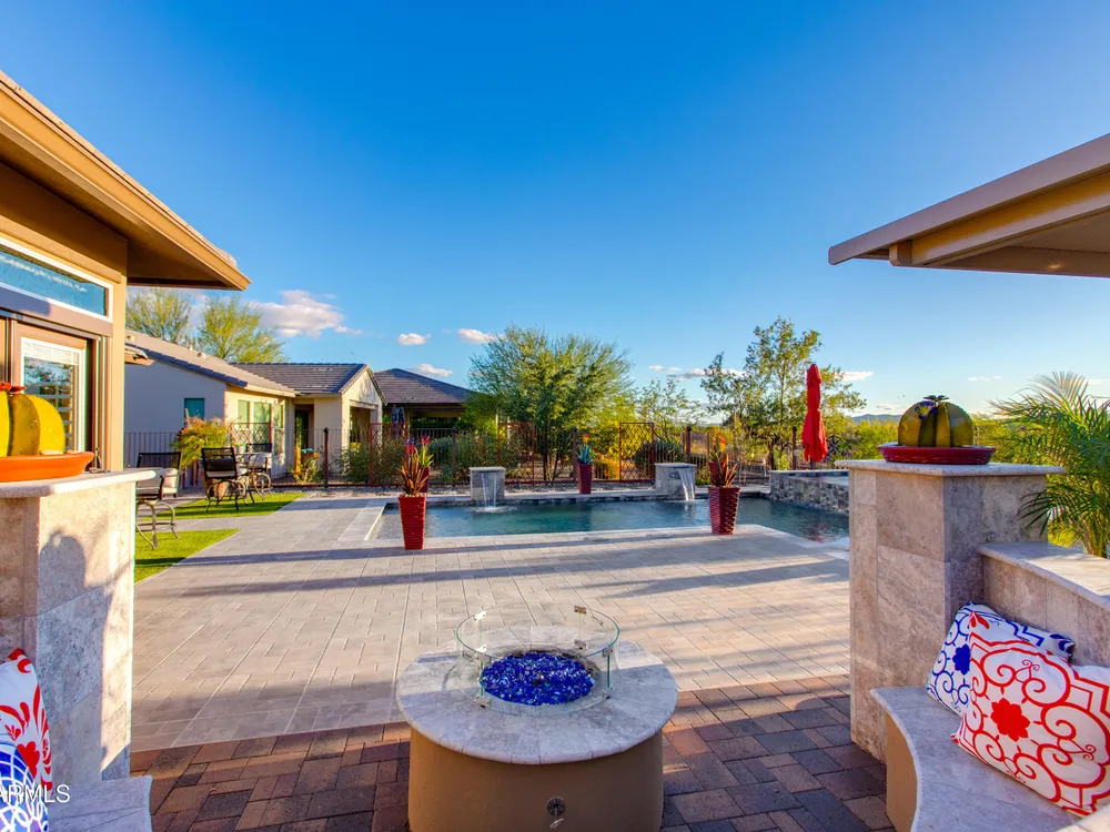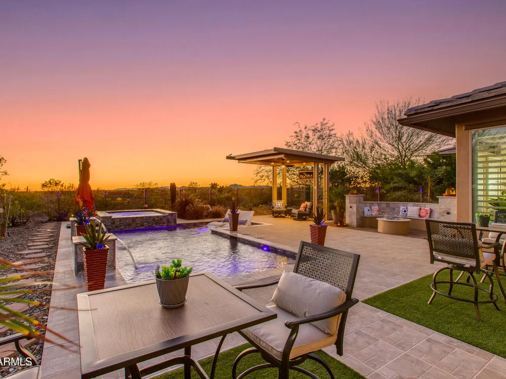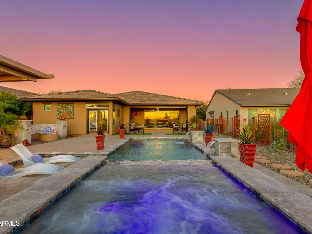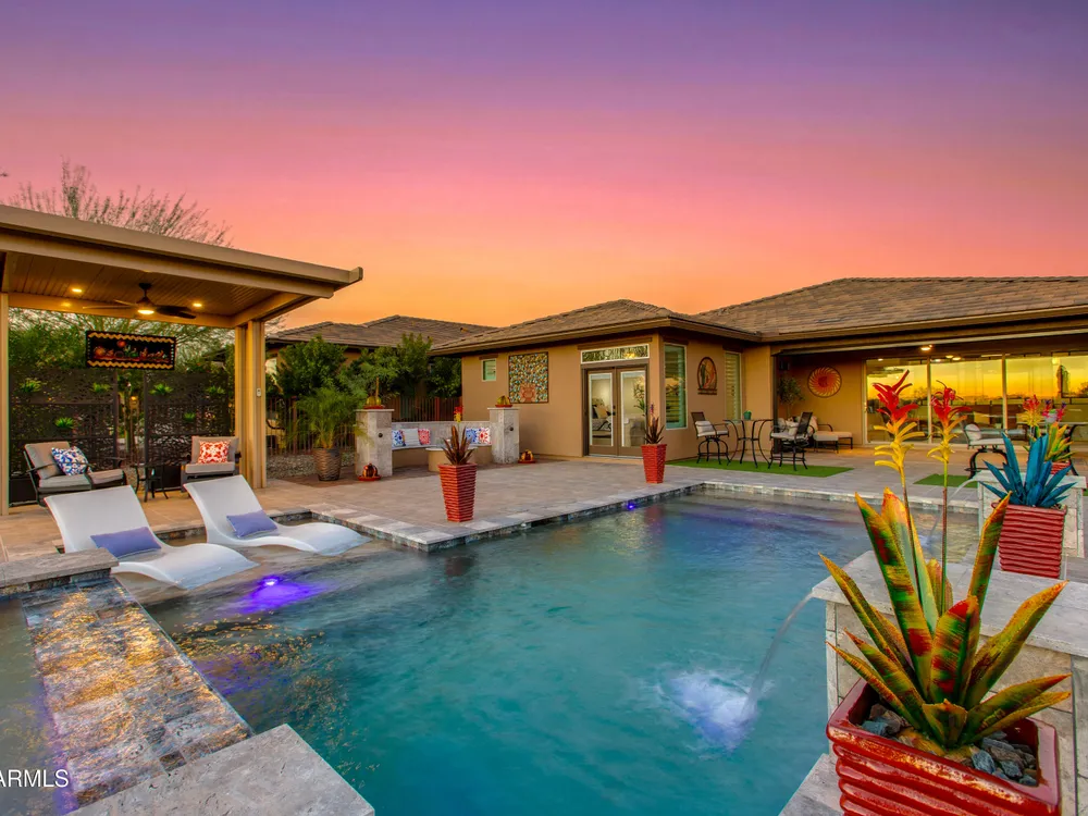 Turnkey opportunity! This beautifully remodeled Shea-built Cypress model comes fully furnished and includes a golf cart, making it truly move-in ready. Step outside to your custom-designed System pool and spa featuring a travertine surround, water features, and a spill-edge design—perfect for relaxing or entertaining while enjoying breathtaking Arizona sunsets. Upgrades abound inside and out, including Exterior Rhino Shield paint, fresh interior paint, and a LifeSource Whole-House Water Filtration System servicing every faucet, shower, and even the pool and spa! Enjoy outdoor living at its finest under the lighted pergola with ceiling fan, or beside the firepit with built-in half-moon seating, and surrounded by upgraded landscaping, including a custom fountain. The power shades enclose the patio to give you an additional serene outdoor living space looking out to the manicured yard, pool, and the sunset view. Inside, you'll find tile flooring throughout, custom glass office dividers with integrated lighting, French doors into the den, crown molding, a fireplace insert, dry bar, surround sound (inside & out), and motorized sunshades. Additional touches include epoxy-sealed garage floors, paver sealant refresh, and a custom front door glass insert with a COOL retractable screen. This home exudes comfort, quality, and style - a rare turnkey retreat ready to enjoy in Wickenburg Ranch!