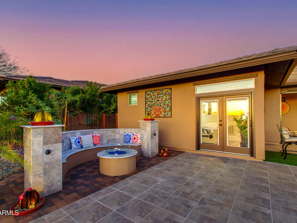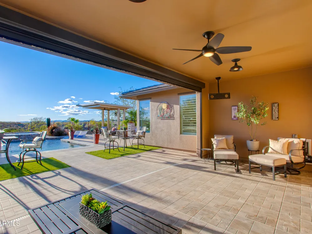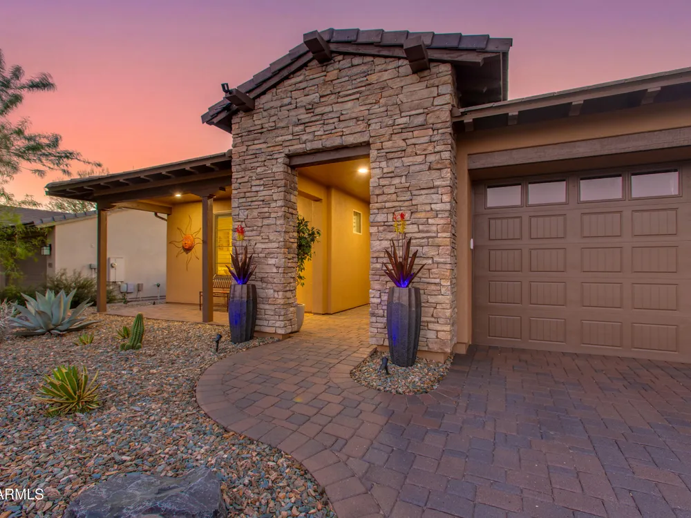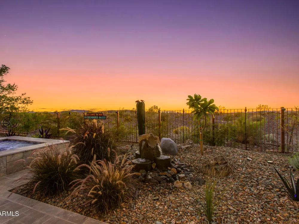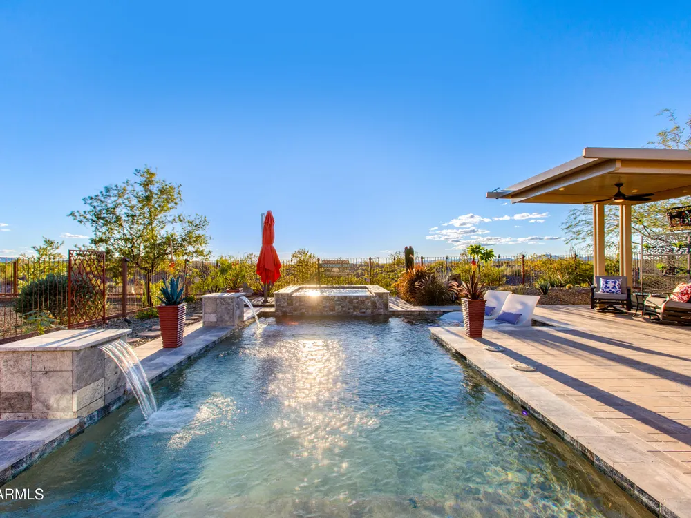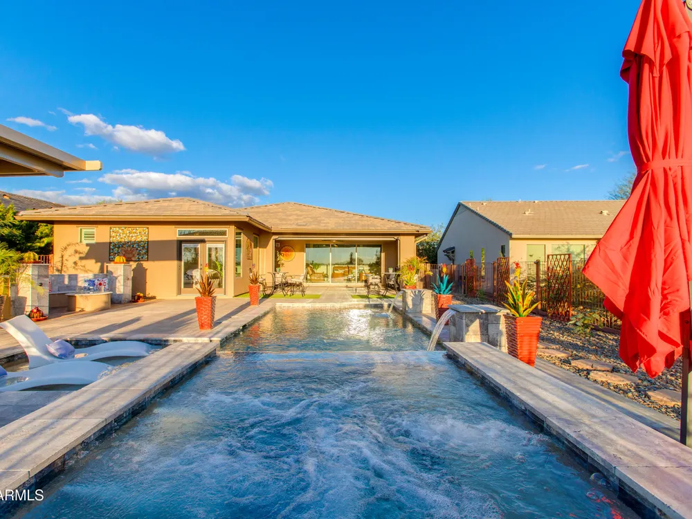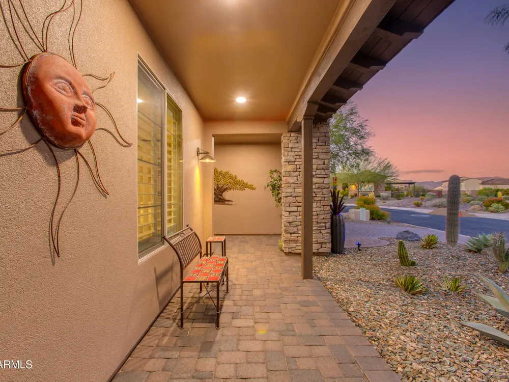 Turnkey opportunity! This beautifully remodeled Shea-built Cypress model comes fully furnished and includes a golf cart, making it truly move-in ready. Step outside to your custom-designed System pool and spa featuring a travertine surround, water features, and a spill-edge design—perfect for relaxing or entertaining while enjoying breathtaking Arizona sunsets. Upgrades abound inside and out, including Exterior Rhino Shield paint, fresh interior paint, and a LifeSource Whole-House Water Filtration System servicing every faucet, shower, and even the pool and spa! Enjoy outdoor living at its finest under the lighted pergola with ceiling fan, or beside the firepit with built-in half-moon seating, and surrounded by upgraded landscaping, including a custom fountain. The power shades enclose the patio to give you an additional serene outdoor living space looking out to the manicured yard, pool, and the sunset view. Inside, you'll find tile flooring throughout, custom glass office dividers with integrated lighting, French doors into the den, crown molding, a fireplace insert, dry bar, surround sound (inside & out), and motorized sunshades. Additional touches include epoxy-sealed garage floors, paver sealant refresh, and a custom front door glass insert with a COOL retractable screen. This home exudes comfort, quality, and style - a rare turnkey retreat ready to enjoy in Wickenburg Ranch!