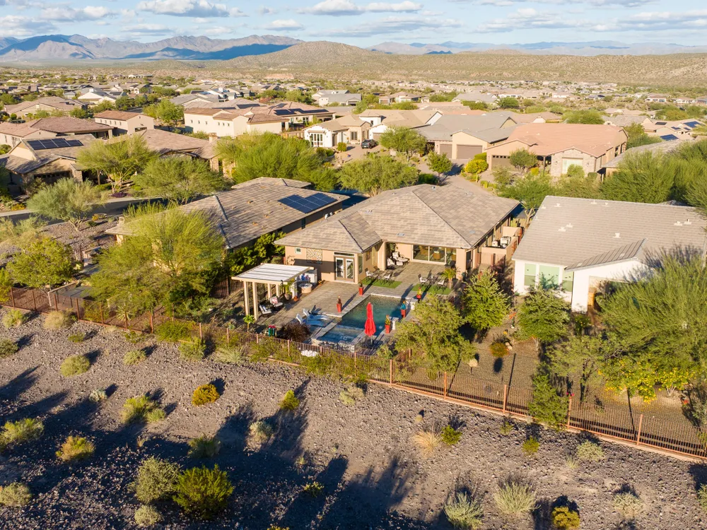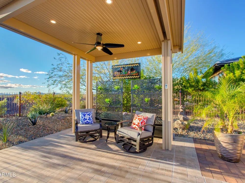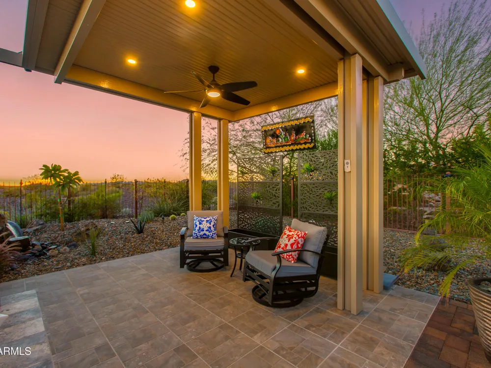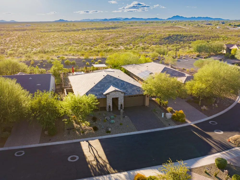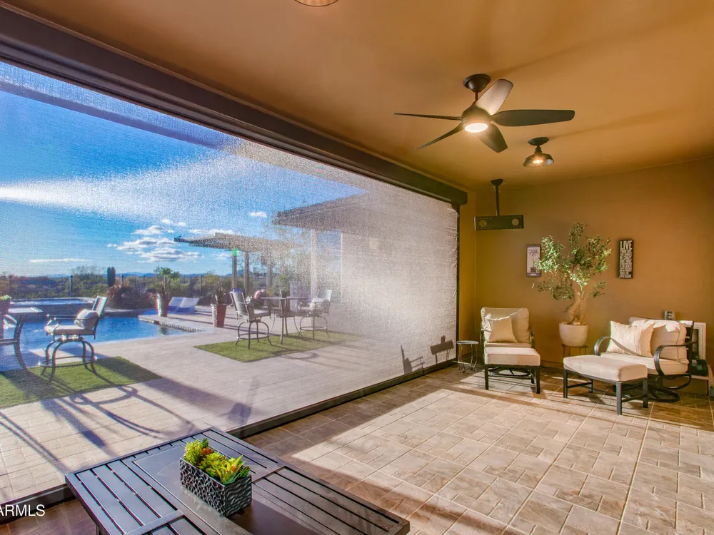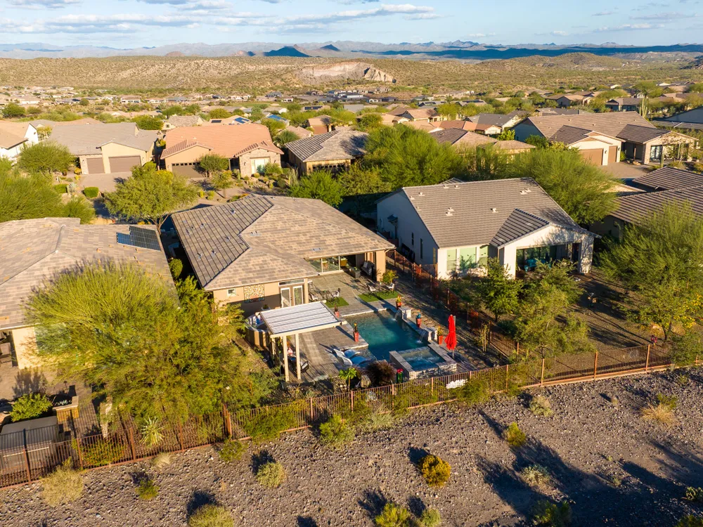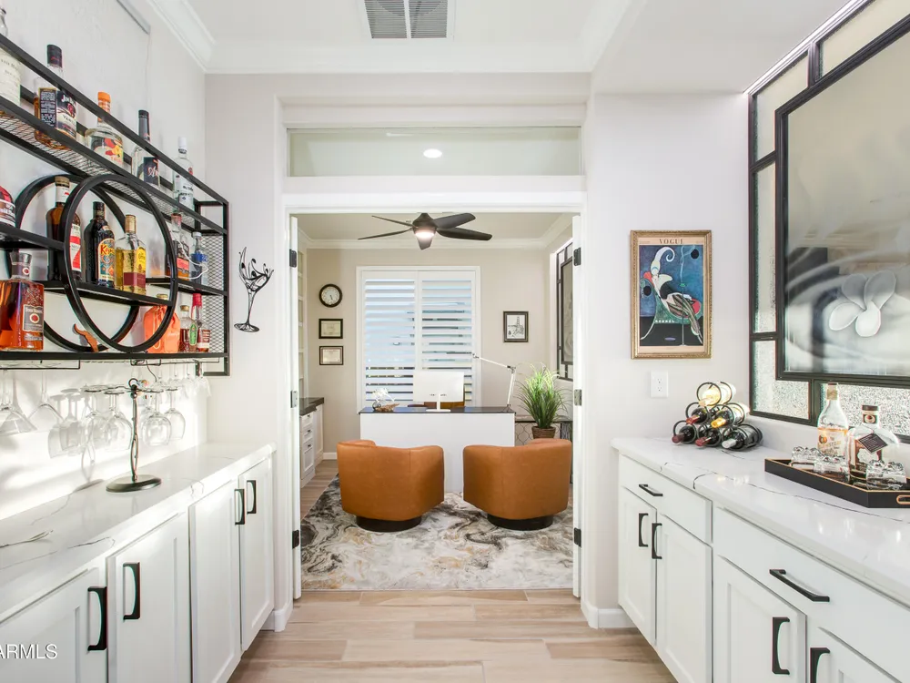 Turnkey opportunity! This beautifully remodeled Shea-built Cypress model comes fully furnished and includes a golf cart, making it truly move-in ready. Step outside to your custom-designed System pool and spa featuring a travertine surround, water features, and a spill-edge design—perfect for relaxing or entertaining while enjoying breathtaking Arizona sunsets. Upgrades abound inside and out, including Exterior Rhino Shield paint, fresh interior paint, and a LifeSource Whole-House Water Filtration System servicing every faucet, shower, and even the pool and spa! Enjoy outdoor living at its finest under the lighted pergola with ceiling fan, or beside the firepit with built-in half-moon seating, and surrounded by upgraded landscaping, including a custom fountain. The power shades enclose the patio to give you an additional serene outdoor living space looking out to the manicured yard, pool, and the sunset view. Inside, you'll find tile flooring throughout, custom glass office dividers with integrated lighting, French doors into the den, crown molding, a fireplace insert, dry bar, surround sound (inside & out), and motorized sunshades. Additional touches include epoxy-sealed garage floors, paver sealant refresh, and a custom front door glass insert with a COOL retractable screen. This home exudes comfort, quality, and style - a rare turnkey retreat ready to enjoy in Wickenburg Ranch!