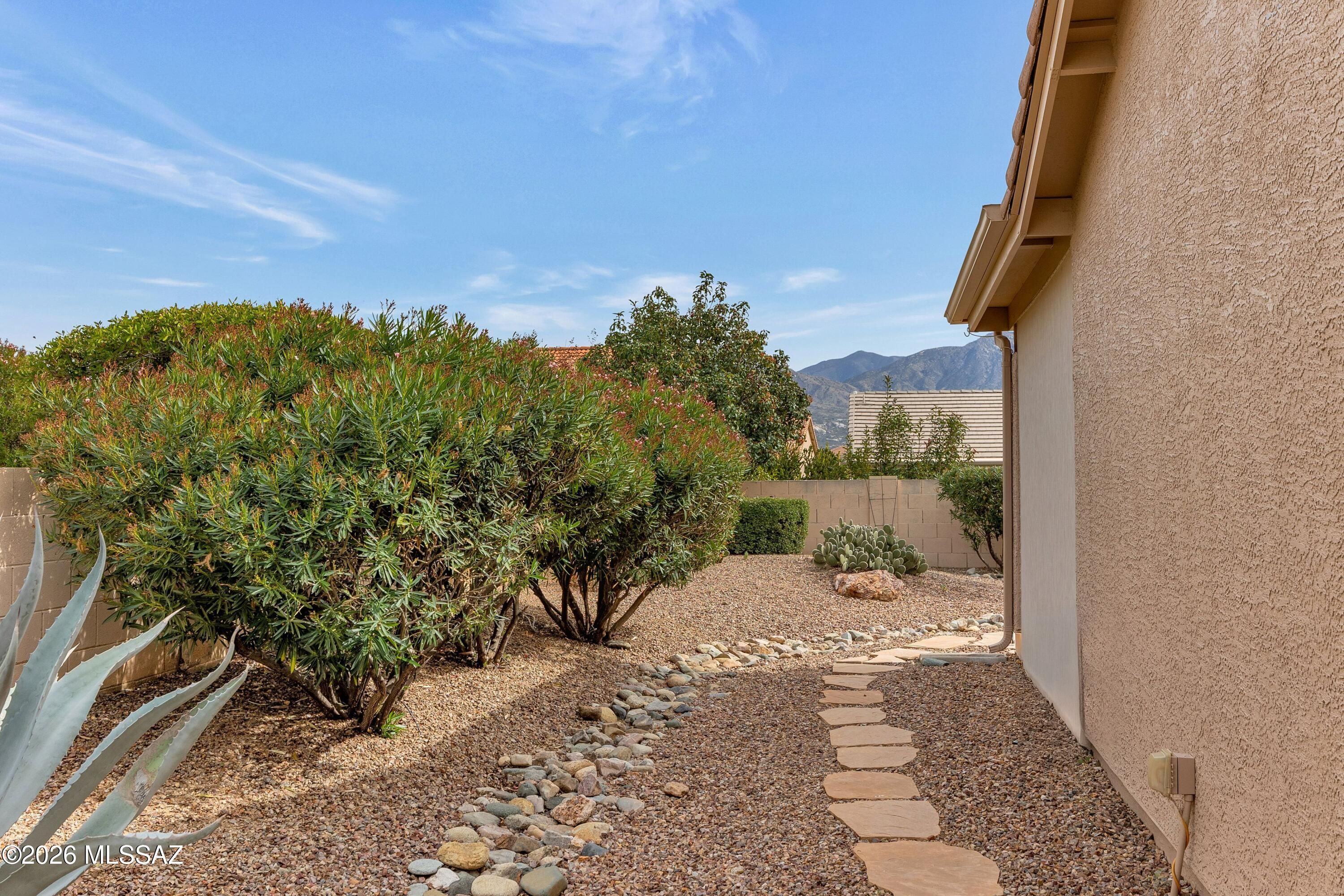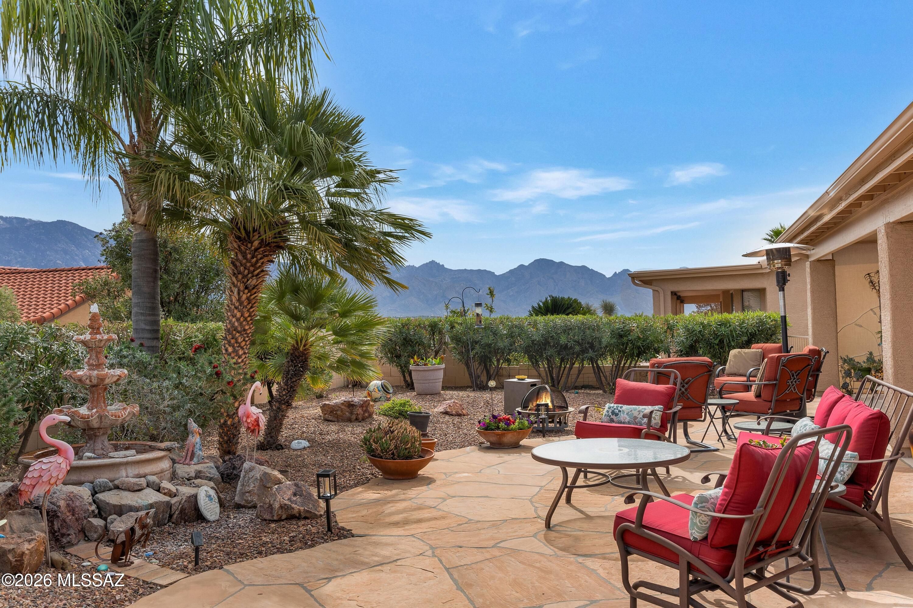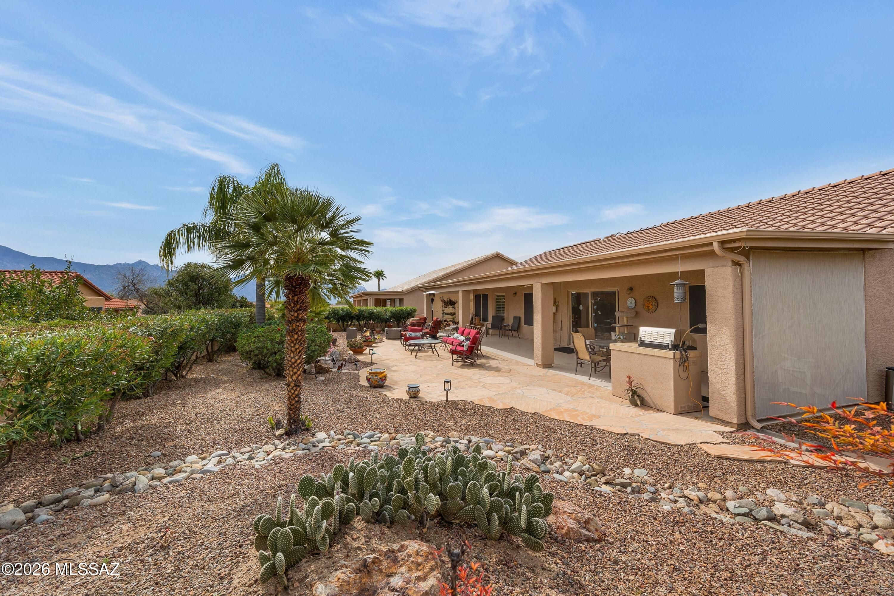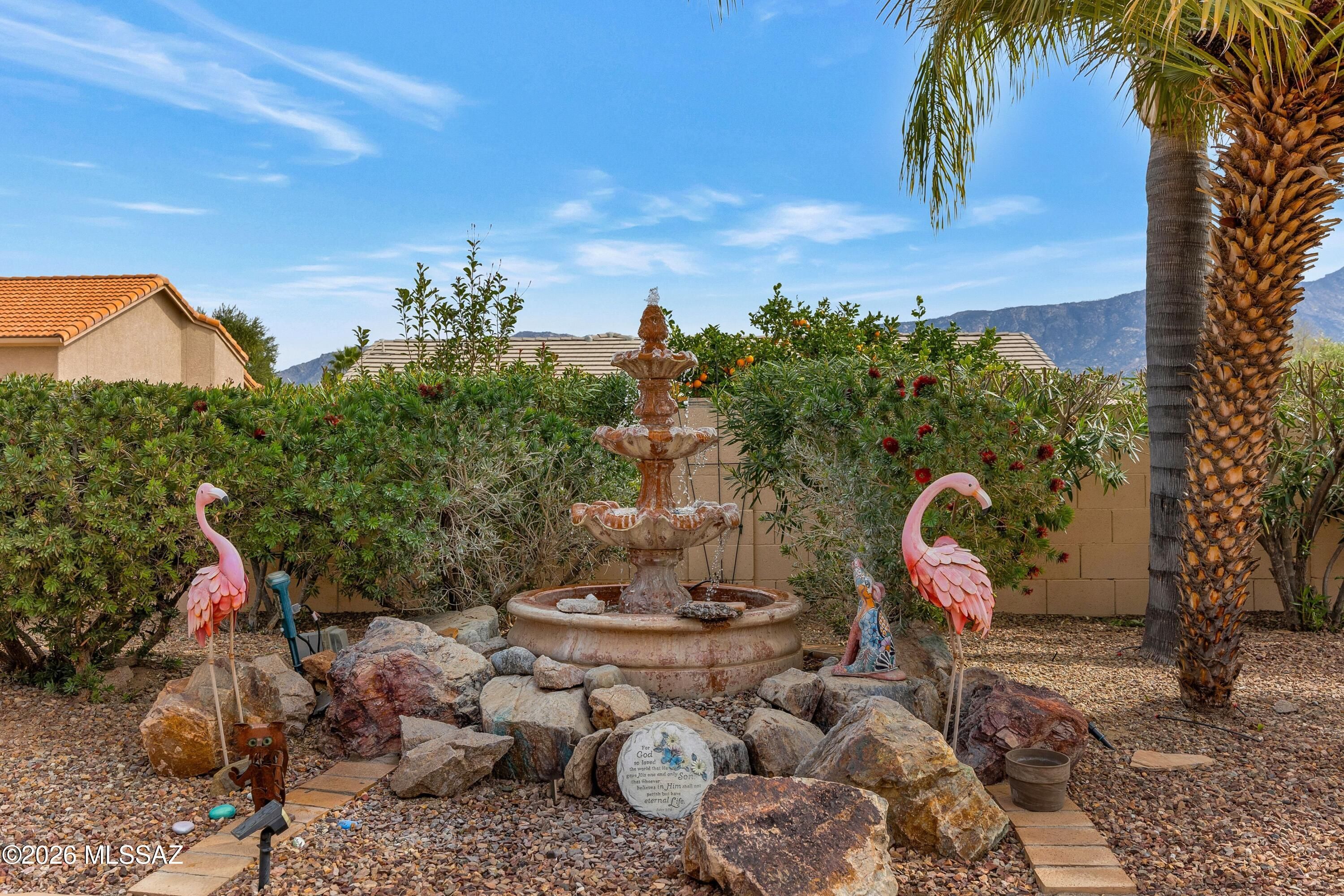 Expanded Laredo with Mountain Views! Welcoming front courtyard. Spacious great room features built-in entertainment wall & slider to patio. Kitchen offers granite counters, black stainless appliances, cabinets with slide-outs, island, & dining area. Owner's suite with bay window. En Suite Bathroom has walk-in shower, & walk-in closet. Den/office with French doors. Guest bedroom with closet & nearby guest bath. Laundry room with W/D, pantry, & cabinets. Whole-house water filtration system. Luxury vinyl plank flooring in great room, den & owner's suite. Roof underlayment & irrigation system replaced in 2023. Extended 2-car garage with 2020 HVAC, 2025 W/H, sink, cabinets, & epoxy floor. Covered patio, built-in BBQ, water fountain, lovely landscaping, lemon tree, gated yard, & mountain views!