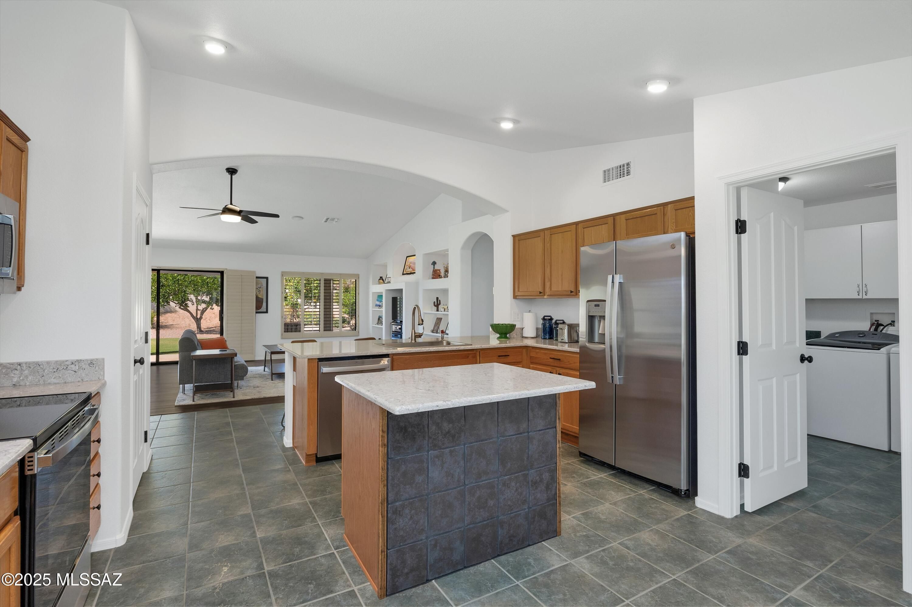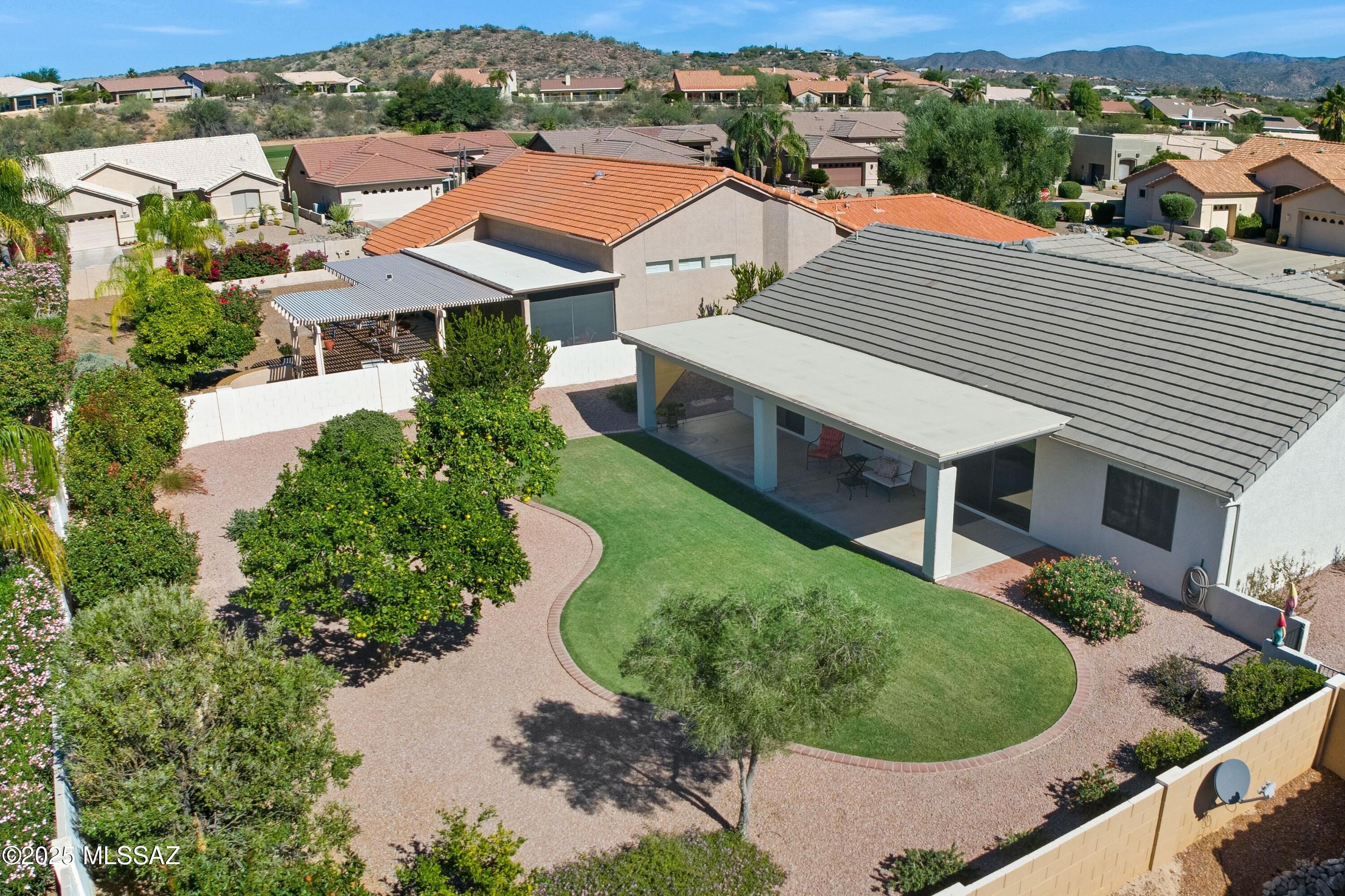 Live the SaddleBrooke lifestyle in this popular Laredo model, perfectly located within walking distance of Mountain View Clubhouse and amenities. Bright and inviting, this home features an open great room, den and split bedroom floorplan. Enjoy brand-new kitchen appliances, new counters, an extra-large SS sink with cabinet pullouts, plus fresh interior paint and new bedroom carpet. Plantation shutters and ceiling fans add comfort throughout. Relax on the covered patio overlooking a private backyard with lush landscaping and numerous citrus trees. HVAC new in 2018 and garage refrigerator included.