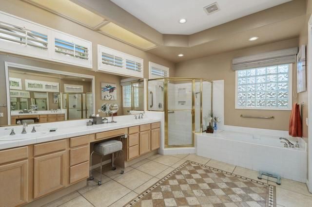This San Remo model home is situated in Sun City Palm Desert, an exclusive guard-gated golf course community. This 3-bedroom, 2.5-bathroom residence offers 2,432 square feet of living space and is positioned on an elevated lot offering stunning views of the golf course and mountains. The property features a spacious covered patio ideal for enjoying mountain vistas and sunsets. Enter this home through double doors that lead into an interior with soaring ceilings, creating a spacious and inviting atmosphere suitable for relaxation and entertainment. The family room includes a cozy fireplace, enhancing the home's warmth. The remodeled kitchen boasts granite countertops, a breakfast bar, and ample cabinetry. The primary suite is a luxurious retreat, complete with a spa-like bathroom offering dual sinks, a separate shower, a soaking tub, and a generously sized walk-in closet. Throughout the home, plantation shutters enhance both style and functionality. In 2023, the HVAC system and water heater were replaced. The property also offers a two-car garage plus a dedicated golf cart garage. Don't miss this exceptional opportunity to own a home on the golf course in Sun City.