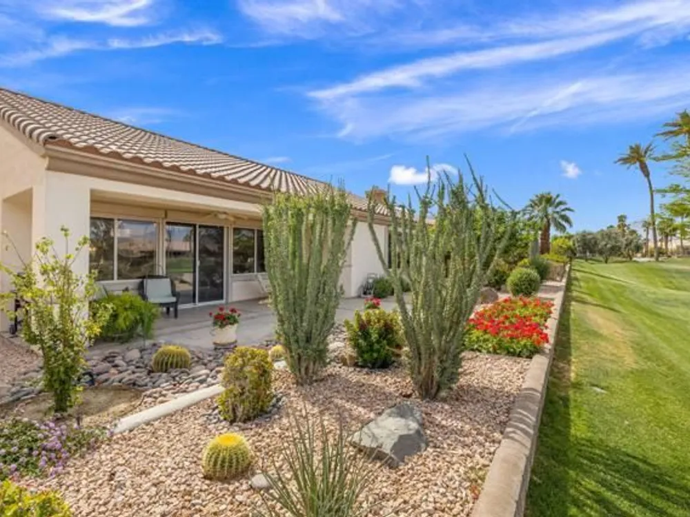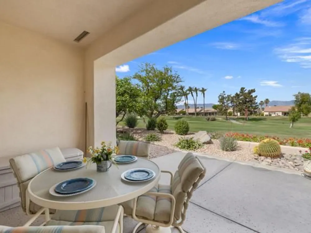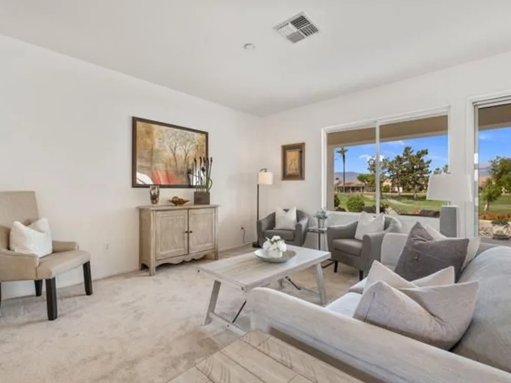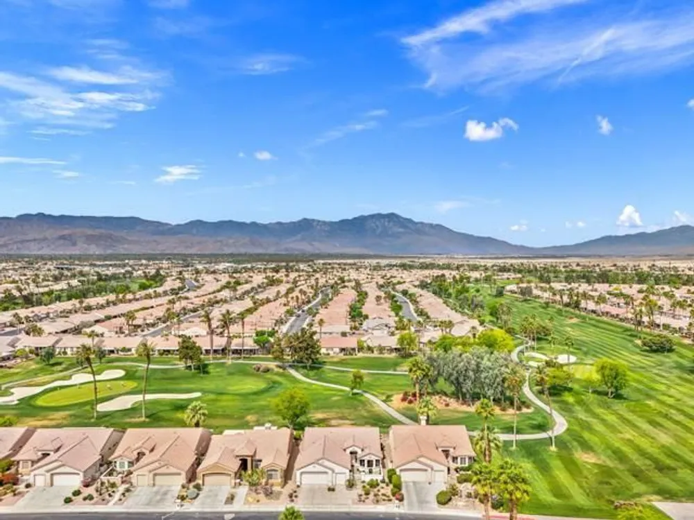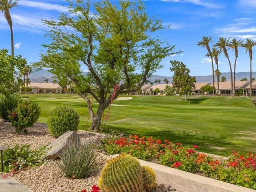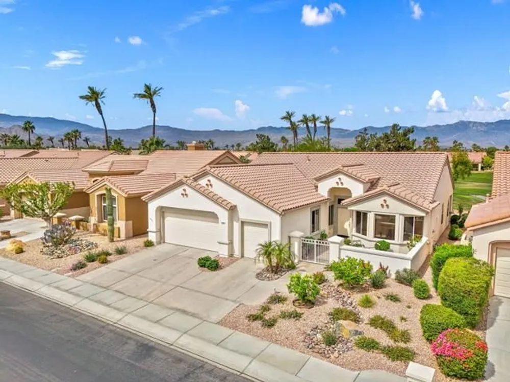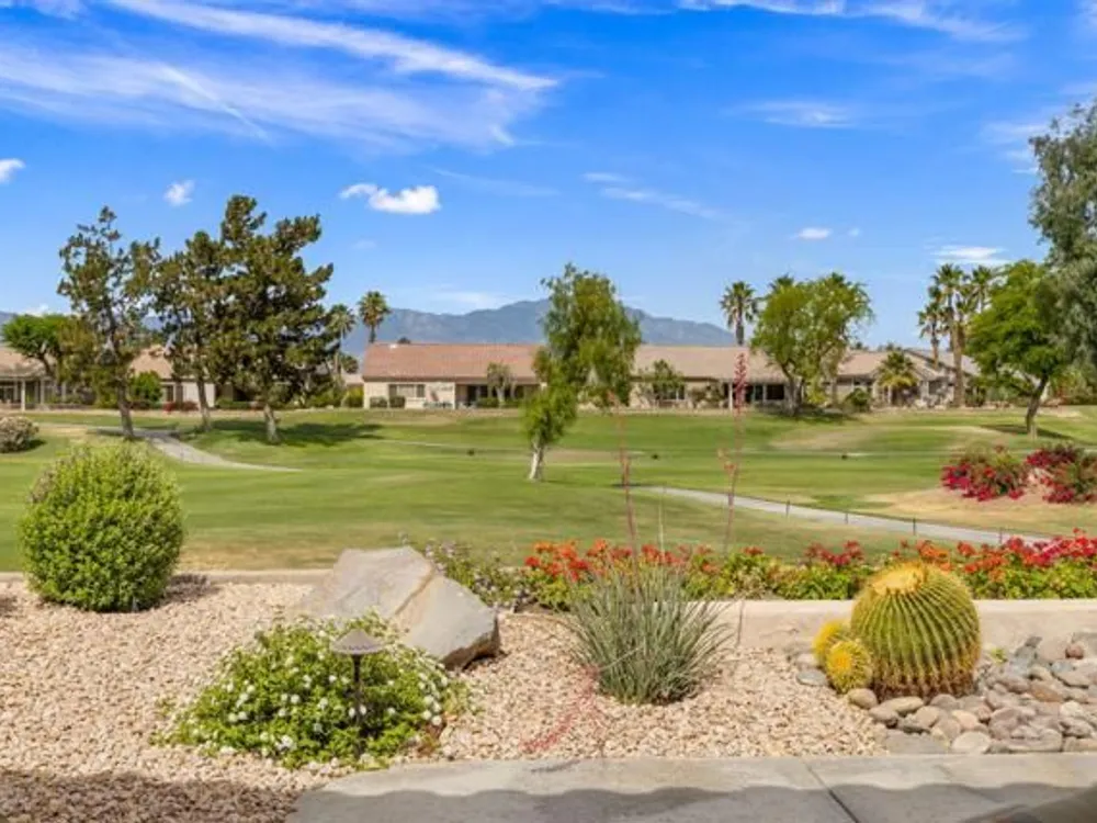 Located in the best 55+ community in the valley, Sun City Palm Desert, this St. Croix model is the most popular. It has 2 bedrooms, 2 baths, and a den, and an extra flex room with a Murphy bed. It has new carpet and new paint inside and out. The open floor plan allows fabulous golf course and mountain views from almost every room. The kitchen has a bay window, with a kitchenette, an island, and a peninsula bar. It has a view of the dining room, living room, and the golf course. The large master bedroom has an amazing view and a bathroom with a dual vanity, walk-in closet, walk-in shower, and a separate toilet room. The guest bedroom is adjacent to the 2nd full bathroom, and is very inviting. The home also has a den and ''hobby room'' for an office, or extra guest room. The laundry includes the washer and dryer, and it leads to the 2-car garage, and a separate golf cart garage. The courtyard and backyard have beautiful, easily maintained landscaping. The 180-degree view of the lush par 3, 3rd hole, of the Santa Rosa golf course and the gorgeous mountain range in the distance. SUN CITY PALM DESERT IS ALL ABOUT LIFESTYLE!! It has many clubs, activities, amenities, and low HOA dues. Play at 2 championship 18-hole golf courses and practice facilities, pickle ball, tennis, softball, bocci ball, an 18-hole miniature golf course, an honor library, arts and crafts, a ballroom for special entertainment, and 4 saltwater pools kept at 87 degrees with hot tubs. Enjoy 2 great restaurants, a martini/coffee bar, and even a post office. There is a newly renovated classy indoor/outdoor bar with fire tables to enjoy the awesome views and our beautiful desert weather. Don't miss this one.