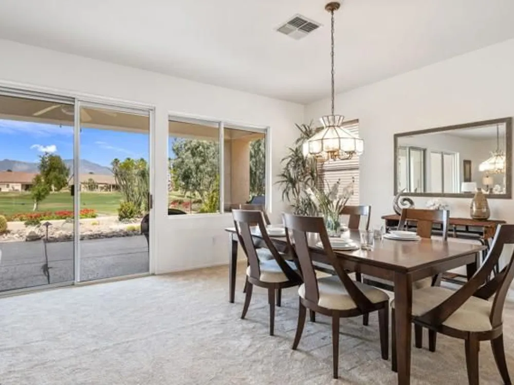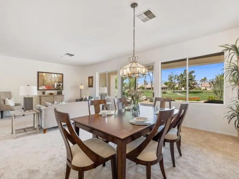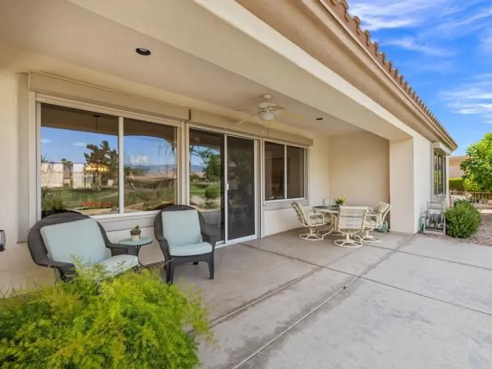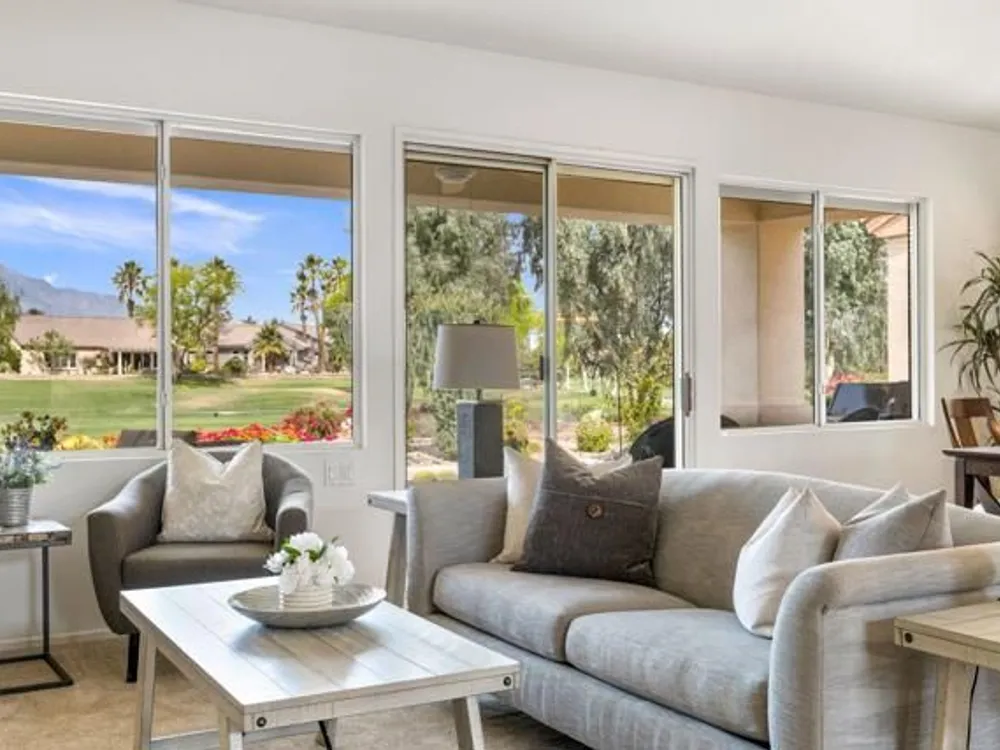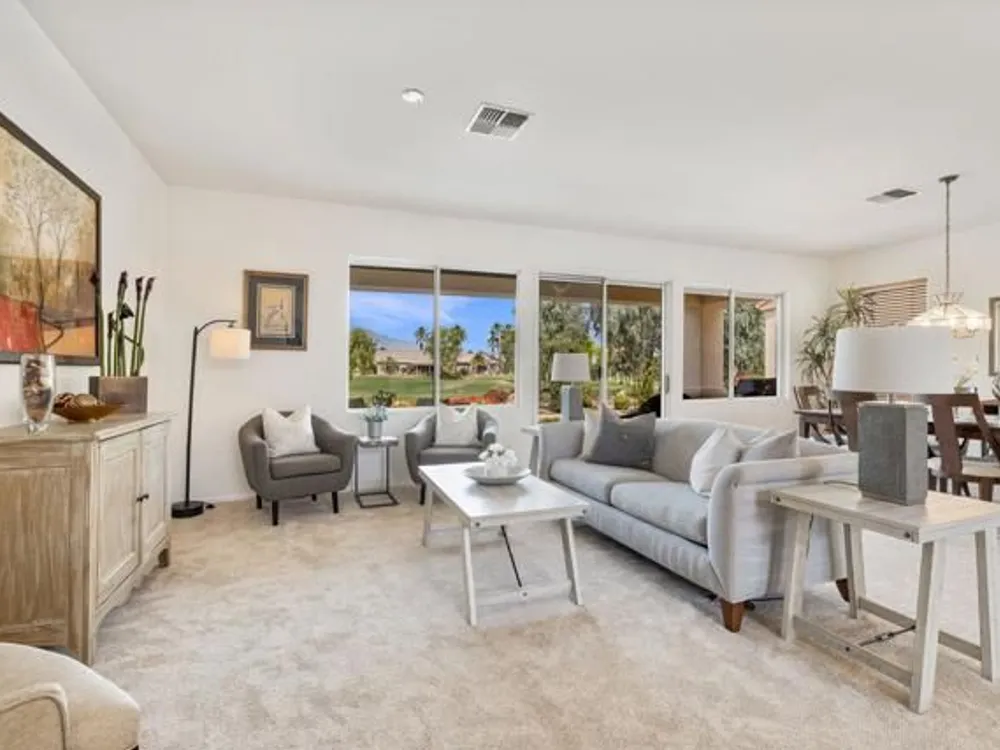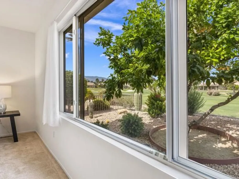 Located in the best 55+ community in the valley, Sun City Palm Desert, this St. Croix model is the most popular. It has 2 bedrooms, 2 baths, and a den, and an extra flex room with a Murphy bed. It has new carpet and new paint inside and out. The open floor plan allows fabulous golf course and mountain views from almost every room. The kitchen has a bay window, with a kitchenette, an island, and a peninsula bar. It has a view of the dining room, living room, and the golf course. The large master bedroom has an amazing view and a bathroom with a dual vanity, walk-in closet, walk-in shower, and a separate toilet room. The guest bedroom is adjacent to the 2nd full bathroom, and is very inviting. The home also has a den and ''hobby room'' for an office, or extra guest room. The laundry includes the washer and dryer, and it leads to the 2-car garage, and a separate golf cart garage. The courtyard and backyard have beautiful, easily maintained landscaping. The 180-degree view of the lush par 3, 3rd hole, of the Santa Rosa golf course and the gorgeous mountain range in the distance. SUN CITY PALM DESERT IS ALL ABOUT LIFESTYLE!! It has many clubs, activities, amenities, and low HOA dues. Play at 2 championship 18-hole golf courses and practice facilities, pickle ball, tennis, softball, bocci ball, an 18-hole miniature golf course, an honor library, arts and crafts, a ballroom for special entertainment, and 4 saltwater pools kept at 87 degrees with hot tubs. Enjoy 2 great restaurants, a martini/coffee bar, and even a post office. There is a newly renovated classy indoor/outdoor bar with fire tables to enjoy the awesome views and our beautiful desert weather. Don't miss this one.