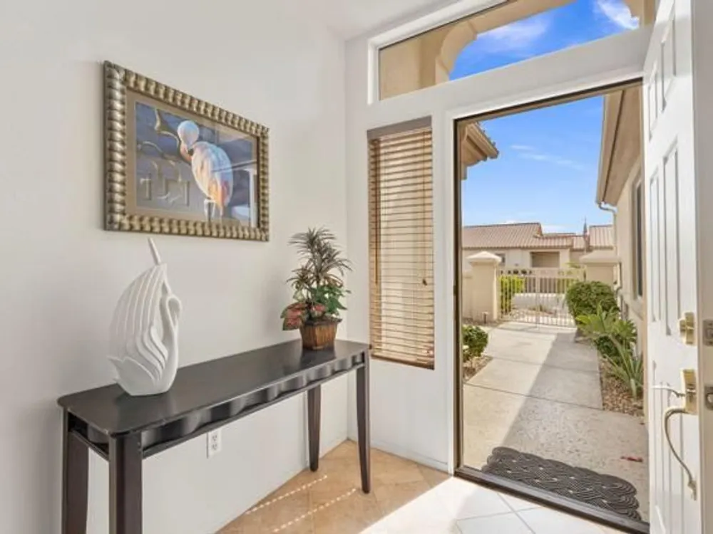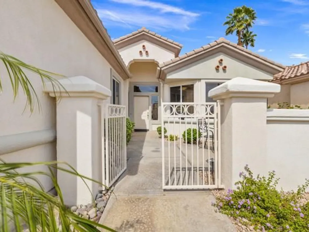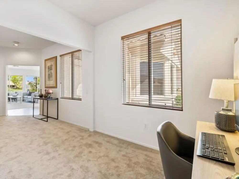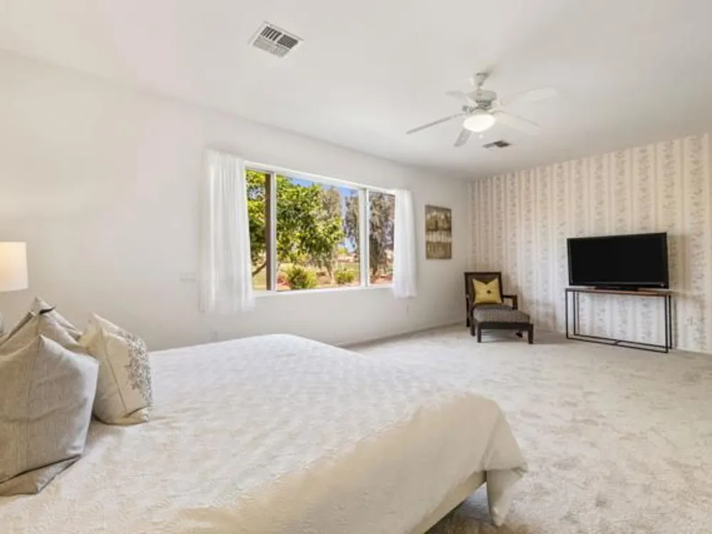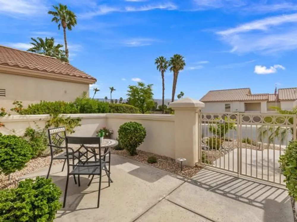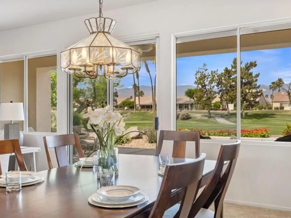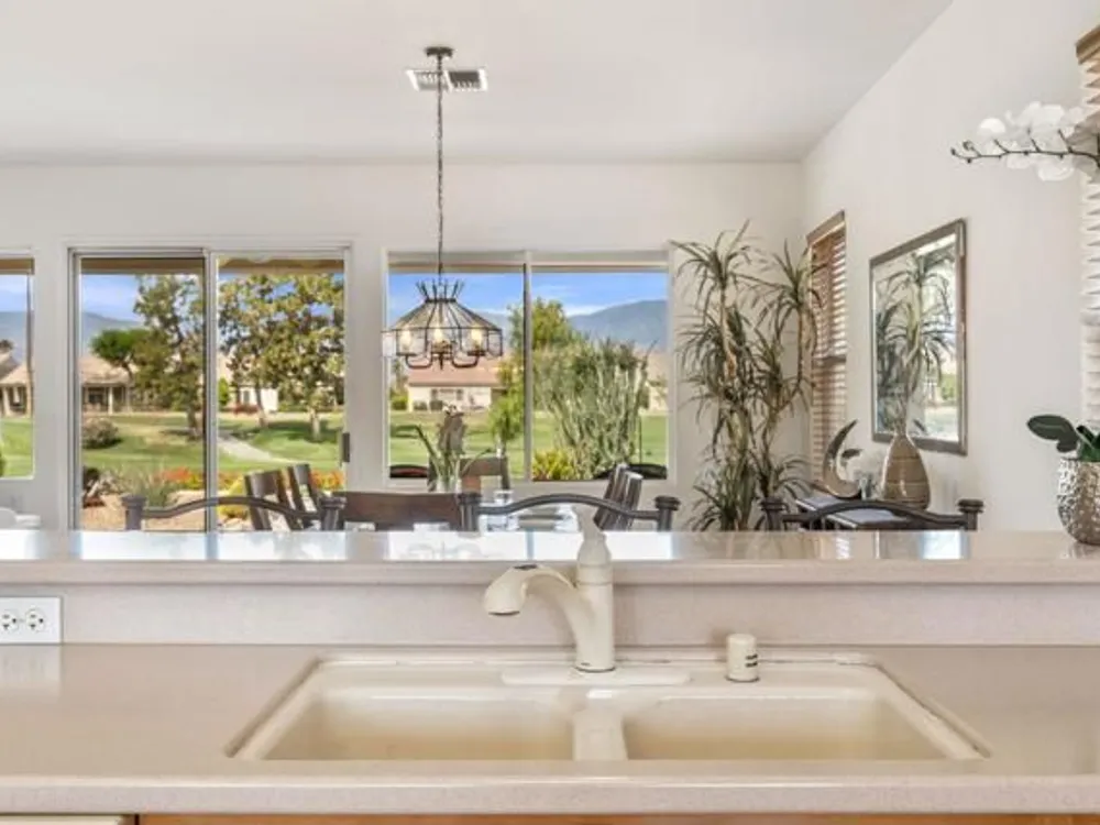 Located in the best 55+ community in the valley, Sun City Palm Desert, this St. Croix model is the most popular. It has 2 bedrooms, 2 baths, and a den, and an extra flex room with a Murphy bed. It has new carpet and new paint inside and out. The open floor plan allows fabulous golf course and mountain views from almost every room. The kitchen has a bay window, with a kitchenette, an island, and a peninsula bar. It has a view of the dining room, living room, and the golf course. The large master bedroom has an amazing view and a bathroom with a dual vanity, walk-in closet, walk-in shower, and a separate toilet room. The guest bedroom is adjacent to the 2nd full bathroom, and is very inviting. The home also has a den and ''hobby room'' for an office, or extra guest room. The laundry includes the washer and dryer, and it leads to the 2-car garage, and a separate golf cart garage. The courtyard and backyard have beautiful, easily maintained landscaping. The 180-degree view of the lush par 3, 3rd hole, of the Santa Rosa golf course and the gorgeous mountain range in the distance. SUN CITY PALM DESERT IS ALL ABOUT LIFESTYLE!! It has many clubs, activities, amenities, and low HOA dues. Play at 2 championship 18-hole golf courses and practice facilities, pickle ball, tennis, softball, bocci ball, an 18-hole miniature golf course, an honor library, arts and crafts, a ballroom for special entertainment, and 4 saltwater pools kept at 87 degrees with hot tubs. Enjoy 2 great restaurants, a martini/coffee bar, and even a post office. There is a newly renovated classy indoor/outdoor bar with fire tables to enjoy the awesome views and our beautiful desert weather. Don't miss this one.