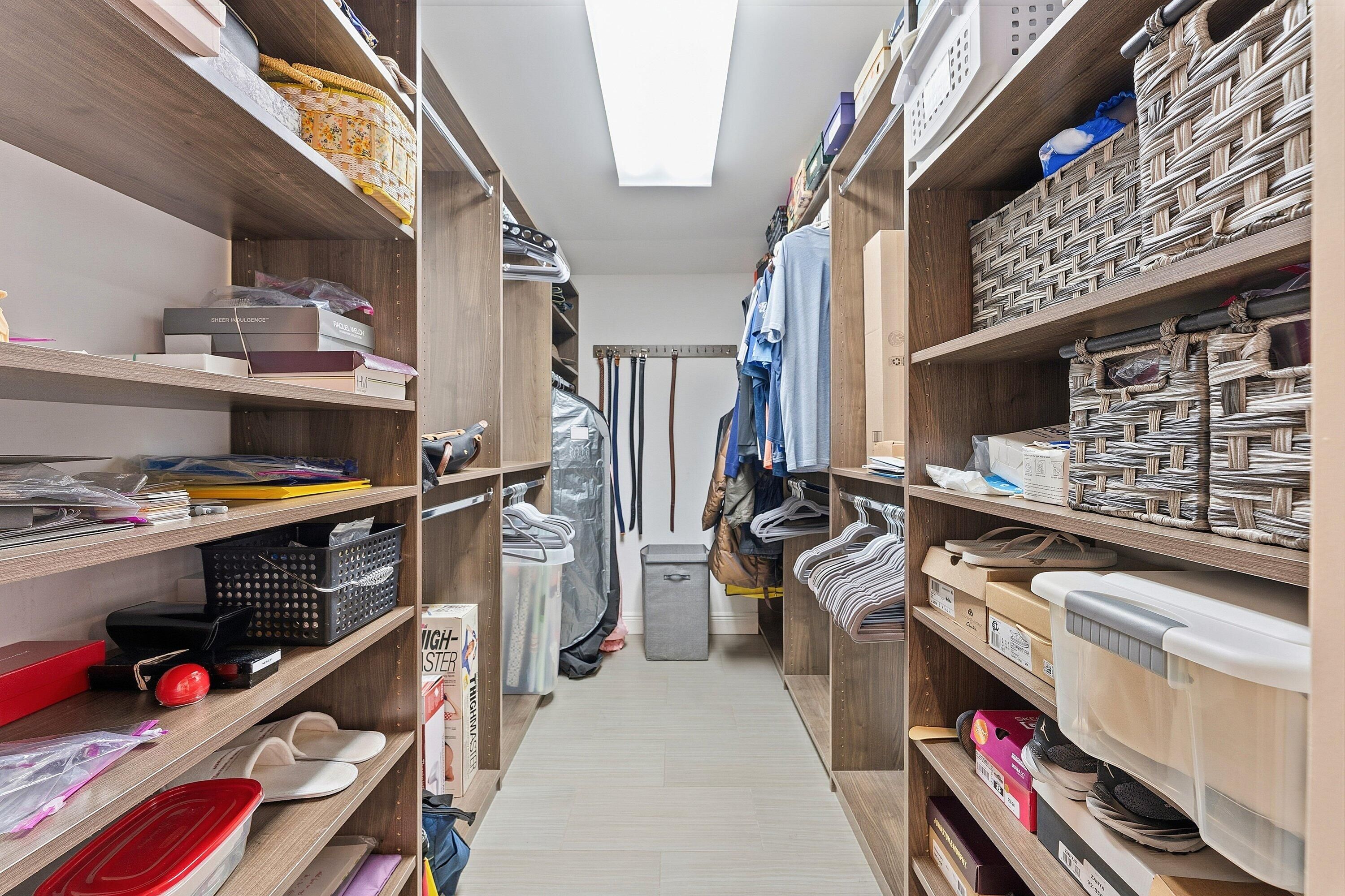 - Closet Cabinetry, Entry Level Living Area, Entrance Foyer, Skylights, High Ceilings, Walk-In Closet(s), Wet Bar, Eat-in Kitchen, Separate/Formal Dining Room, Blinds, Single Hung Metal Window(s), Sliding Window(s), Dual Sinks, Primary Downstairs