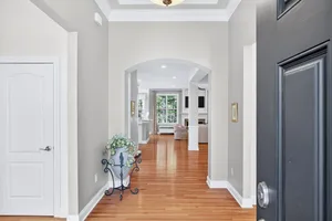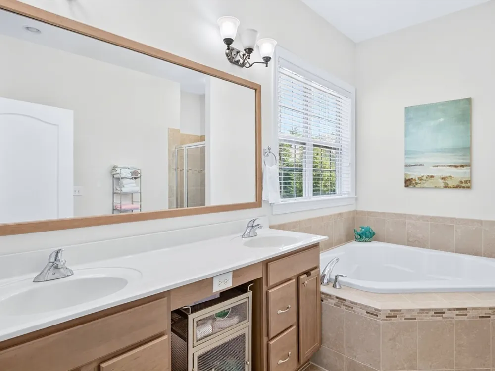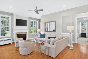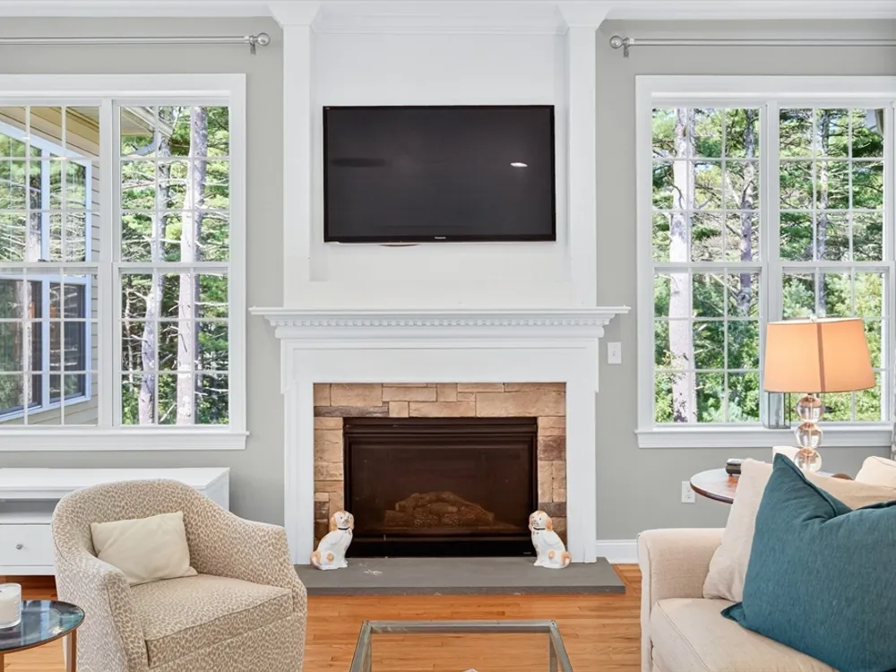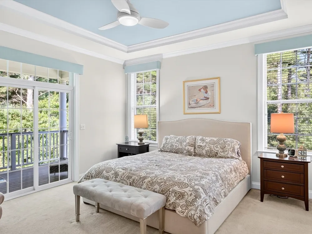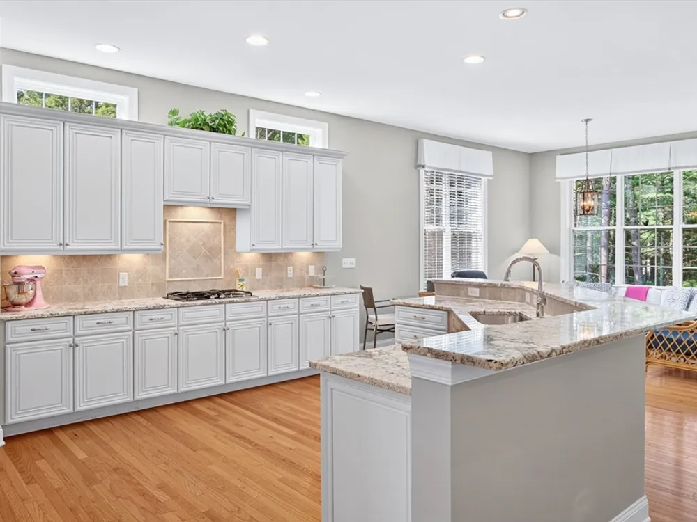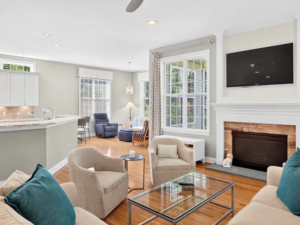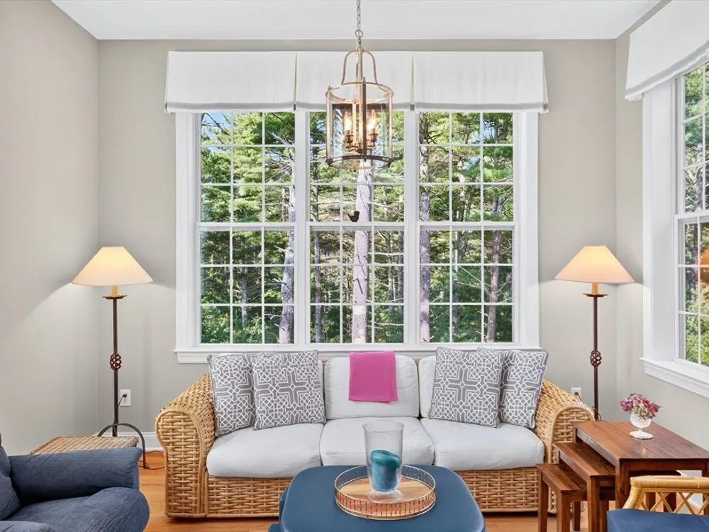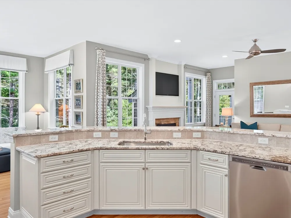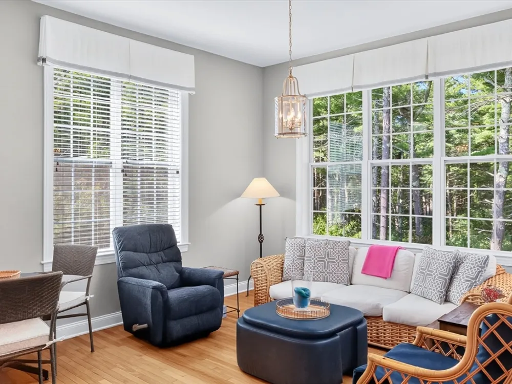 Beautiful "Bayhill" Toll Bros home with expanded custom kitchen and sunroom located in the charming Woodsong neighborhood in The Pinehills. Enter this home through the dramatic foyer past the guest bedroom suite and office/den to the sparkling open floor plan of the dining room, kitchen and living room. This home is filled with loads of light. Spacious deck off the living room and primary bedroom with wooded views and plenty of privacy! Great room has a gas fireplace. The dining room, with custom trim and crown molding, is adjacent to great room. The study has a wall of custom built-ins and French doors. Main bedroom suite with wall to wall carpet, large walk-in closet, and stunning primary bath. Lower level has a great room; perfect for entertaining, a full bath and a full wet bar with extra room for guests to stay, plus storage room. French doors lead to the backyard. Two car expanded garage (extra 4' deep) and laundry room with cabinets. This home is exceptional!