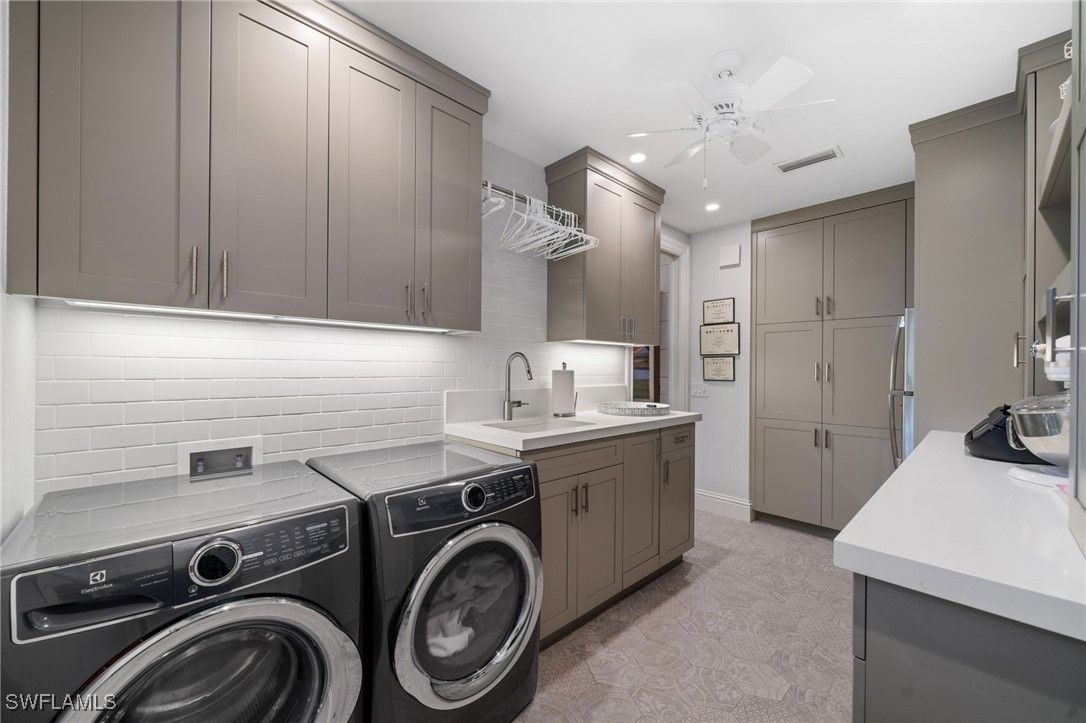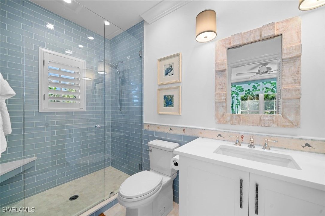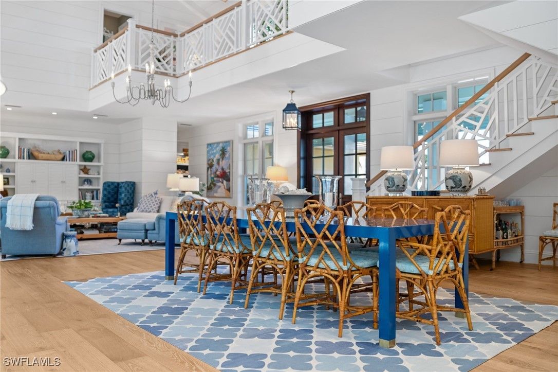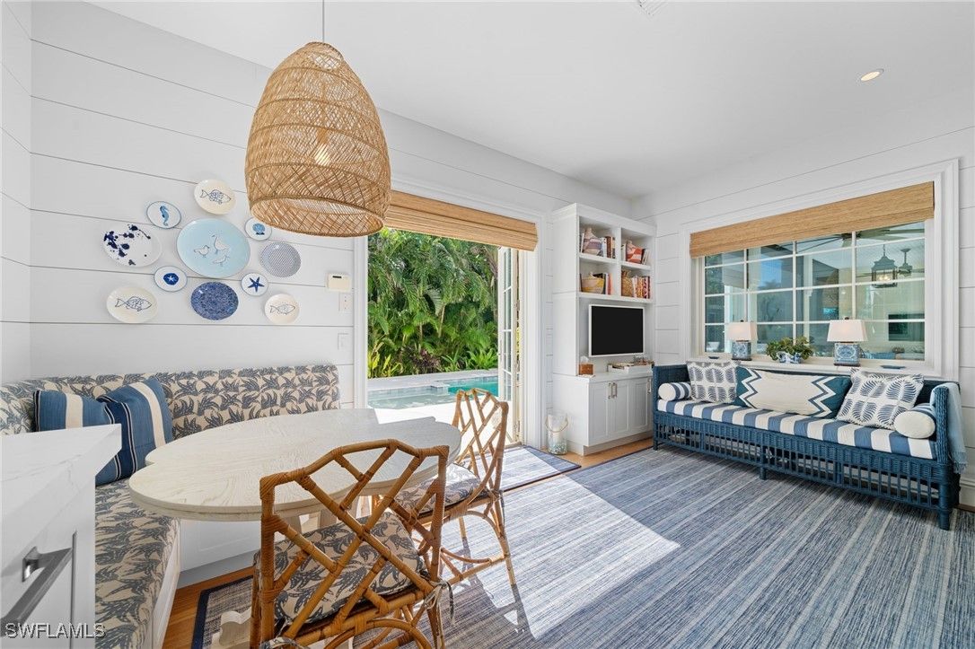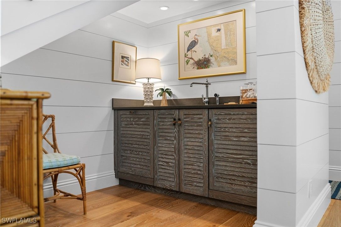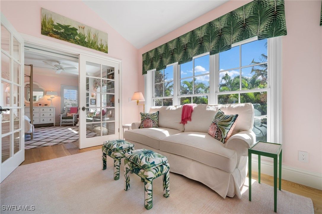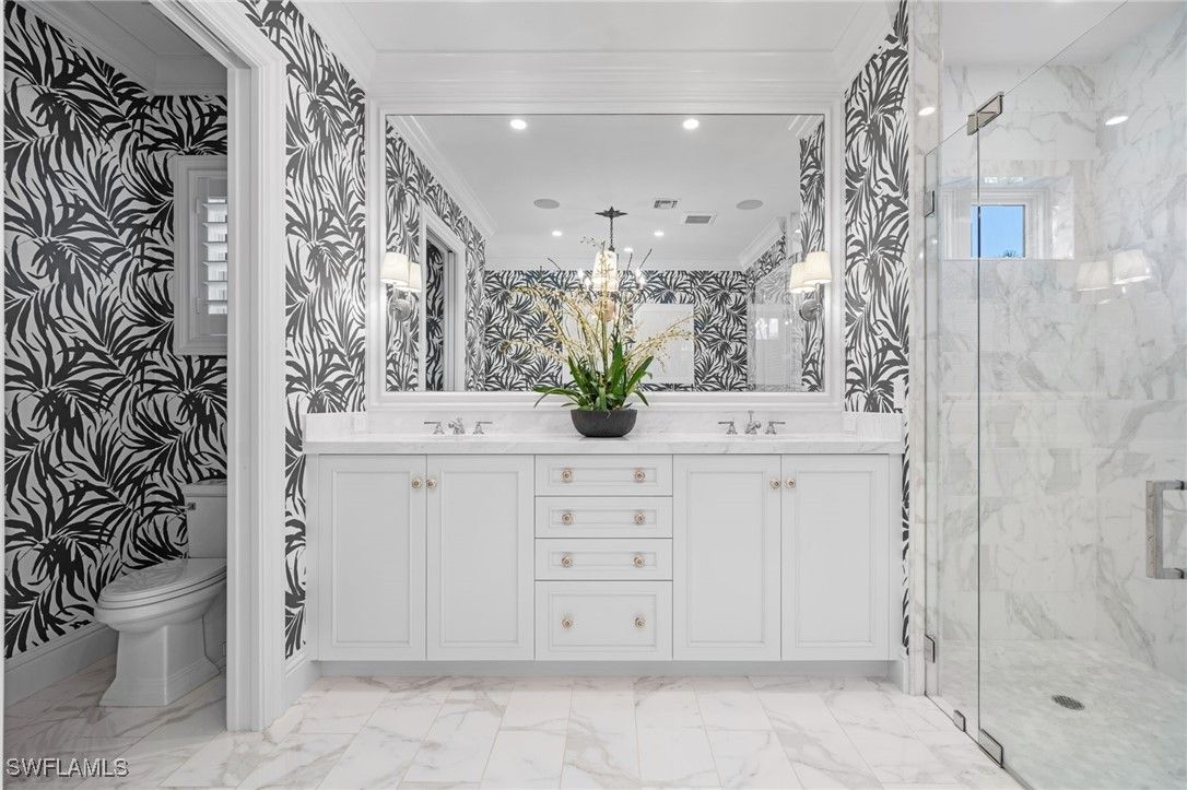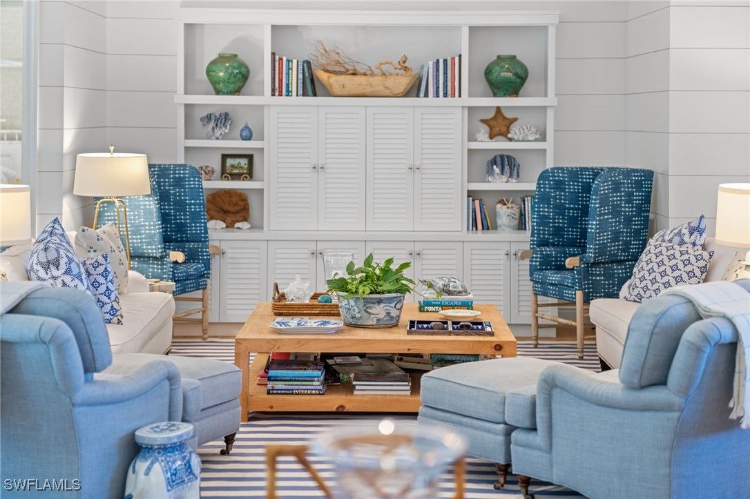Designed, built, and decorated by a renowned interior designer, this stunning four bedroom, five bathroom estate blends timeless Southern charm with modern luxury. The interior of this home has remained completely unaffected by hurricanes or flooding, with no water intrusion to the interior during any storm event. Boasting two master suites, one on the main level and another upstairs, both feature spa-like ensuite baths with heated floors for ultimate comfort. Step inside to an awe-inspiring great room with soaring ceilings, seamlessly flowing out to a screened in lanai that overlooks an oversized resort style pool, complete with a sun shelf and spa. Custom wide plank oak flooring by Legno Bastone enhances the warmth and elegance of every space. At the heart of the home, the chef designed kitchen is a culinary dream, outfitted with a gas Wolf range, SubZero refrigeration, two beverage drawers, a warming drawer, two dishwashers, and a built-in microwave drawer. A banquette, oversized island, and formal dining area provide multiple dining options, while a nearby wet bar with a wine fridge adds convenience. Outdoor living is equally impressive, featuring a fully equipped summer kitchen, pool deck dining under the stars, and a screened in dining area, all protected by forty two SWAT Mosquito sprayers. Upstairs, discover two additional spacious ensuite bedrooms and a versatile family room that doubles as a sleeping porch for family sleepovers. This home also includes two oversized garages, a custom laundry room with a second refrigerator, sink, and standalone Scotsman ice maker, a Kinetico water filtration system, a Sonos sound system, Lutron smart lighting, and WiFi controlled heating and cooling. Built with solid concrete walls, steel beams, and a poured concrete second floor, this residence offers exceptional durability and safety. Thoughtfully designed to create a sanctuary of comfort, style, and security, this home is truly one of Naples’ finest residences.