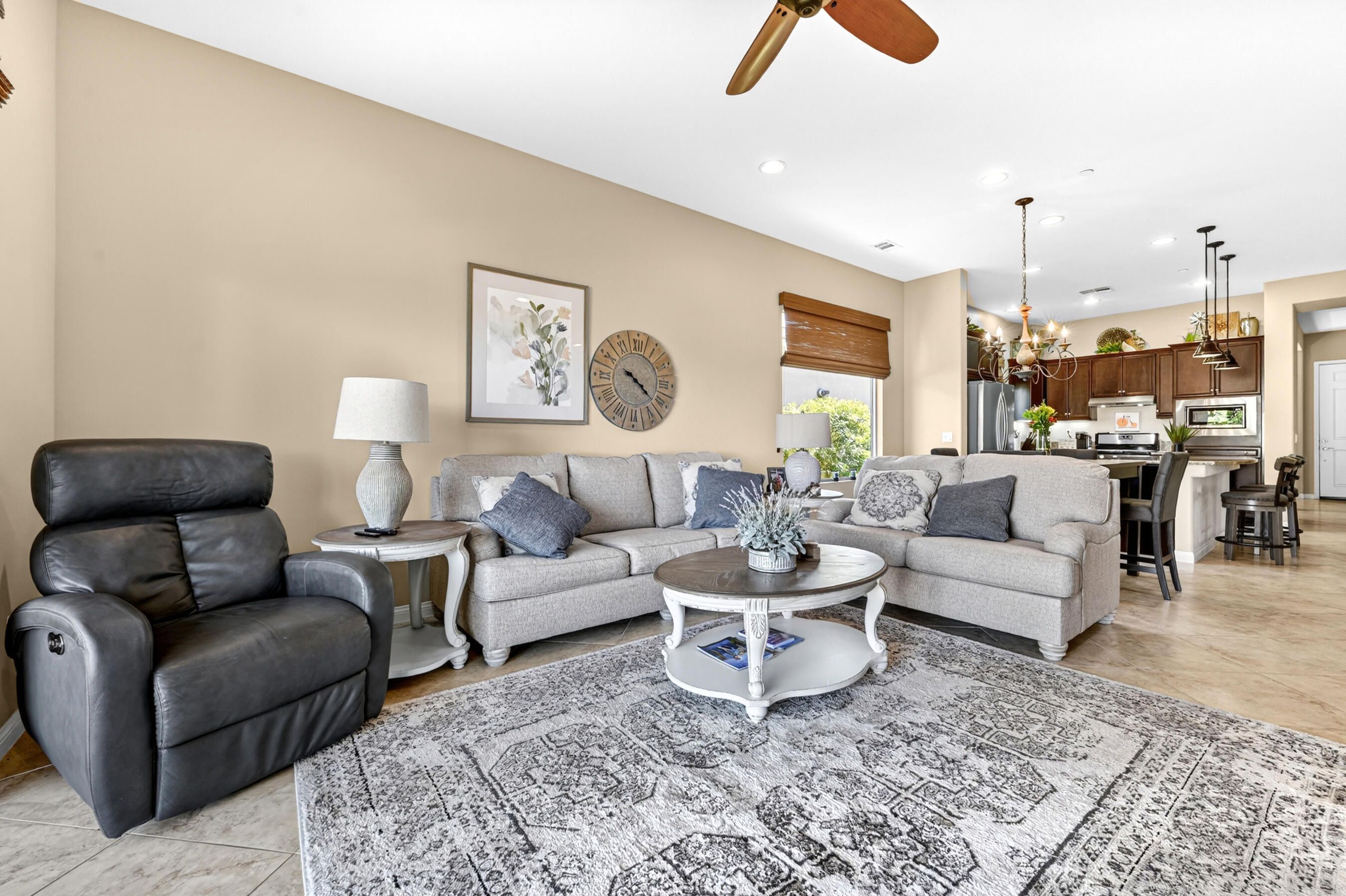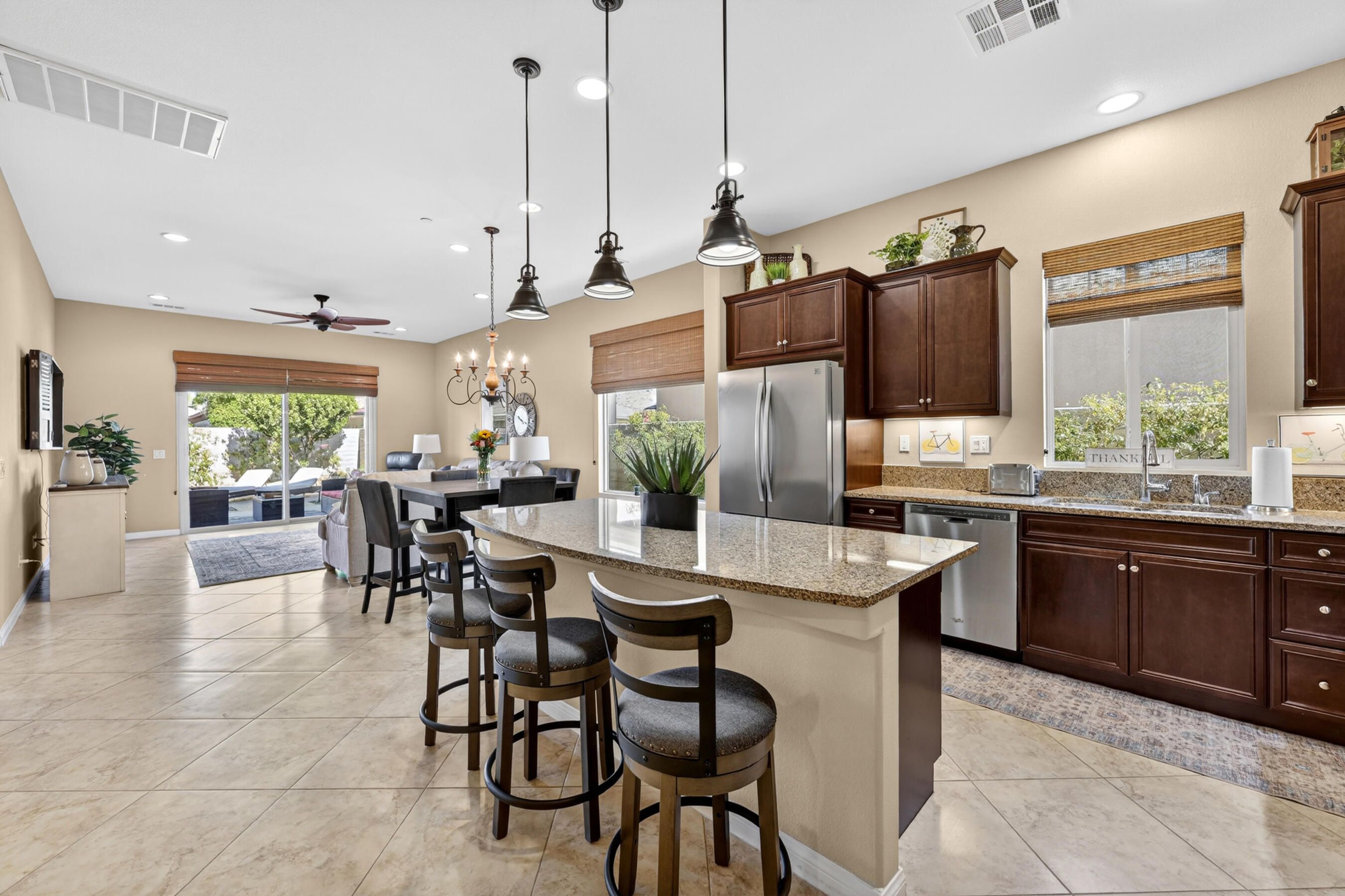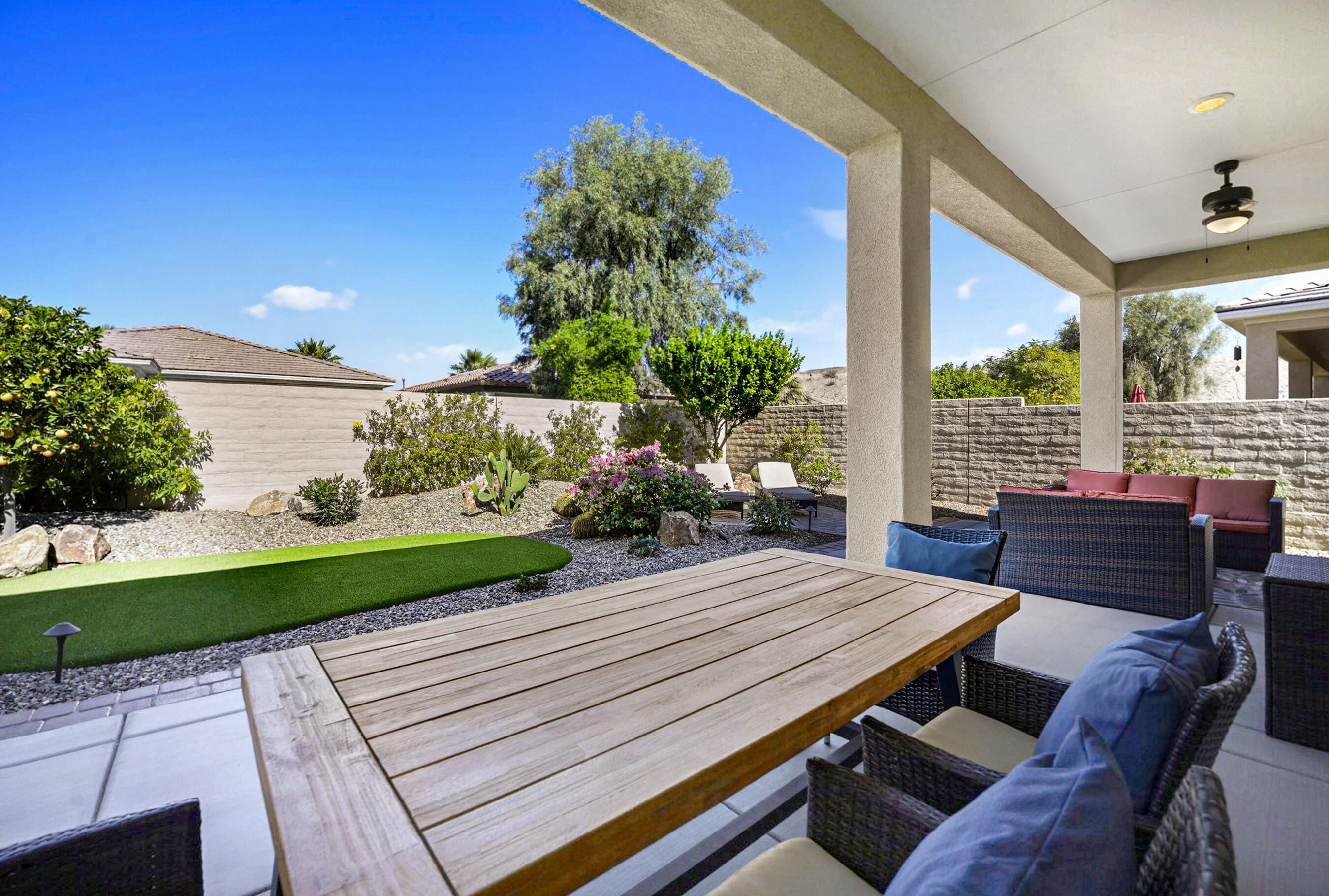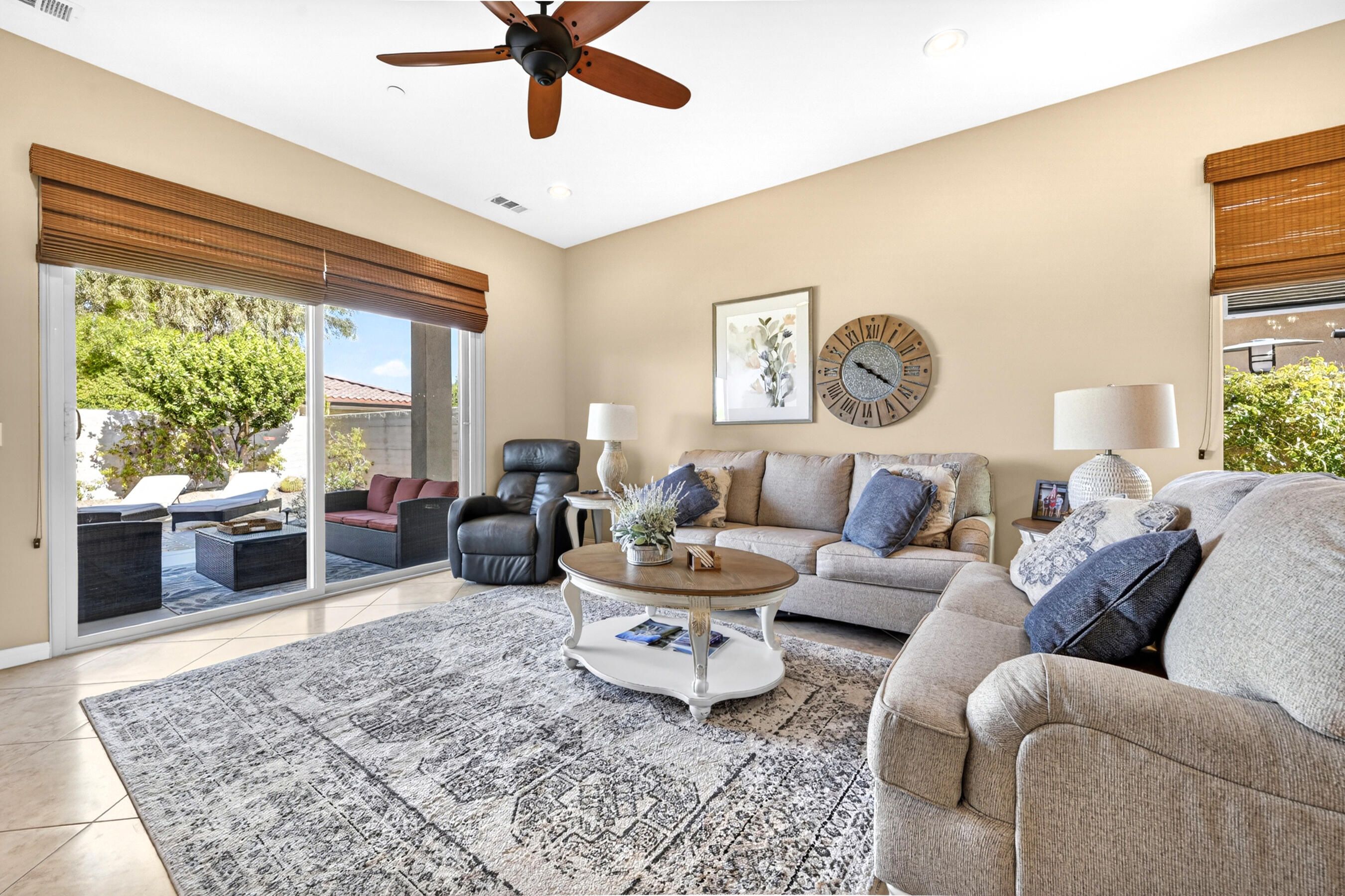 Welcome to Sun City Shadow Hills, where easy desert living meets comfort and style in this beautifully maintained Hideaway floor plan offering 1,512 square feet of thoughtfully designed space. This popular layout features 2 bedrooms, 2 bathrooms, plus a versatile den, ideal for a home office, hobby room, or additional guest space. From the moment you step inside, you'll appreciate the elegant diagonal tile flooring throughout, creating a seamless, open flow and a bright, airy feel. The spacious great room opens effortlessly to the kitchen and dining area--perfect for everyday living and entertaining. The kitchen offers rich cabinetry, granite slab countertops, stainless steel appliances, and a generous island with bar seating. Large windows and sliding glass doors invite natural light while connecting you to the beautifully landscaped backyard. The primary suite is a relaxing retreat with dual vanities, a walk-in shower, and ample closet space. A well-separated guest bedroom and full bath provide comfort and privacy for visitors. Step outside to your covered patio--an inviting space for morning coffee or evening gatherings--overlooking low-maintenance desert landscaping and lush turf. Whether you're dining al fresco, lounging in the sun, or hosting friends, this backyard offers the perfect setting to enjoy the desert lifestyle. The home is completed by an attached two-car garage featuring durable epoxy flooring, providing a clean, polished space ideal for parking, storage, or hobbies.Located within the highly sought-after 55+ community of Sun City Shadow Hills, residents enjoy two championship golf courses, resort-style pools and spas, state-of-the-art fitness centers, pickleball and tennis courts, on-site dining, clubs, and a vibrant social calendar. This is more than a home--it's a lifestyle. Come experience the very best of desert living.