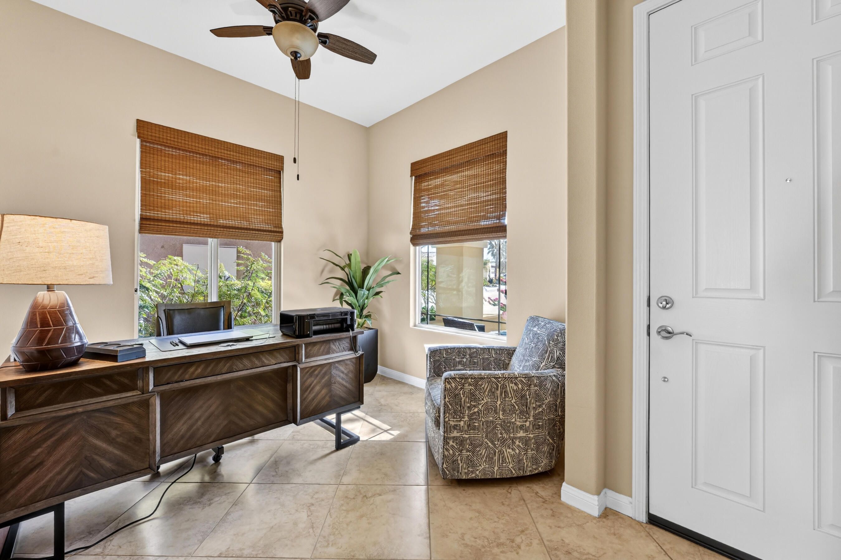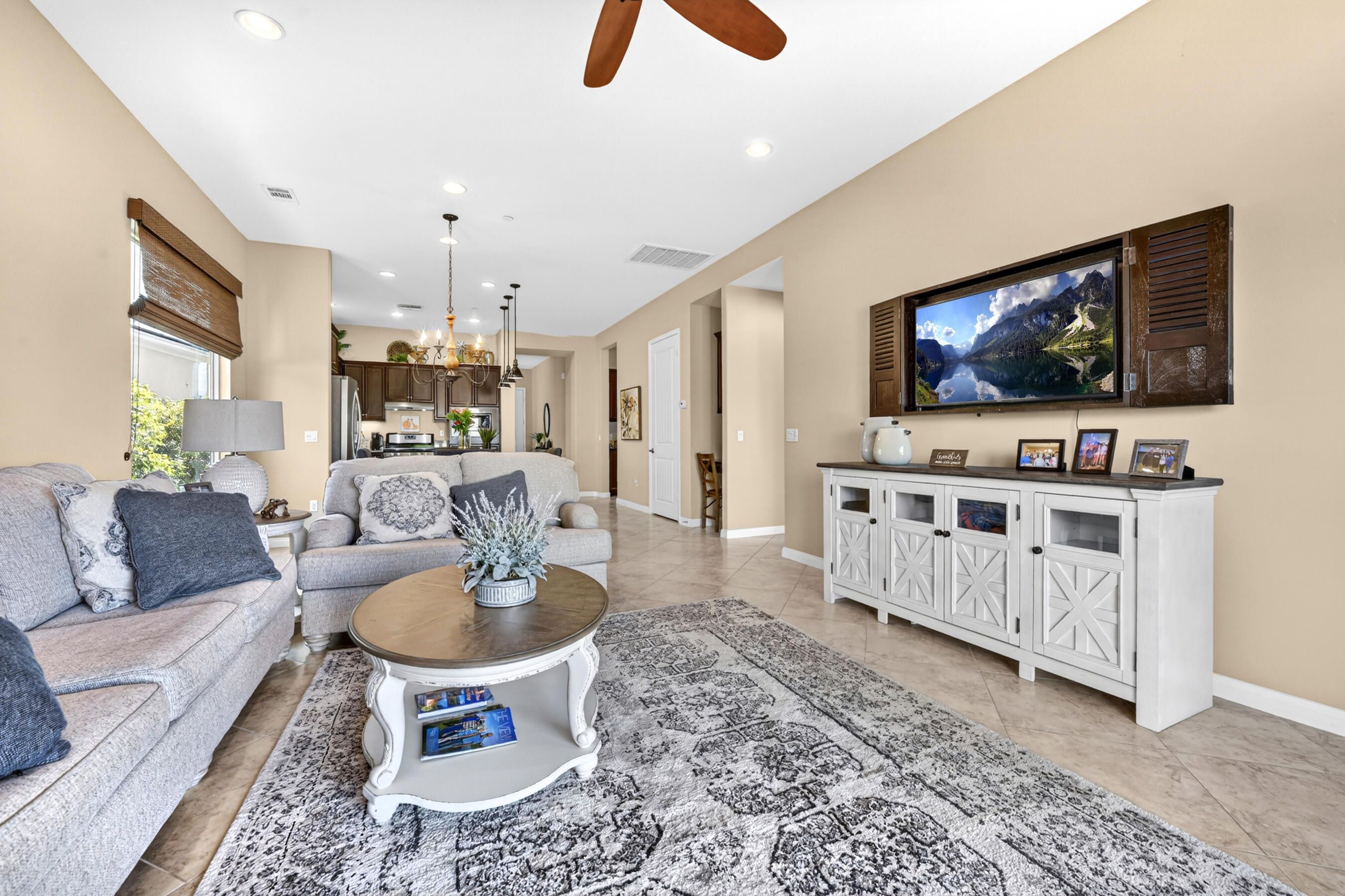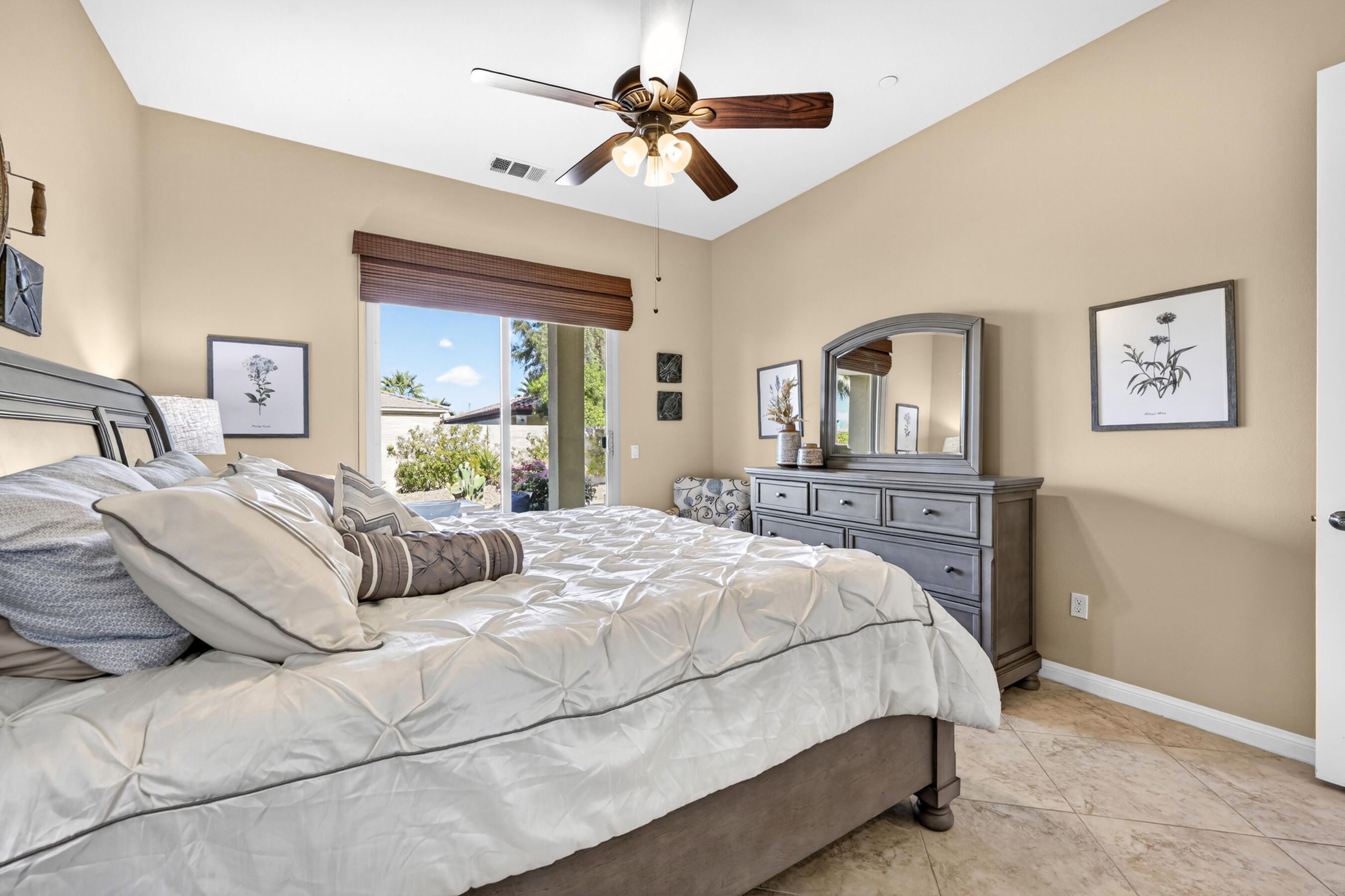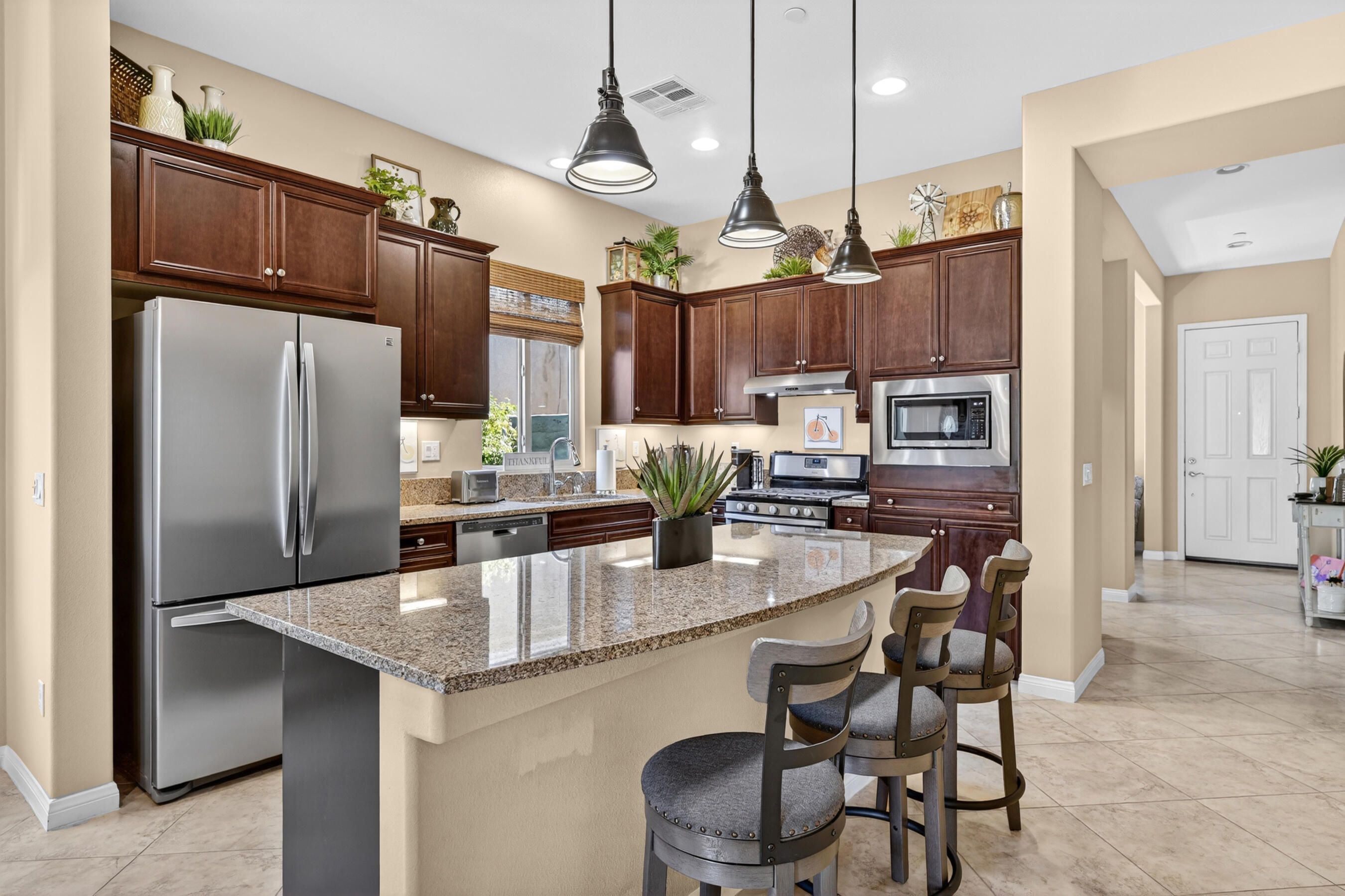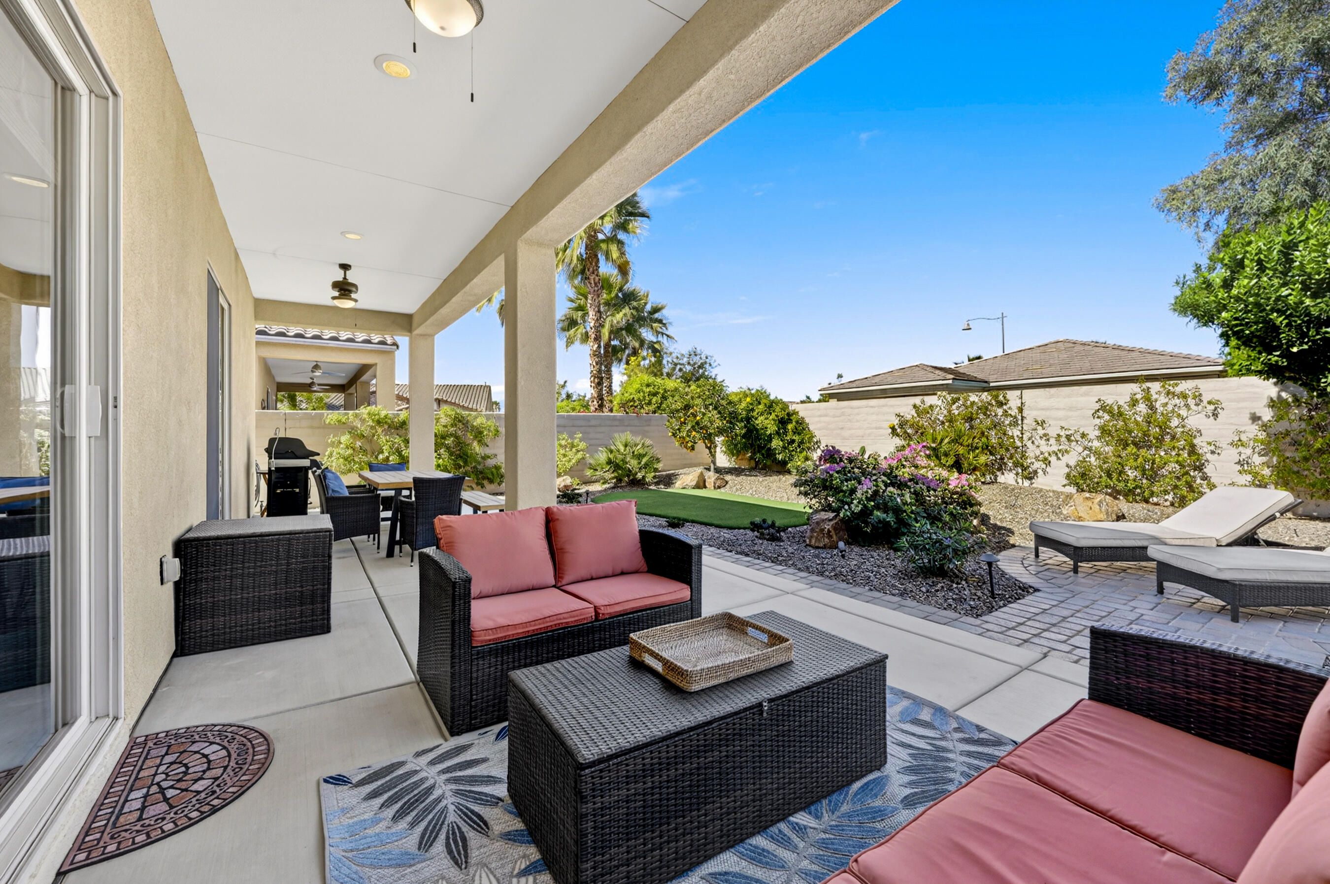 Welcome to Sun City Shadow Hills, where easy desert living meets comfort and style in this beautifully maintained Hideaway floor plan offering 1,512 square feet of thoughtfully designed space. This popular layout features 2 bedrooms, 2 bathrooms, plus a versatile den, ideal for a home office, hobby room, or additional guest space. From the moment you step inside, you'll appreciate the elegant diagonal tile flooring throughout, creating a seamless, open flow and a bright, airy feel. The spacious great room opens effortlessly to the kitchen and dining area--perfect for everyday living and entertaining. The kitchen offers rich cabinetry, granite slab countertops, stainless steel appliances, and a generous island with bar seating. Large windows and sliding glass doors invite natural light while connecting you to the beautifully landscaped backyard. The primary suite is a relaxing retreat with dual vanities, a walk-in shower, and ample closet space. A well-separated guest bedroom and full bath provide comfort and privacy for visitors. Step outside to your covered patio--an inviting space for morning coffee or evening gatherings--overlooking low-maintenance desert landscaping and lush turf. Whether you're dining al fresco, lounging in the sun, or hosting friends, this backyard offers the perfect setting to enjoy the desert lifestyle. The home is completed by an attached two-car garage featuring durable epoxy flooring, providing a clean, polished space ideal for parking, storage, or hobbies.Located within the highly sought-after 55+ community of Sun City Shadow Hills, residents enjoy two championship golf courses, resort-style pools and spas, state-of-the-art fitness centers, pickleball and tennis courts, on-site dining, clubs, and a vibrant social calendar. This is more than a home--it's a lifestyle. Come experience the very best of desert living.
