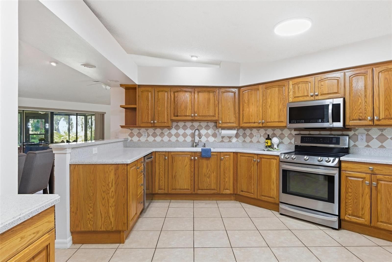 - Ceiling Fan(s), Eat-in Kitchen, Living/Dining Room, Open Floorplan, Main Level Primary, Solid Surface Counters, Split Bedrooms, Vaulted Ceiling(s), Walk-In Closet(s)