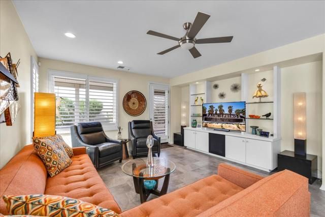 PALM SPRINGS WITH SOLAR! $16,000 PRICE IMPROVEMENT! This exceptional residence with Solar located within the Four Seasons 55+ gated community showcases sweeping mountain views, mature landscaping and an outdoor setting ideal for entertaining. A custom paver driveway leads to a beautifully maintained home featuring three bedrooms, with the third thoughtfully arranged as a versatile office complete with built-in desk and shelving. The kitchen and family room share an inviting open floor plan with high ceilings filled with natural light, and the family room is further enhanced with custom built-in shelves. A separate formal dining room provides a refined space for hosting. Notable upgrades include a new primary suite shower, water filtration system, newer windows, updated flooring, SS appliances and an insulated garage door with mini-split A/C for year-round comfort. Perfectly situated near shopping, dining, golf, world class Casinos and entertainment, this home captures the essence of the Palm Springs lifestyle. Within Four Seasons and its full time staff, residents enjoy a stunning huge clubhouse with resort-style amenities including sparkling pools & spas, a state-of-the-art fitness center, tennis and pickleball courts, walking trails, and a vibrant social calendar all set against the backdrop of breathtaking desert beauty, where every day begins and ends with majestic mountain views!