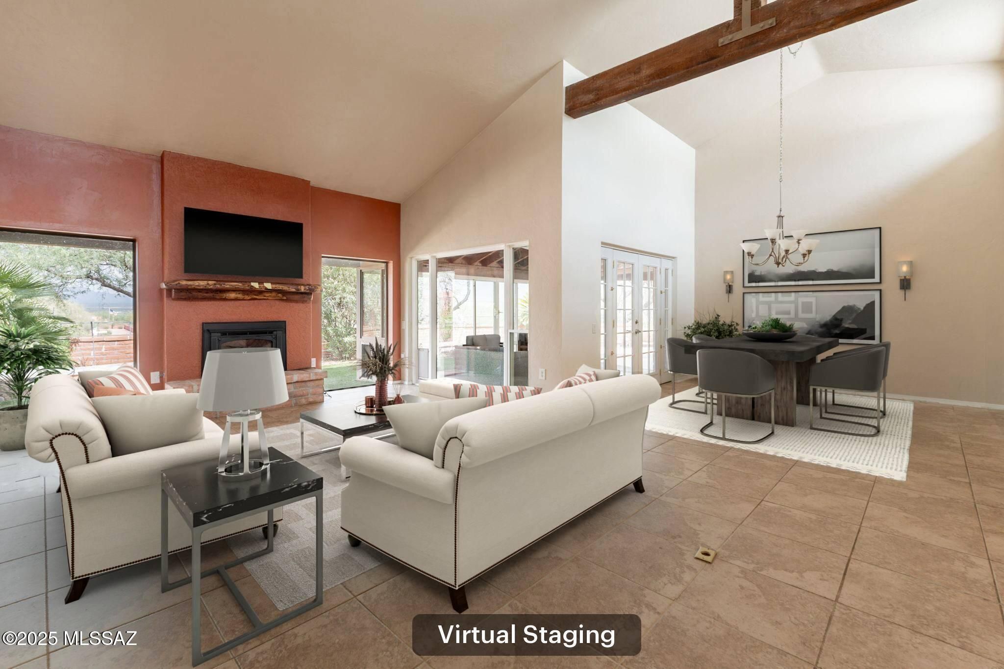 Welcome to your desert escape--where rustic beauty meets modern comfort in the heart of the Southwest. Set on 1.12 acres, this property offers a peaceful retreat surrounded by the scenic charm of the desert landscape and mountain views. This popular Granada Model has a classic slump block charm on the exterior. As you step inside through the wood double doors you are greeted by an open Living Area with souring high ceilings, a cozy fireplace, a formal dining area, large windows that frame the views of the mountains and give an instant feel of home. The kitchen has been wonderfully updated featuring knotty alder cabinets accented by granite countertops and opens to a cozy breakfast nook area. Just off the front entrance is a generous den, perfect as a home office, gym, or creative studio.