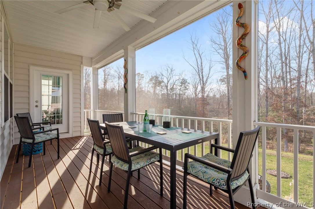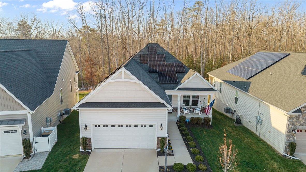 Spacious and beautifully maintained home in Colonial Heritage offering 3,400+ sq ft, wooded views, and multiple outdoor living spaces. Enjoy a shaded front porch, screened deck, and expansive patio— for relaxing or entertaining. The main level features 9’ ceilings, a primary suite with dual closets, guest bedroom and bath, private office, living and dining rooms, and a bright kitchen with breakfast bar and laundry. The walk-out lower level includes 9' ceilings, a massive family room, guest suite, patio access, and abundant storage. Numerous upgrades include solar panels (avg electric bill $7.98/month), screened deck with warranty, tiled backsplash and fireplace surround, 10-year termite protection, security/fire/CO detection system, expanded patio with landscaping, and custom floating cabinetry. Colonial Heritage amenities include golf, indoor and outdoor pools, tennis, pickleball, fitness center, clubhouse, and walking trails.
