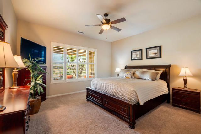 Mountain Views and Golf Course Living!Experience stunning southern views of Mt. San Jacinto and Mt. Gorgonio from this beautifully furnished Avalino floor plan in Sun City Shadow Hills. Perfect as a seasonal retreat or year-round residence, this 2-bedroom, 2-bath home with den/office offers comfort, quality, and resort-style living.The open kitchen features Corian countertops, double ovens, a gas cooktop, 42-inch cabinetry, a step-in pantry, and a breakfast bar overlooking the spacious great room ideal for gatherings and everyday living. Plantation shutters throughout add privacy and elegance, complementing the high ceilings and tasteful decor.The primary suite provides a relaxing retreat with dual vanities, a soaking tub, separate shower, and custom walk-in closet. A guest bedroom and den offer flexible space for visitors or a home office.Step outside to enjoy the ultimate in desert outdoor living. The elevated patio above the 12th green of the North Course features two new motorized 10-foot extendable awnings, a new outdoor L-shaped sectional, and five matching gliding chairs, creating the perfect setting for entertaining or relaxing. The fire pit and alfresco dining area make this space ideal for both cool winter evenings and sunny summer days.This turnkey home captures the essence of desert living refined, comfortable, and perfectly situated in the heart of Sun City. Sun City Shadow Hills offers two championship golf courses, resort-style clubhouses, state-of-the-art fitness centers, pools, tennis and pickleball courts, and an abundance of social clubs and activities for the desert lifestyle.