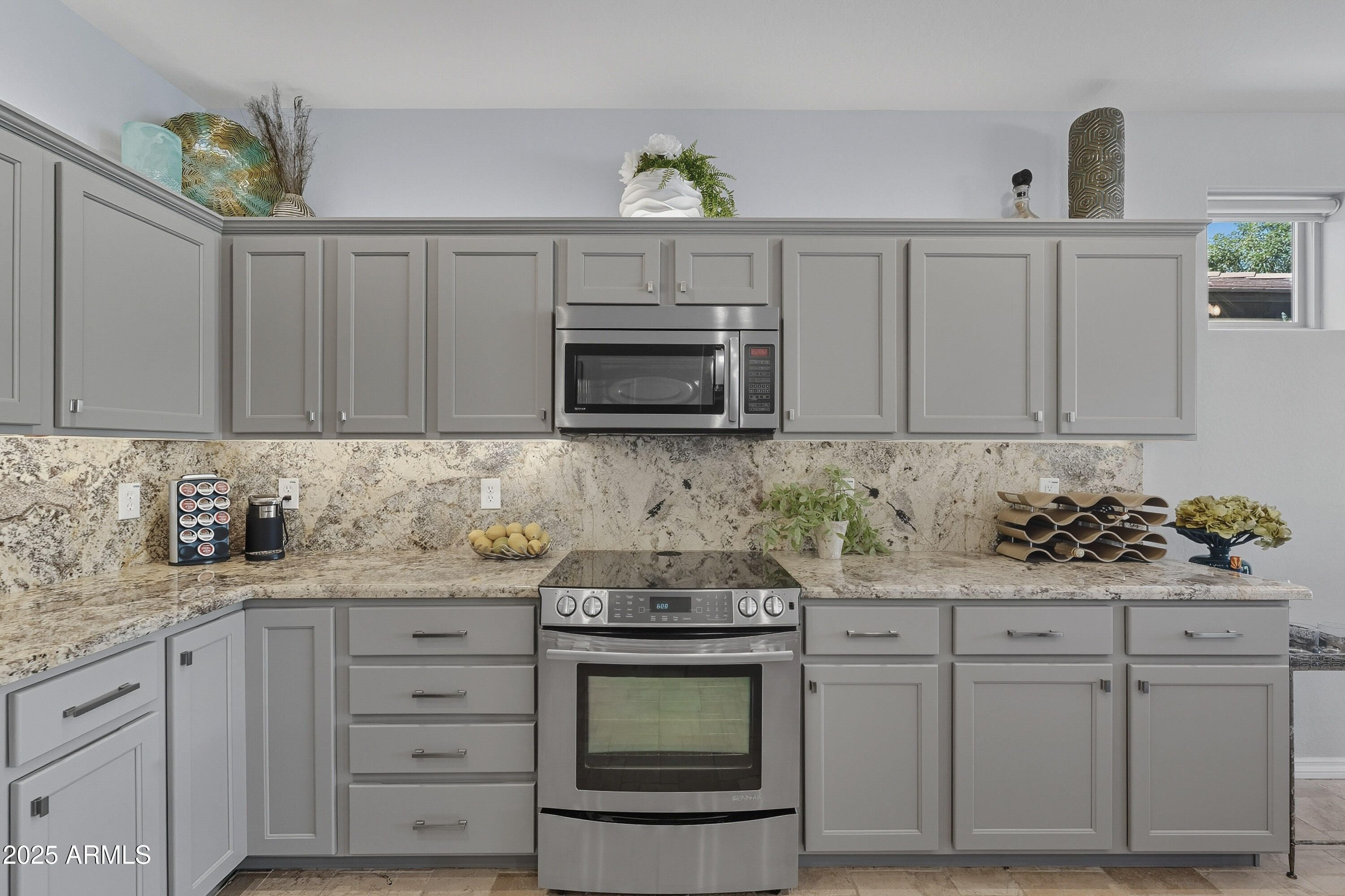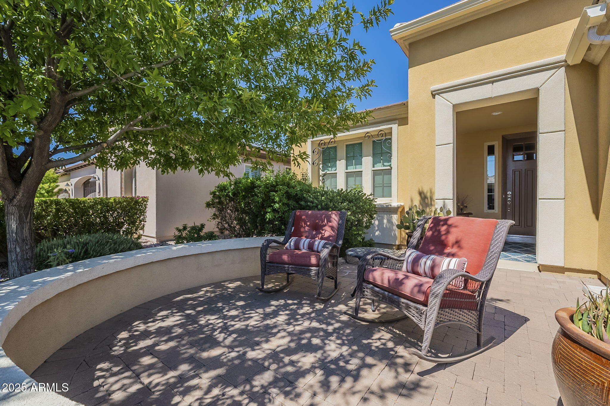 Discover the elegance of the St. Tropez floorplan home with Solar, from the moment you arrive to your cozy front courtyard. Step inside to the timeless travertine flooring that adds sophistication to the place. The refinished warm grey cabinets exude modern charm, complemented by freshly painted walls that create a bright and welcoming ambience. The spacious great room, enhanced by the large island is a perfect central hangout spot for the home, and ideal for entertaining. This area blends seamlessly with the spacious backyard, finished with pavers, a pergola and Built-in BBQ. Ideal spot to enjoy the AZ weather. A newly upgraded laundry room features white cabinetry for extra storgage and a quartz countertop. This home is a perfect combination of comfort and style, ready to impress