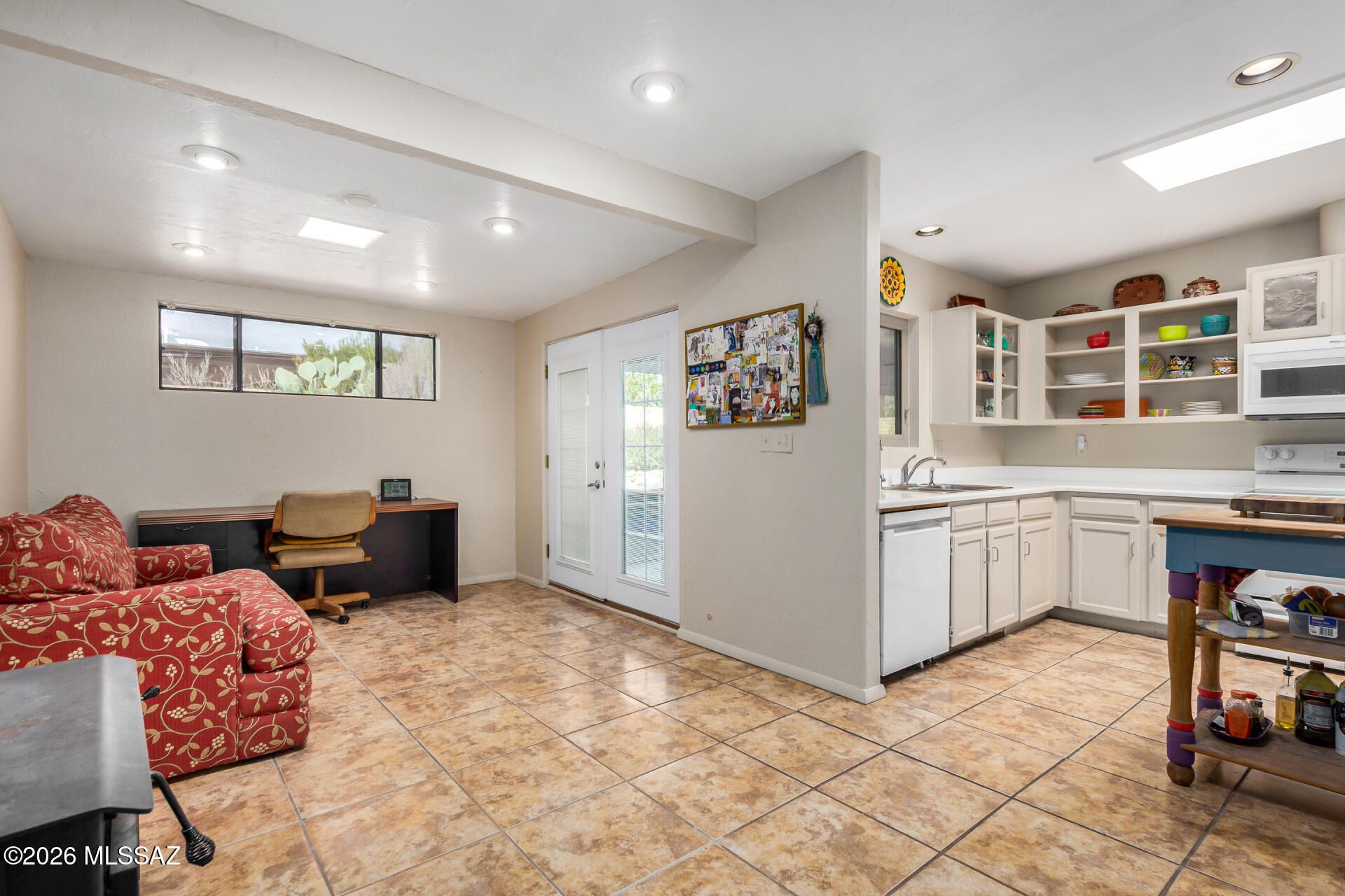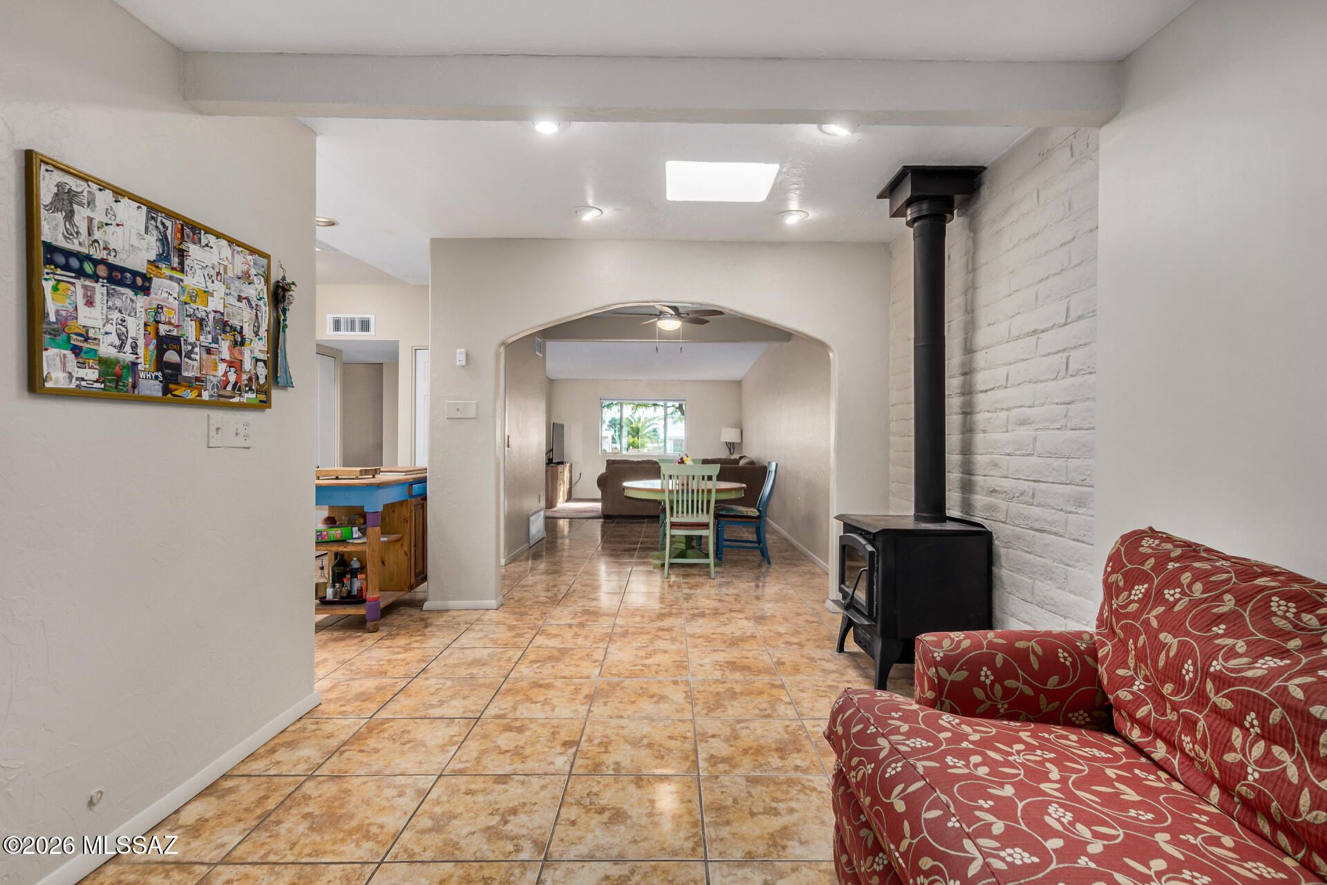 Beautifully maintained and full of charm, this 2 bedroom, 2 bathroom home with a bonus Arizona Room is tucked away in the highly desirable Villages of Green Valley. You are welcomed into a lovely courtyard, through to a comfortable living room that flows into a quaint dining area and an inviting family room just off the kitchen, complete with a cozy wood-burning stove. The bright, open kitchen shines with crisp white appliances, a skylight, and a window perfectly positioned at the sink to bring in natural light. The primary bedroom offers a private en suite bathroom, while the guest bedroom and hall bath provide comfort and convenience for visitors. A fully enclosed Arizona Room with a wall of sliding glass doors creates a seamless connection between indoor and outdoor living,