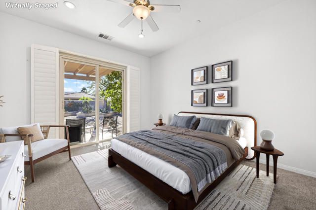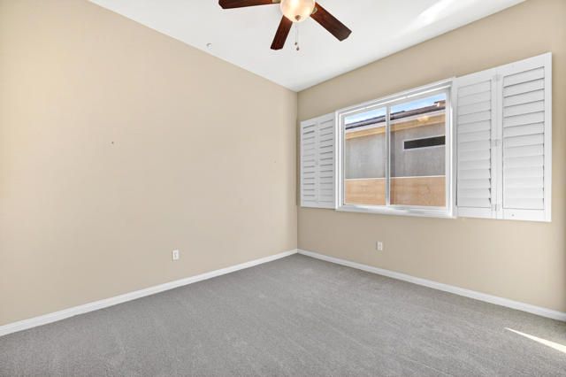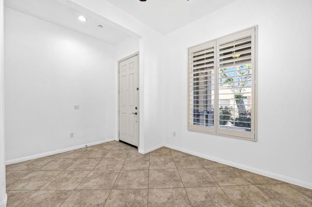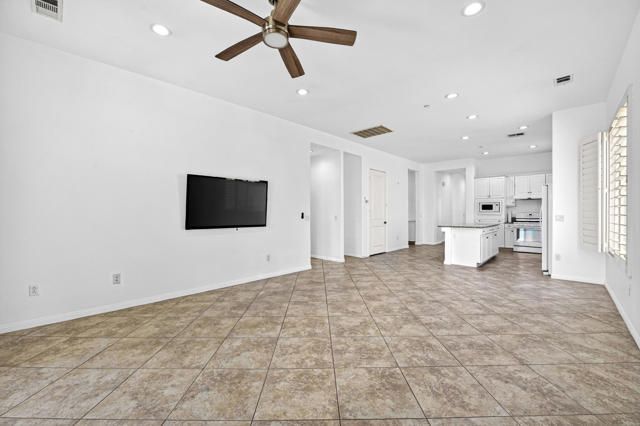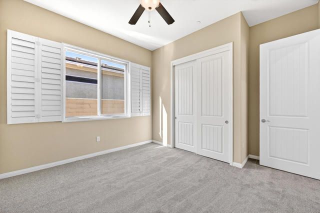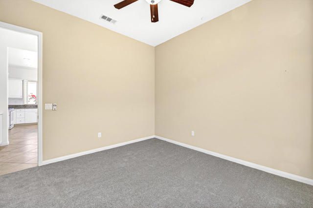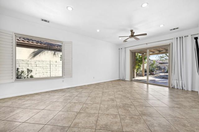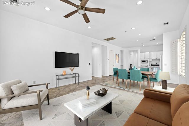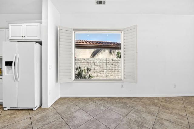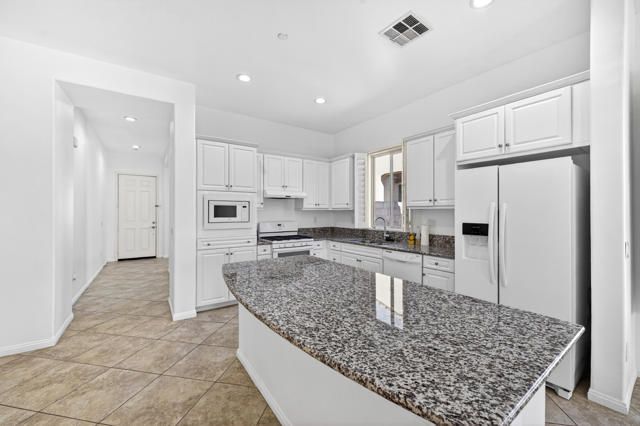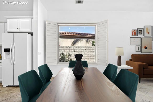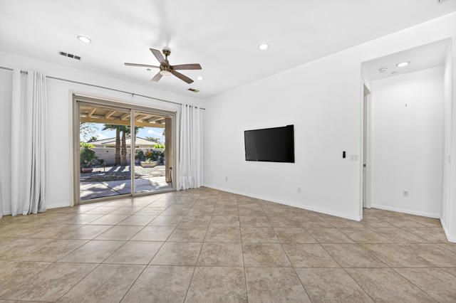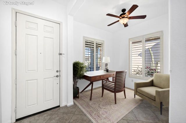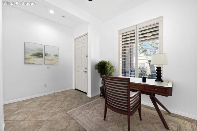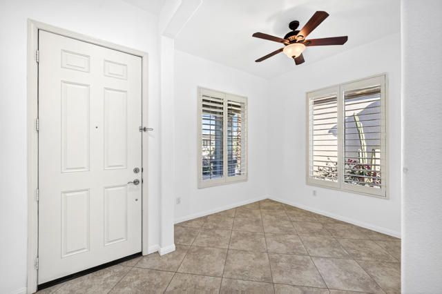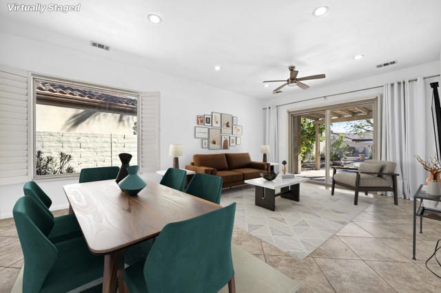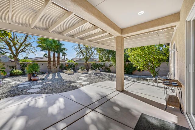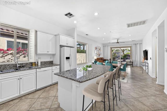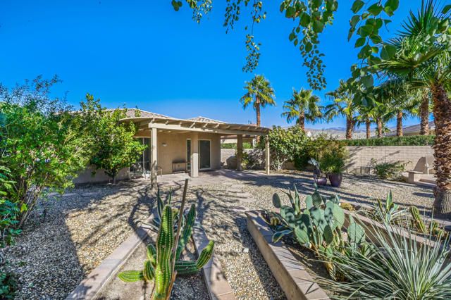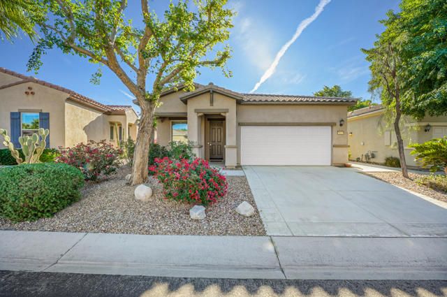 Beautifully appointed Hideaway floor plan, offering 1,512 sq. ft. (EST.) of thoughtfully designed living space, built in 2012 and ideally located near the clubhouse in the highly desirable Phase 3 of Sun City Shadow Hills. This newer section of the community is known for its modern homes and convenient access to resort-style amenities. The home features a contemporary front elevation with low-maintenance desert landscaping and sits on a generous lot with ample space for a future swimming pool. Inside, the well-designed layout includes 2 bedrooms, 2 bathrooms, and a versatile den that can easily function as a third bedroom or home office. The interior showcases 24' x 24' tile flooring laid on the diagonal throughout the main living areas, plantation shutters throughout, and freshly updated designer white paint, creating a bright and cohesive aesthetic. The kitchen is both stylish and functional, featuring crisp white cabinetry, coordinating white appliances, granite countertops, and a stool-height island that opens seamlessly to the dining area and spacious great room--ideal for everyday living and entertaining. The primary suite offers a peaceful retreat with direct patio access via sliding glass doors, a charming barn door entry to the bathroom, dual vanities, a glass-enclosed shower, and a generous walk-in closet. Both the primary and guest bedroom closets feature new diagonal-pattern carpet for added comfort. The extended garage includes an insulated overhead door, anchored storage cabinets, and a convenient man door providing direct access to the sidewalk and driveway. Step outside to a beautifully enhanced backyard retreat, featuring an extended concrete patio with Alumawood cover, a fire pit, three raised garden beds, and plenty of space to relax or entertain while enjoying breathtaking sunset skies. This outdoor setting truly elevates the desert lifestyle experience. This home offers an exceptional blend of comfort, style, outdoor living, and prime location close to the clubhouse and amenities--a must-see opportunity in Sun City Shadow Hills.