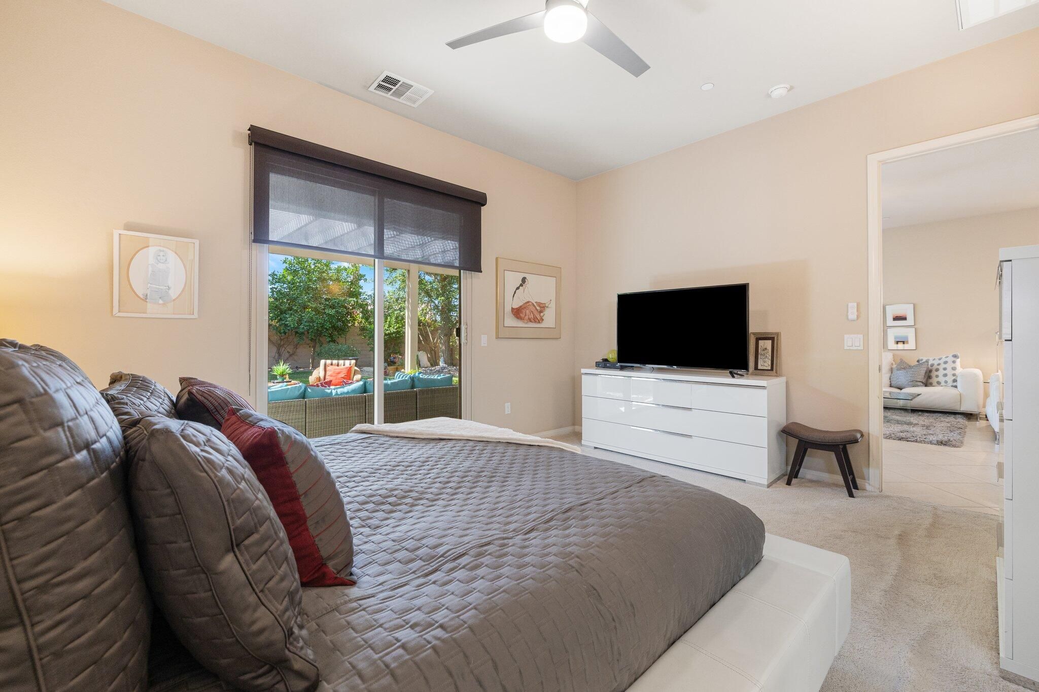IMPROVED PRICE**SUN CITY SHADOW HILLS - active adult community. Beautiful open floor plan with slab granite counters, espresso colored wood cabinets, and stainless steel appliances. Gas stove, tile on the diagonal with carpeted bedrooms, sliders in primary bedroom and living room. Large primary bedroom with large shower w/seat and dual sinks. Second bedroom. is app. 10' wide X 11' long and has its own bathroom with tub/shower. Large laundry room with cupboards. And, to top it off is a lushly treed back yard with a very large extended patio cover, excellent for relaxing or entertaining. 6-7 fruit trees. New fans, low voltage ceiling lighting, new garage door and new outdoor landscape lighting. Pathway to Club House and pool 10 minutes away. Don't miss this opportunity at a great house at a great price! WELCOME TO YOUR NEW HOME!