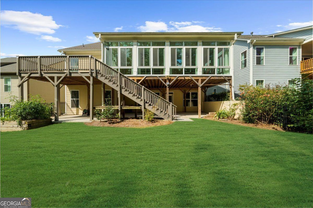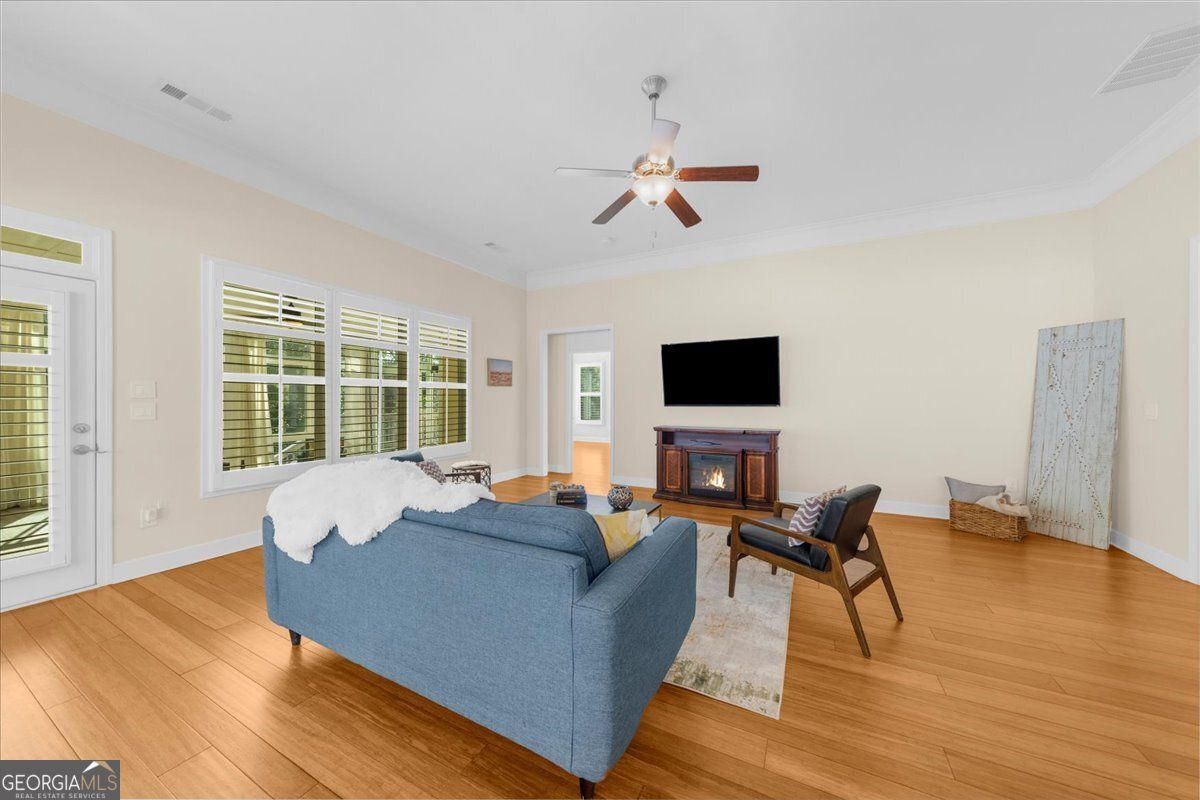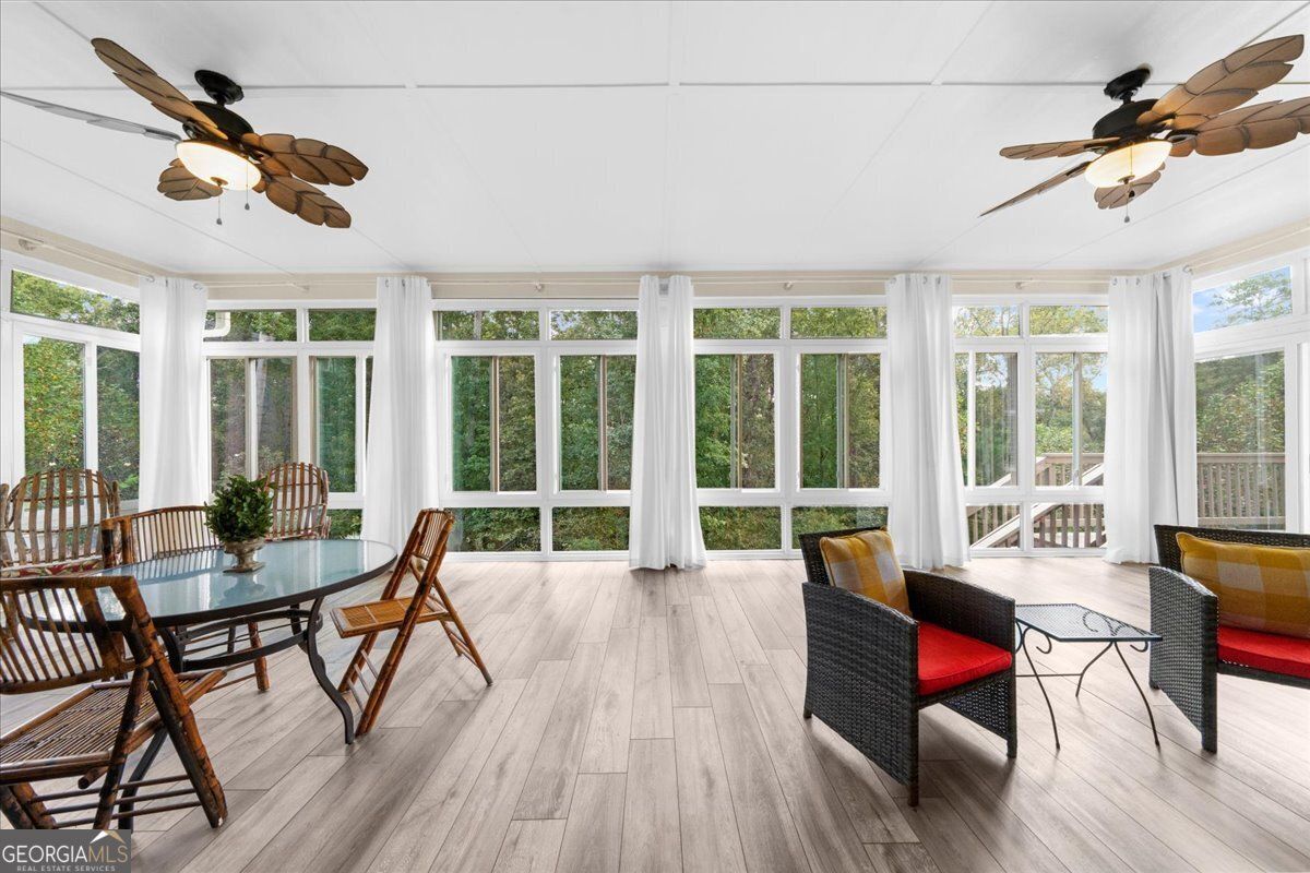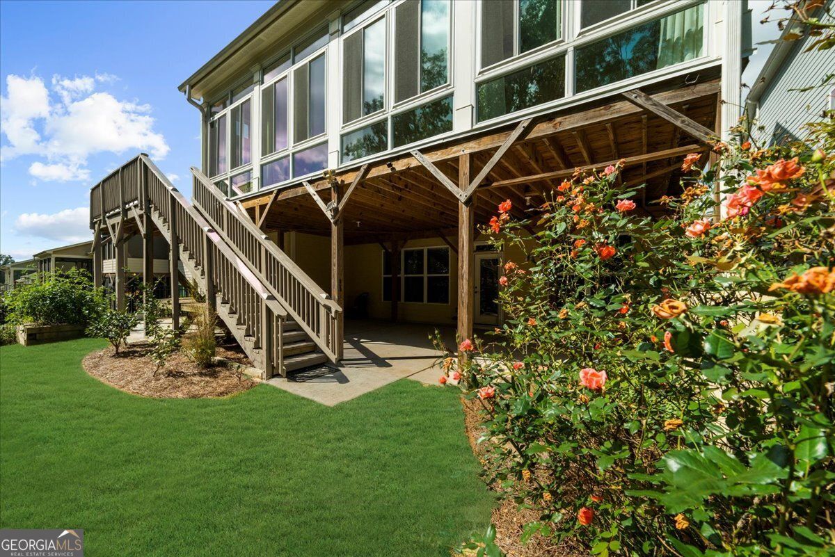Explore Cresswind at Lake Lanier, an award-winning lakeside community offering a variety of indoor and outdoor activities designed for active adults. The 4,165 sq ft Maple model features an open floor plan with a finished terrace level that includes a kitchen, family room, four multi-purpose rooms, and a covered patio. The main floor boasts three bedrooms, two full bathrooms, a half bathroom, a living room, dining room, kitchen, an expansive 16 x 32 ft enclosed Lanai, and an extended garage. Smart home features allow control of lights and fans with voice-activated smart switches. Upon entering, you'll notice elegant bamboo hardwood floors throughout the main level and staircase. Plantation shutters adorn the windows, and double crown molding enhances the living room. The spacious living room flows into a dining area perfect for seating over twelve guests, with custom window placements providing extra room for furniture. The pantry door is strategically placed to improve traffic flow and maximize storage. The kitchen includes a breakfast bar, a large island for additional storage, a walk-in pantry, upgraded stained cabinetry with drawers in most cabinets, light granite countertops, stainless steel appliances, a gas cooktop, built-in oven, ceiling fan, and recessed lighting. The primary suite offers a walk-in shower, make-up vanity, dual undermount sinks, and a custom-designed walk-in closet with bamboo flooring matching the rest of the main level. Two guest bedrooms have walk-in closets and share a Jack and Jill bathroom with a tub/shower combination. A spacious laundry room is conveniently located near the kitchen. The STUNNING 16 x 32 ft WINDOW ENCLOSED LANAI overlooks the wooded rear property and features low-maintenance LVP flooring and a gas heater, making it a cozy space for entertaining. Exterior features include a deck with a natural gas Weber grill, doggie doors connecting the house to the sunroom and deck giving easy access to the stairway for your furry friends down to the lushly landscaped backyard. Plant your own vegetables in the spacious garden box and harvest fresh blueberries from the abundant blueberry bushes. On the terrace level, LVP flooring and dimmable lighting extend throughout. a convenient SECONDARY KITCHEN equipped with refrigerator, sink, cabinets, and granite counters. The open family room is designed for gatherings, while four flex rooms offer space for various purposes such as crafts, workshops, recreational activities, or a library. The 4TH BEDROOM is spacious enough for a king-size bed and is ideal for an IN-LAW SUITE WITH AN ADJOINING LIVING ROOM OR FOR A PRIVATE GUEST BEDROOM. The full bathroom features porcelain tiles, a sleek modern vanity, and a tiled walk-in shower. The covered patio utilizes an alternate support system to increase usable outdoor area. The EXTENDED GARAGE is WIRED FOR EV CHARGING. Cresswind at Lake Lanier features a 43,000 square foot, three-story clubhouse with indoor and outdoor pools, kayaking, fishing, courtesy boat docks, over 120 clubs, arts and crafts room, pickleball, tennis, fitness center, dance and fitness classes, poker, games, billiards, performances, chorus, concerts, and dances. An on-site activities director, property manager, and maintenance staff ensure smooth operation of all facilities. Residents are welcoming and actively encourage new neighbors to participate in community activities. As a 12+ year resident of Cresswind at Lake Lanier, I know you will love the lifestyle the community has to offer!