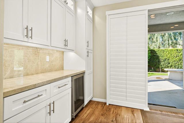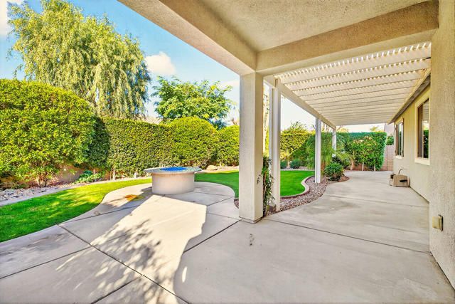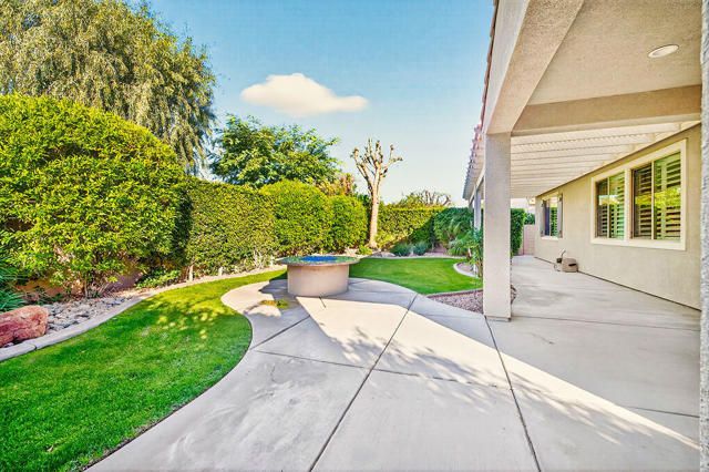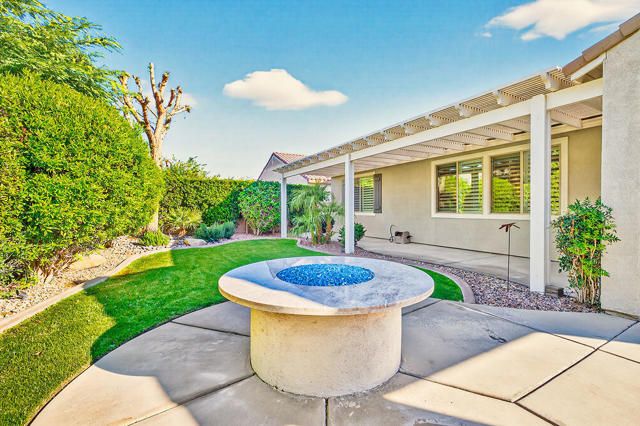 A truly exceptional residence in Sun City Shadow Hills, this extensively upgraded Merida floor plan offers sophistication, luxury, comfort, and a thoughtful design. Encompassing approximately 2,400 square feet, the home features three bedrooms, a spacious den, and two beautifully appointed baths, all enhanced by refined finishes and meticulous attention to detail. Upon entry, custom Italian tile flows gracefully through the main living areas, setting a tone of understated elegance. A large formal dining room provides an inviting space for memorable gatherings, while the open-concept design allows for effortless everyday living and entertaining. The true cook's kitchen is both stunning and functional, appointed with natural quartzite countertops, an oversized extended island, custom cabinetry, under-cabinet lighting, a dedicated coffee bar, and premium KitchenAid appliances. The adjoining great room is warm and welcoming, highlighted by a dramatic stacked-stone fireplace that adds architectural depth and charm. Guest bedrooms are privately situated and finished with plush Berber carpeting and custom wood shutters, offering comfort and privacy for visitors. The primary suite serves as a tranquil retreat, generously proportioned and complemented by a spa-inspired bath featuring an expansive walk-in shower with seamless glass, elegant quartzite surfaces, refined lighting, and a beautifully designed walk-in closet. Significant enhancements: magnificent crown moldings, a whole-home water filtration system, freshly painted exterior, a new 16 SEER air-conditioning system, and a rare, air-conditioned garage providing year-round comfort and convenience. Outdoors, the extended covered patio with Alumawood cover, built-in gas fire pit with quartzite top, and lush, mature landscaping create a serene and private setting ideal for relaxation or entertaining. This is a home of distinction where quality craftsmanship, thoughtful upgrades, and timeless elegance come together to offer an elevated desert lifestyle. Buyers will appreciate Sun City Shadow Hills two championship golf courses, resort-style clubhouses, fitness centers, pools, plus tennis and pickleball courts, plus numerous social clubs and activities.