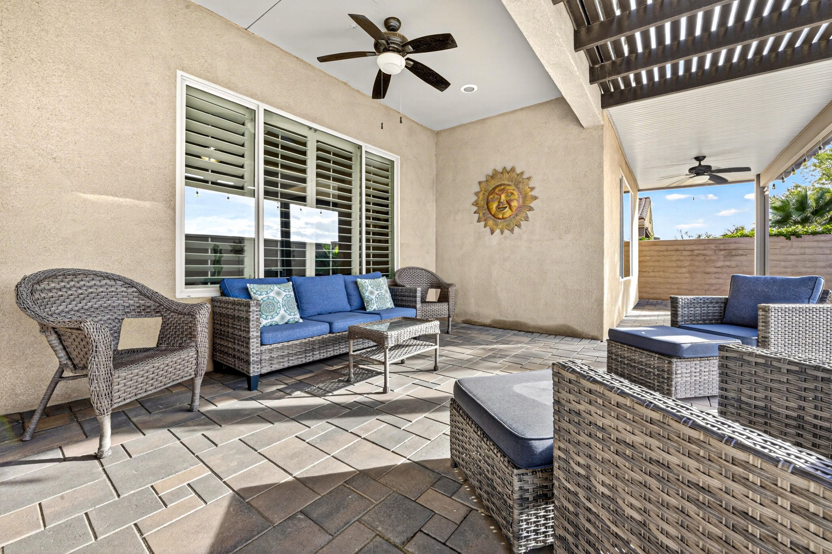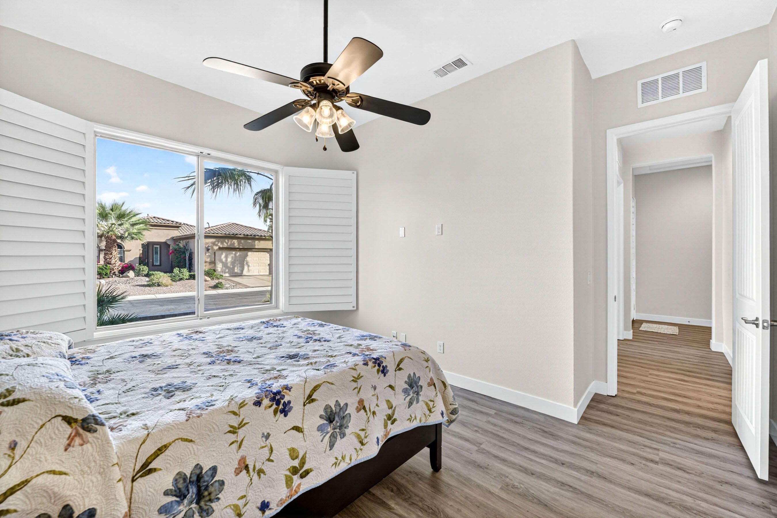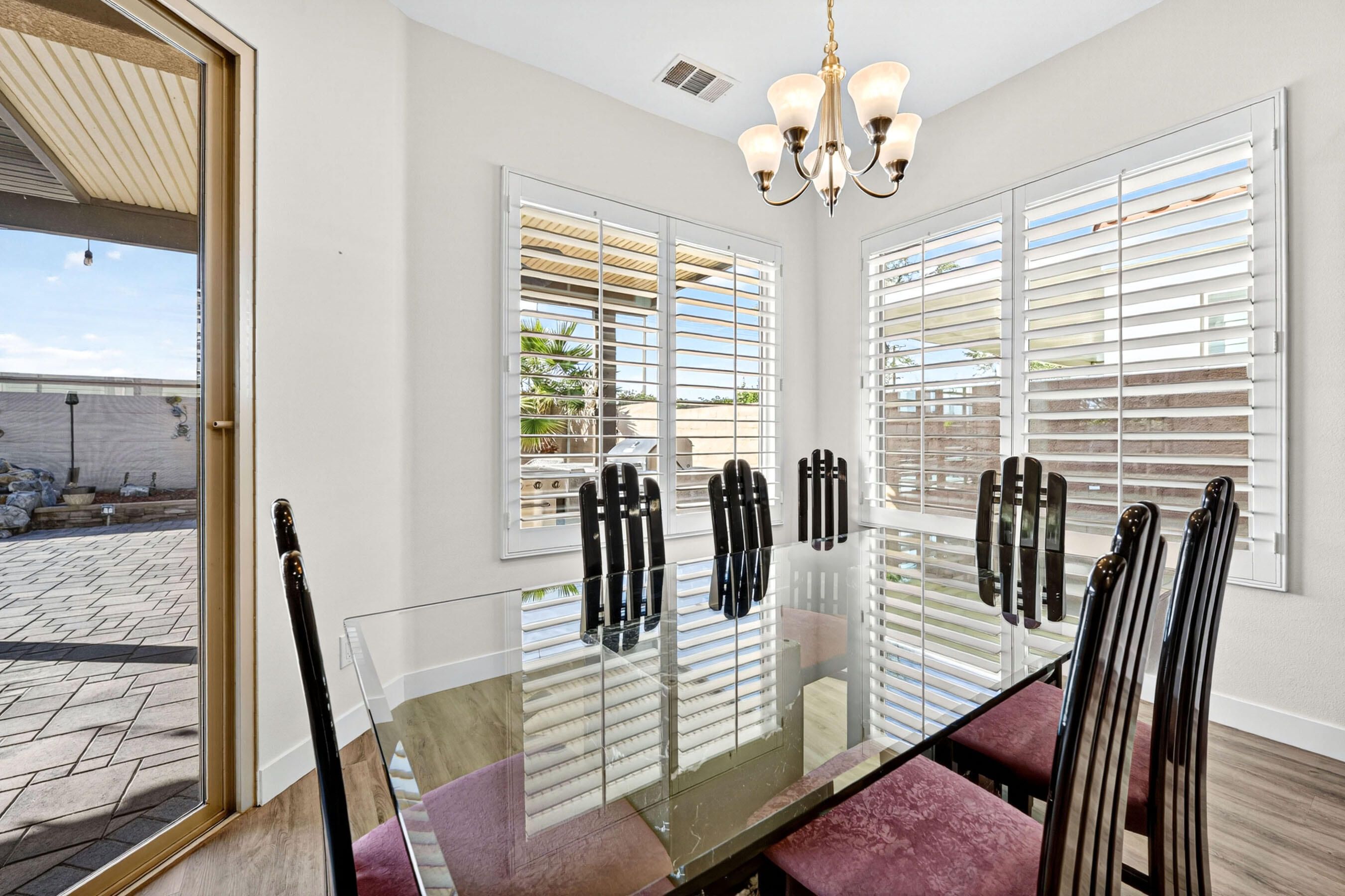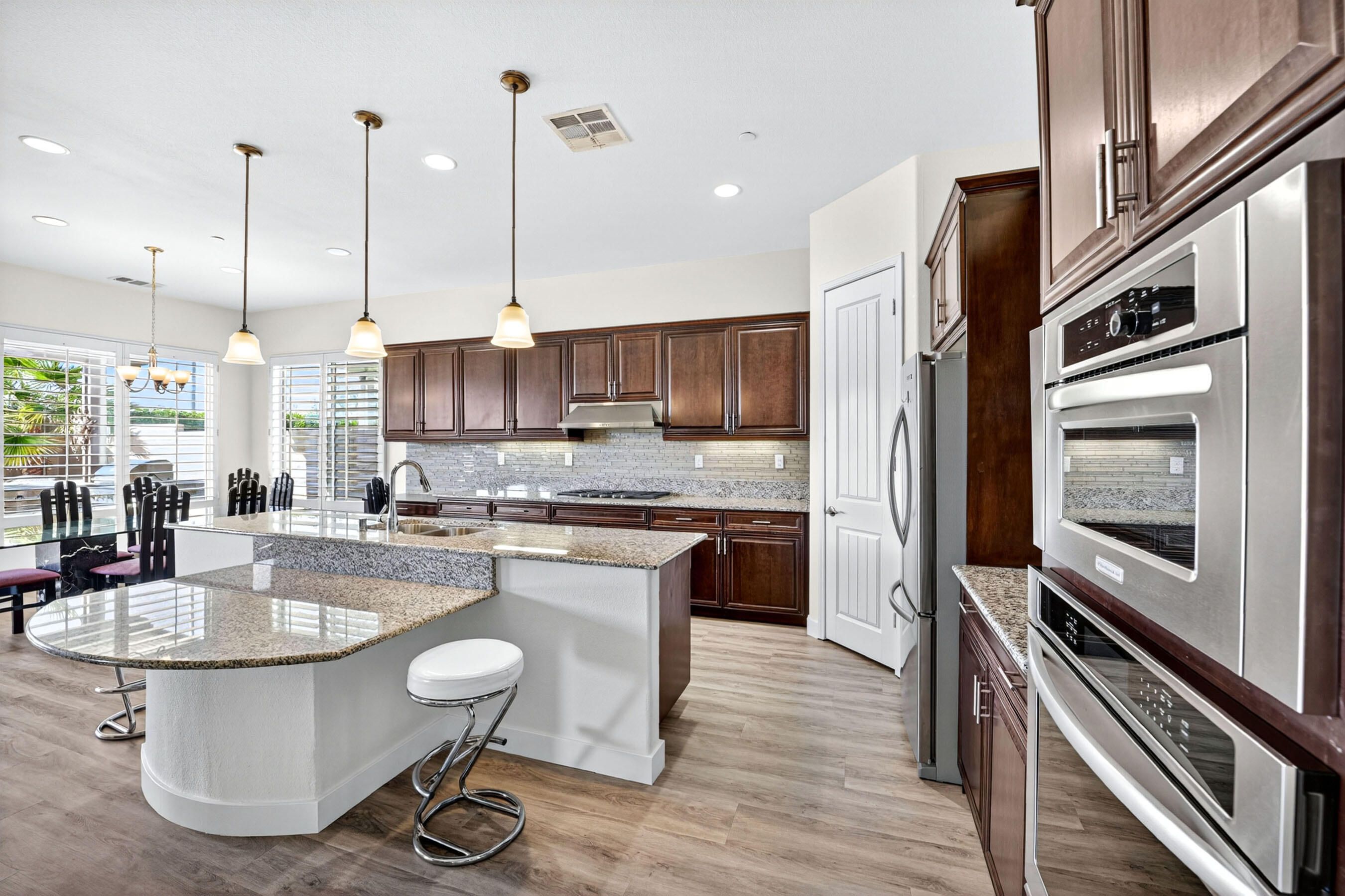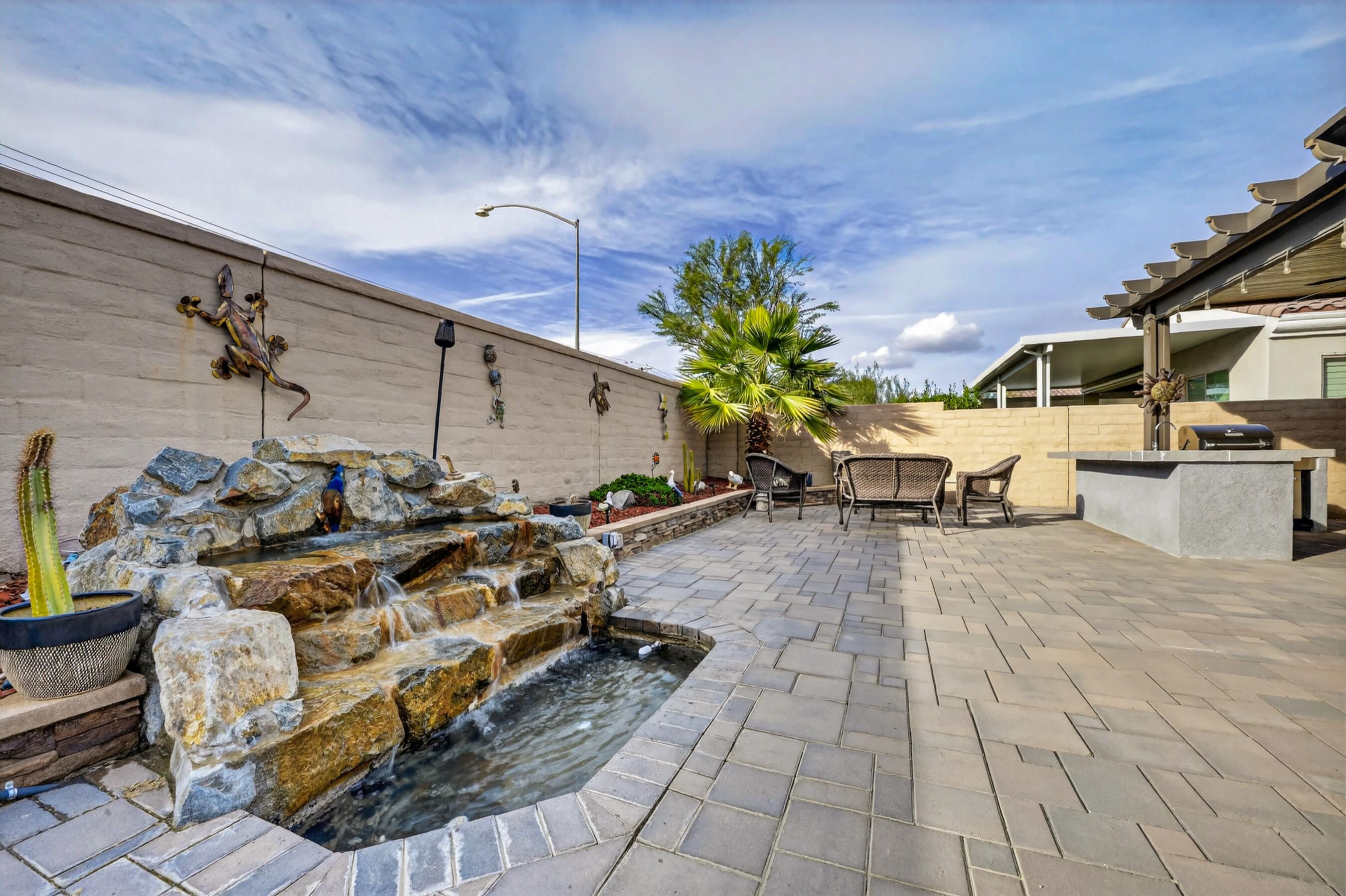 Welcome to resort-style living in this beautifully upgraded Gathering floor plan, located in the desirable Phase 3 of Sun City Shadow Hills. From the moment you arrive, this home impresses with stunning curb appeal, featuring a thoughtfully designed front entry, paver walkways and driveway, modern stone accents, and low-maintenance artificial turf that creates a clean, sophisticated look year-round. Inside, you'll find 2,331 sq. ft. of open, light-filled living space with luxury vinyl plank flooring throughout—a perfect blend of style, durability, and comfort. This well-designed home offers 3 spacious bedrooms and 3 bathrooms. The expansive great room flows seamlessly into the gourmet kitchen, complete with rich cabinetry, granite countertops, stainless steel appliances, double ovens, a large island with seating, and abundant storage—perfect for entertaining or everyday gatherings. Retreat to the luxurious primary suite featuring a spa-inspired bathroom with dual vanities, a soaking tub, walk-in shower, and an oversized walk-in closet. Additional highlights include a beautifully appointed guest bedroom, a separate guest casita-style bedroom with ensuite bath, and ample natural light throughout. Step outside to your private, low-maintenance outdoor retreat featuring an extended covered patio, multiple seating areas, ceiling fans, pavers throughout, a beautiful water feature and a built-in outdoor kitchen—ideal for hosting, relaxing, or enjoying peaceful desert evenings. Located within Sun City Shadow Hills, a premier 55+ community offering two clubhouses, championship golf, fitness centers, pools & spas, pickleball & tennis, social clubs, and endless activities, this home delivers the perfect blend of comfort, style, and active adult living.