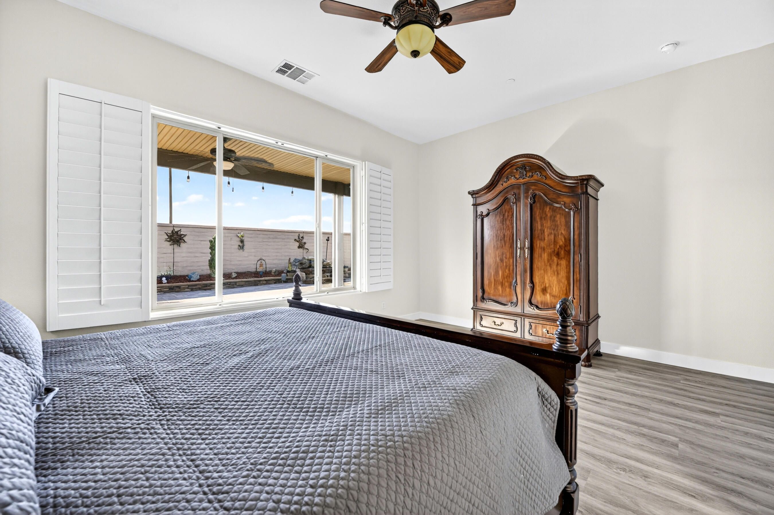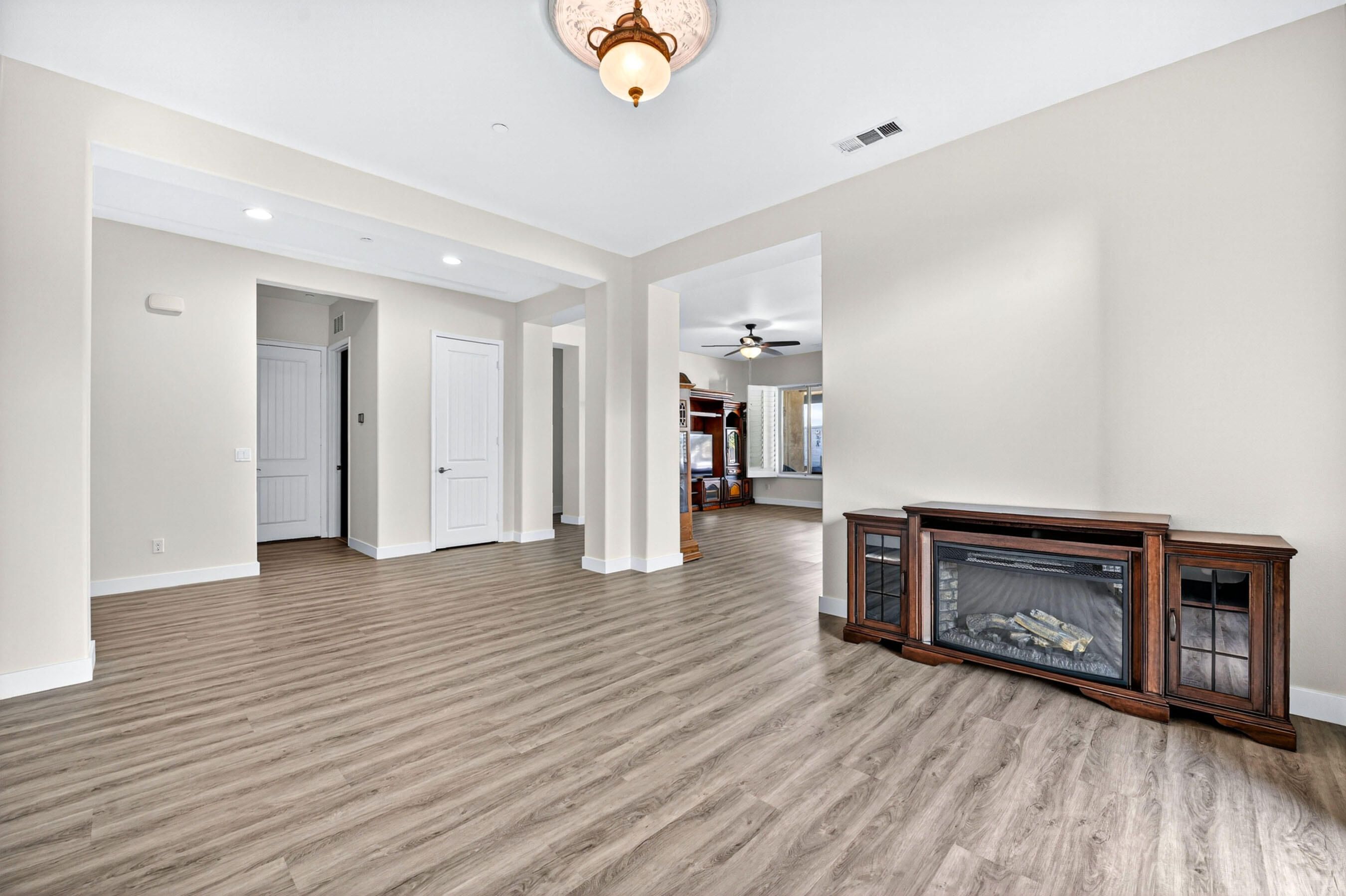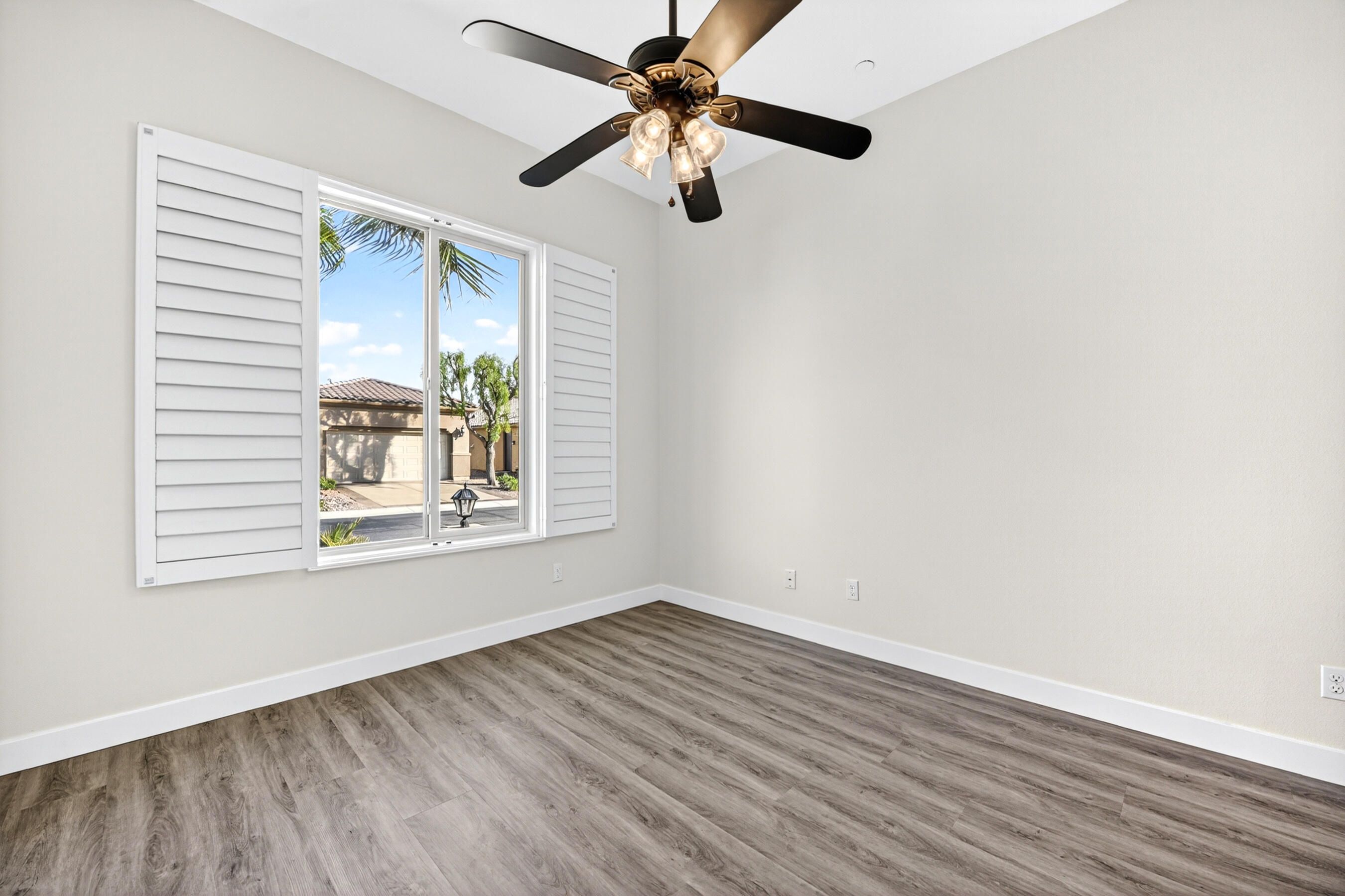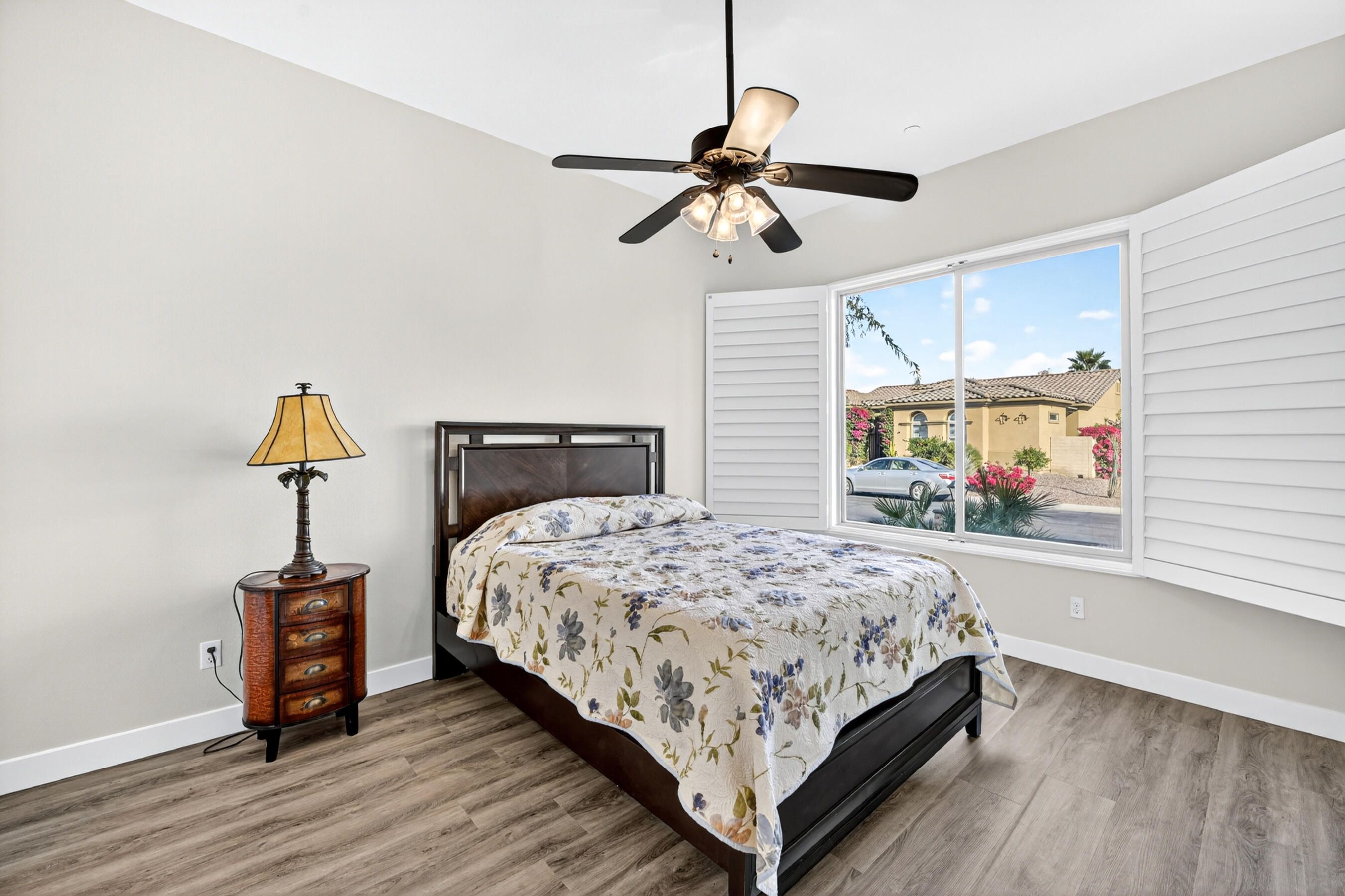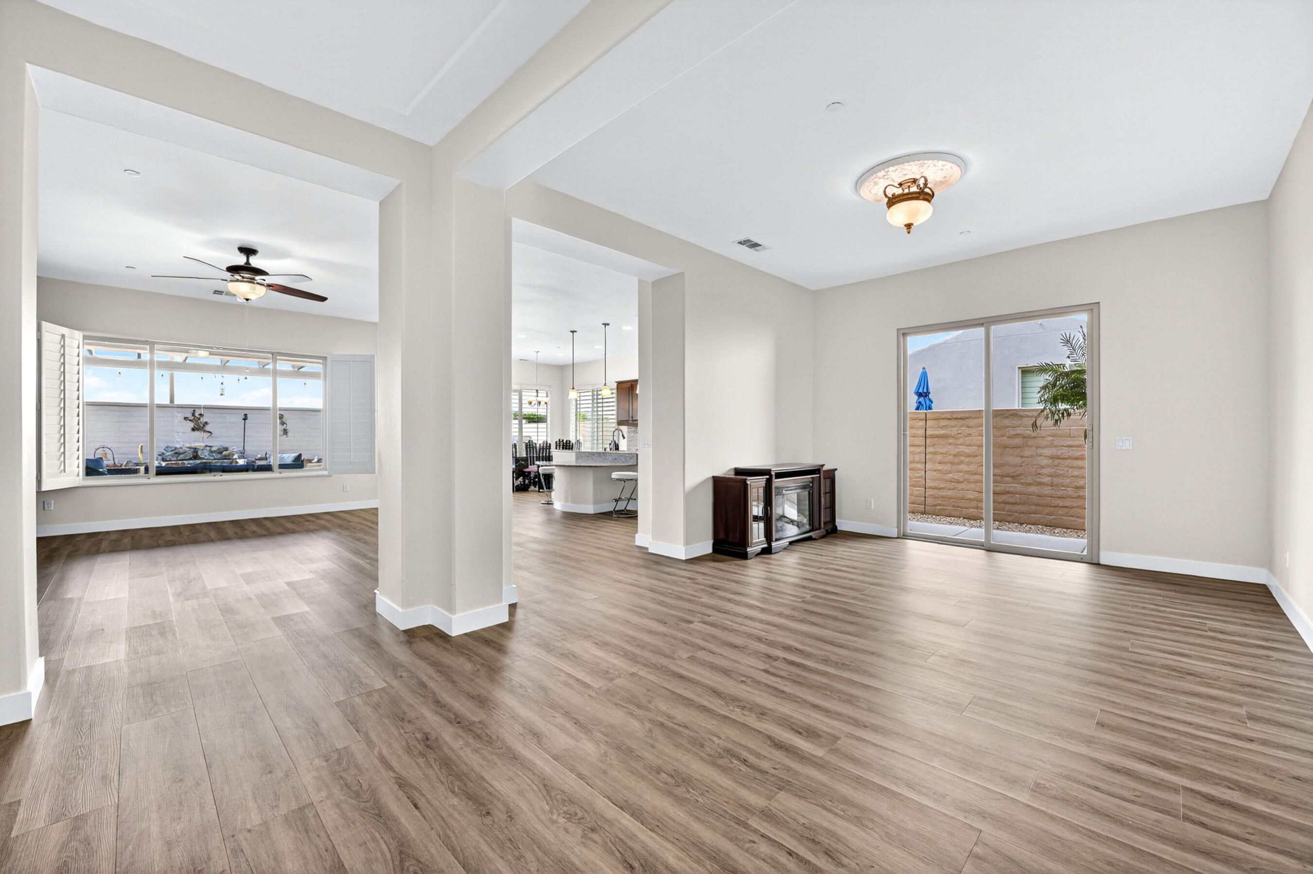 Welcome to resort-style living in this beautifully upgraded Gathering floor plan, located in the desirable Phase 3 of Sun City Shadow Hills. From the moment you arrive, this home impresses with stunning curb appeal, featuring a thoughtfully designed front entry, paver walkways and driveway, modern stone accents, and low-maintenance artificial turf that creates a clean, sophisticated look year-round. Inside, you'll find 2,331 sq. ft. of open, light-filled living space with luxury vinyl plank flooring throughout—a perfect blend of style, durability, and comfort. This well-designed home offers 3 spacious bedrooms and 3 bathrooms. The expansive great room flows seamlessly into the gourmet kitchen, complete with rich cabinetry, granite countertops, stainless steel appliances, double ovens, a large island with seating, and abundant storage—perfect for entertaining or everyday gatherings. Retreat to the luxurious primary suite featuring a spa-inspired bathroom with dual vanities, a soaking tub, walk-in shower, and an oversized walk-in closet. Additional highlights include a beautifully appointed guest bedroom, a separate guest casita-style bedroom with ensuite bath, and ample natural light throughout. Step outside to your private, low-maintenance outdoor retreat featuring an extended covered patio, multiple seating areas, ceiling fans, pavers throughout, a beautiful water feature and a built-in outdoor kitchen—ideal for hosting, relaxing, or enjoying peaceful desert evenings. Located within Sun City Shadow Hills, a premier 55+ community offering two clubhouses, championship golf, fitness centers, pools & spas, pickleball & tennis, social clubs, and endless activities, this home delivers the perfect blend of comfort, style, and active adult living.