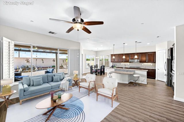 Welcome to resort-style living in this beautifully upgraded Gathering floor plan, located in the desirable Phase 3 of Sun City Shadow Hills. From the moment you arrive, this home impresses with stunning curb appeal, featuring a thoughtfully designed front entry, paver walkways and driveway, modern stone accents, and low-maintenance artificial turf that creates a clean, sophisticated look year-round. Inside, you'll find 2,331 sq. ft. of open, light-filled living space with luxury vinyl plank flooring throughout--a perfect blend of style, durability, and comfort. This well-designed home offers 3 spacious bedrooms and 3 bathrooms. The expansive great room flows seamlessly into the gourmet kitchen, complete with rich cabinetry, granite countertops, stainless steel appliances, double ovens, a large island with seating, and abundant storage--perfect for entertaining or everyday gatherings. Retreat to the luxurious primary suite featuring a spa-inspired bathroom with dual vanities, a soaking tub, walk-in shower, and an oversized walk-in closet. Additional highlights include a beautifully appointed guest bedroom, a separate guest casita-style bedroom with ensuite bath, and ample natural light throughout. Step outside to your private, low-maintenance outdoor retreat featuring an extended covered patio, multiple seating areas, ceiling fans, pavers throughout, a beautiful water feature and a built-in outdoor kitchen--ideal for hosting, relaxing, or enjoying peaceful desert evenings. Located within Sun City Shadow Hills, a premier 55+ community offering two clubhouses, championship golf, fitness centers, pools & spas, pickleball & tennis, social clubs, and endless activities, this home delivers the perfect blend of comfort, style, and active adult living.
