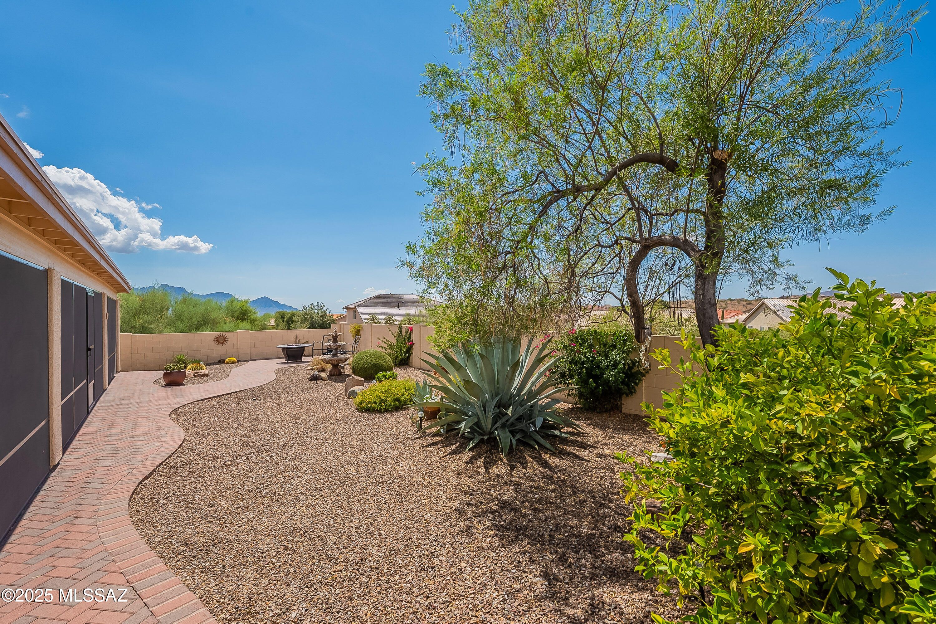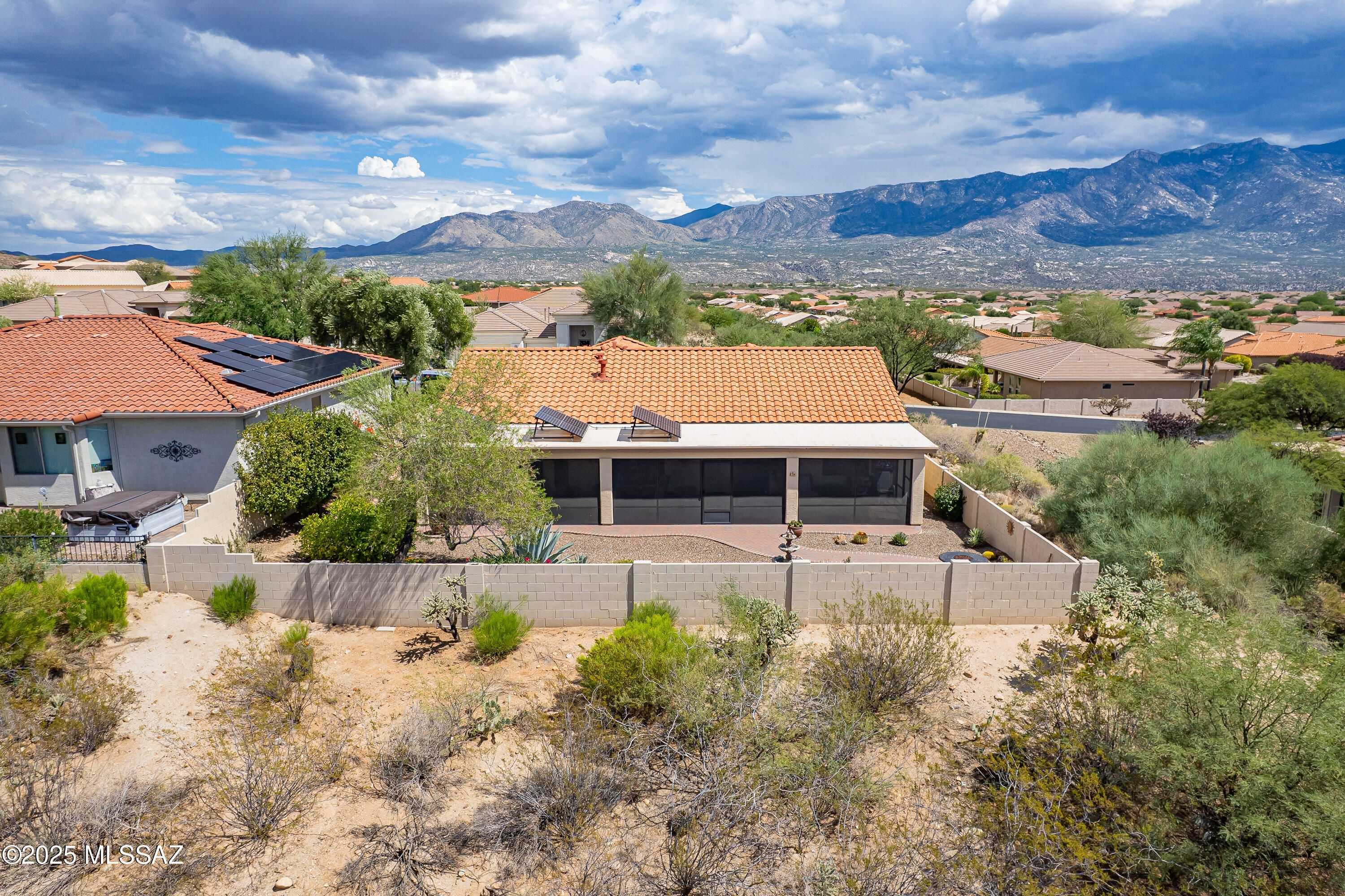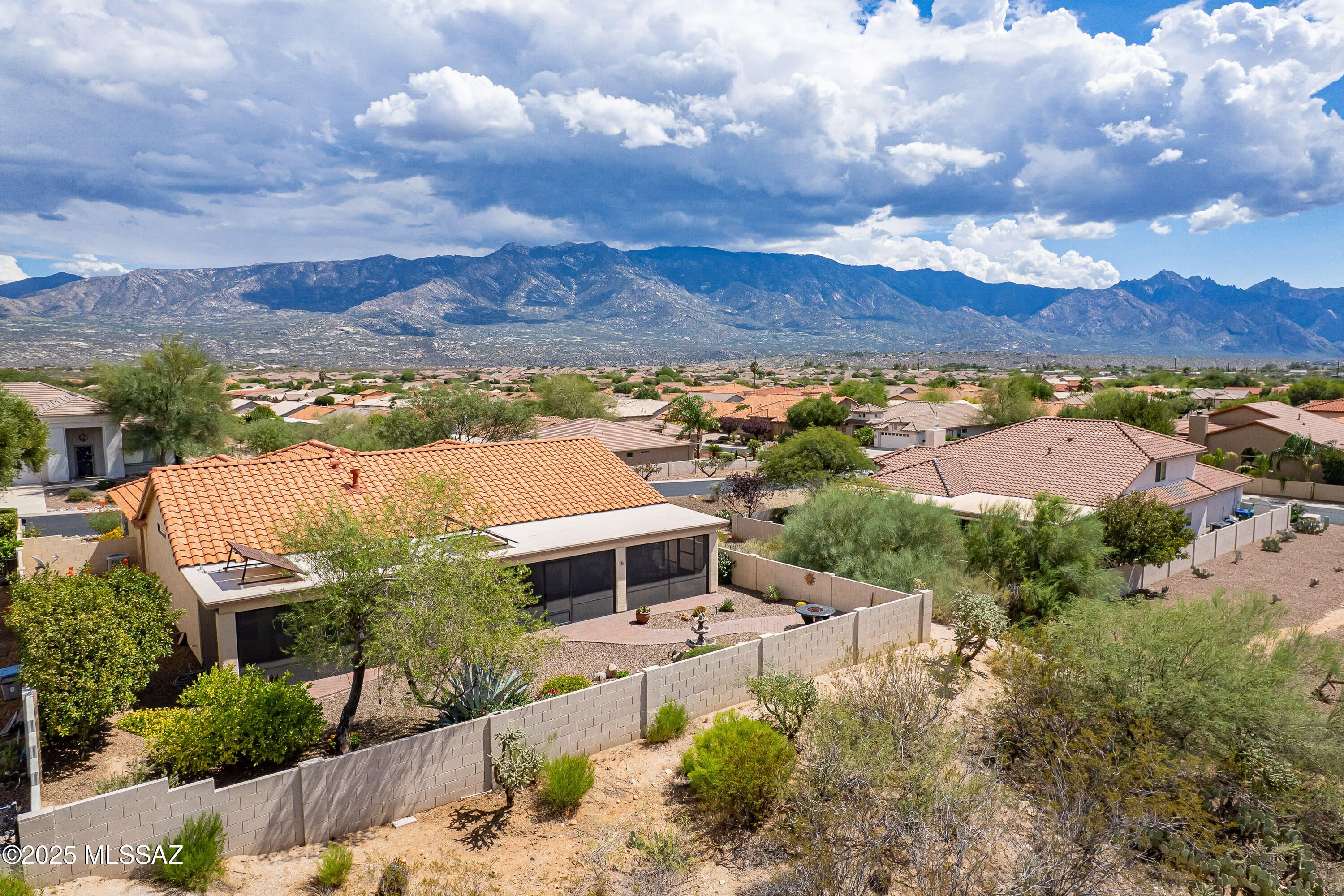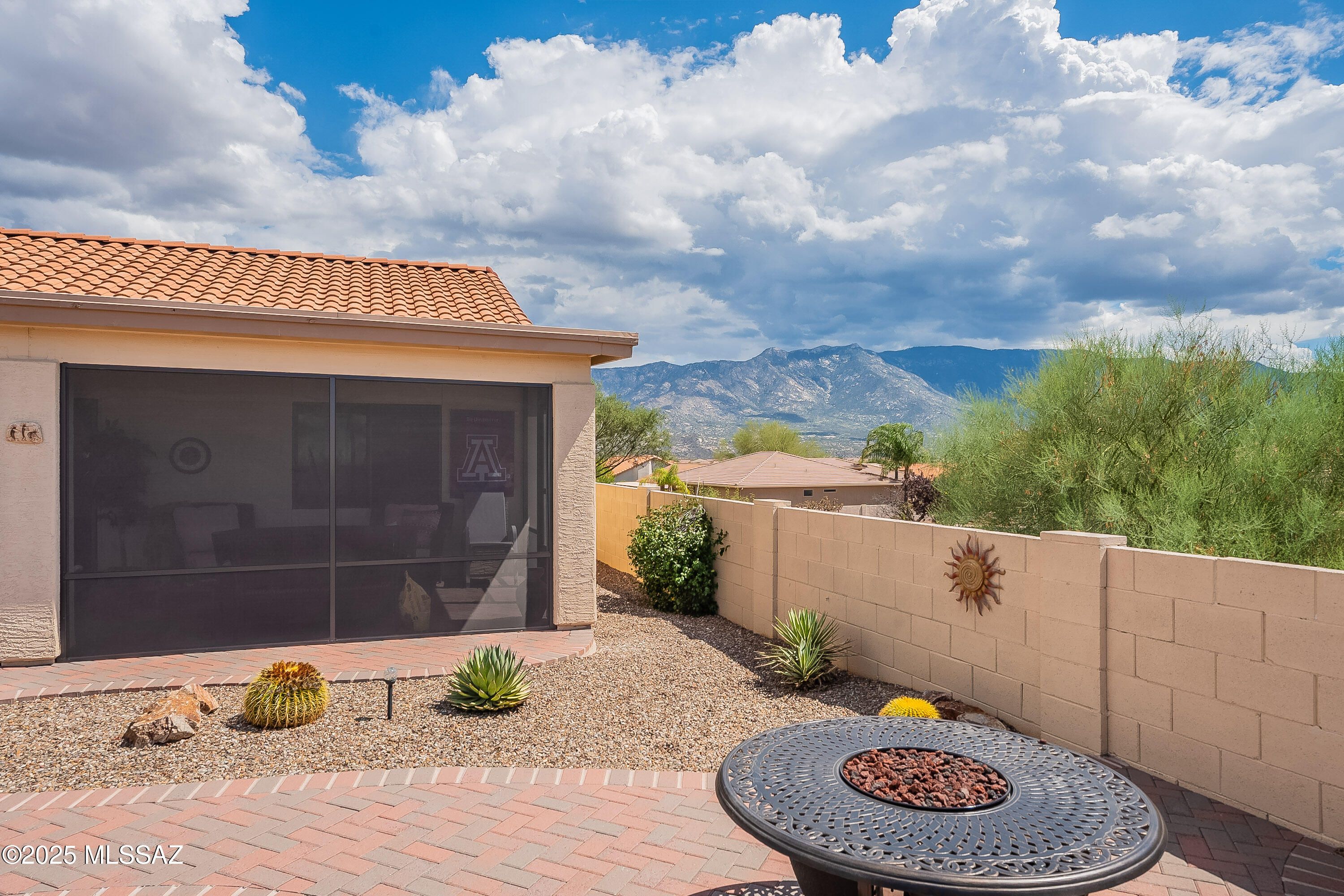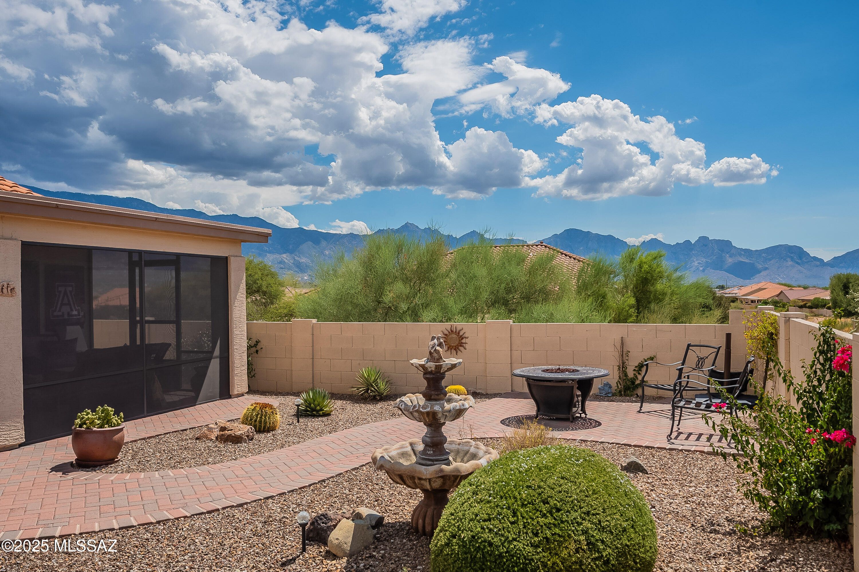 This lovely Laredo has a beautiful front walled paved patio w/wrought iron decorative gate and fabulous Mt Views. Ceramic tile in beautiful kitchen w/ granite counters, breakfast bar, center island and full pantry. Laundry room is off kitchen. Kitchen overlooks family room w/ hard wood floors, fireplace a sliding glass door & large window. Primary bedroom has ceramic tile, bay window, w/lovely view, very private. Primary bathroom has ceramic tile, double vanity and large walk-in closet. Split bedroom plan. 2nd bedroom has hard-wood floors, large sliding window and double door closet. Bright airy den w/ceramic tile and Mt Views. Paved patio and seating area back-up to a wash for extra privacy. Screened in patio. (600 sq ft). Extended garage w/storage cabinets. Solar is owned