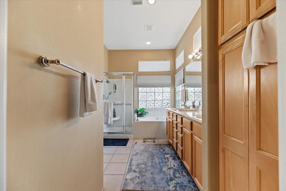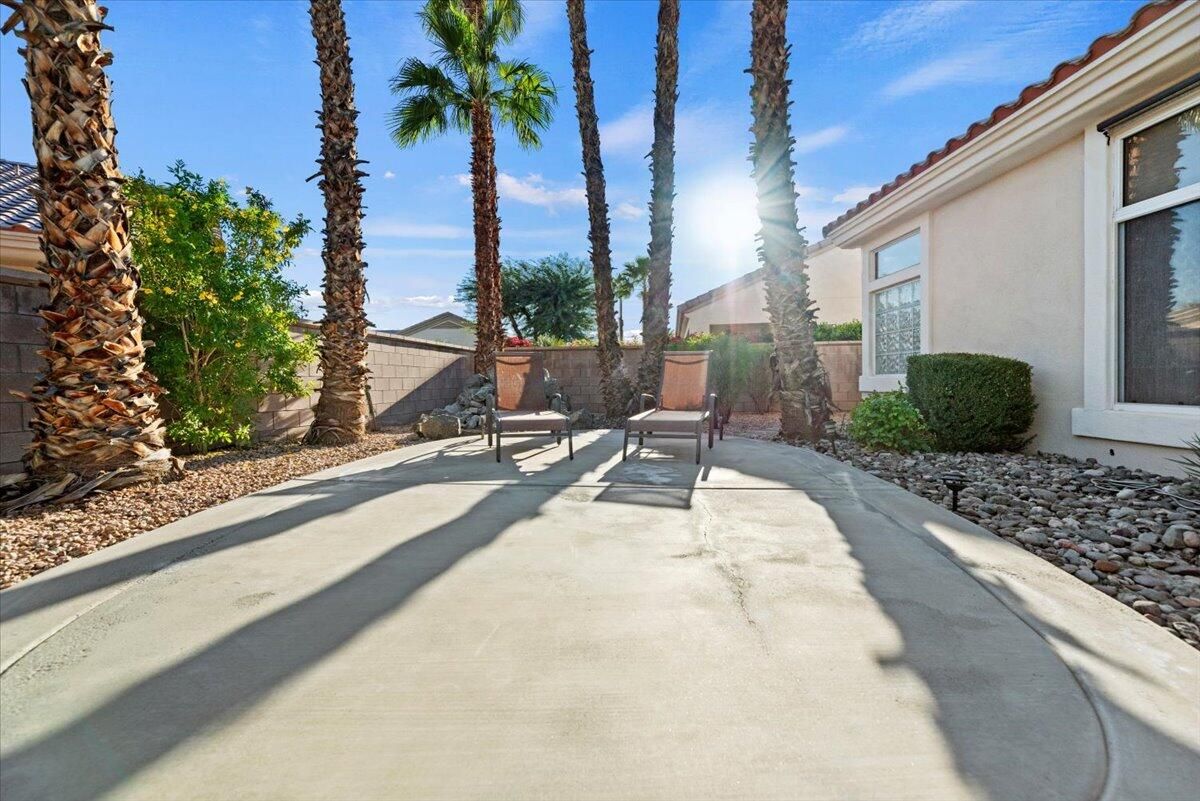 This delightful Sun City Palm Desert home has curb-appeal in leaps and bounds with a stunning grand entrance and front patio area. Inside, this 2042 SF (est.) Casablanca floor plan has one small cozy carpeted area in the living room while the rest of the home is floored with chiseled edge tile and new flooring. The kitchen features a breakfast bar, double wall ovens, an electric cooktop and a brushed nickel kitchen sink with new gorgeous granite counter tops. The spacious den leads to an additional hobby room or office. The spacious master suite has a large walk-in closet. The master bath has a stall shower, a separate jacuzzi tub and dual sinks with brushed nickel fixtures. The 2 car garage has room for abundant storage. This popular model has a spacious private yard with plentiful sunshine, multiple sitting areas, desert rock landscaping, a covered patio with ceiling fans. The Backyard also features a beautiful tranquility waterfall. Sun City also offers three clubhouses with wonderful amenities that include resort-style pools, an indoor lap pool, spas, multiple fitness facilities, billiard tables, pickle-ball courts, bocce ball, tennis courts, and a beautiful 18 hole putting course that circles a lake. Also a softball field and much more! Closets have been customized to maximize usage. New Dual AC units