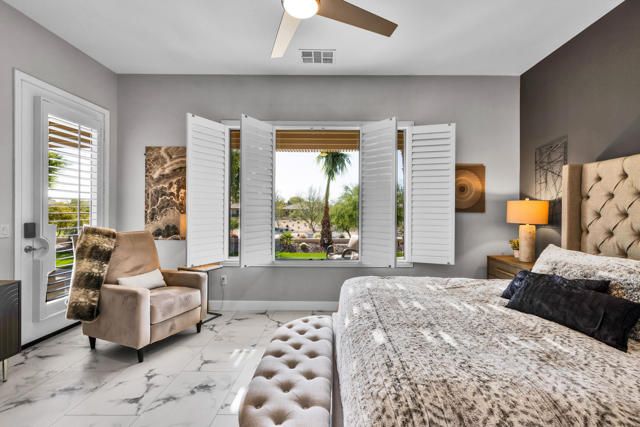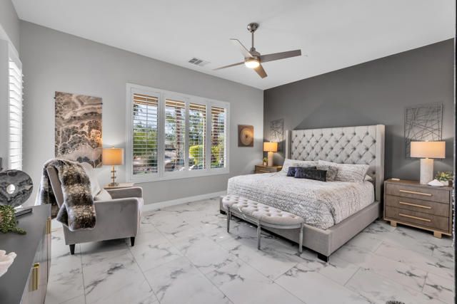 Gorgeous new listing Sun City Shadow Hills 3rd phase. Pavered driveway & walkway leads to beautifully upgraded & meticulously maintained 3 bedroom 3 bath open floor plan The Gathering model situated on the 2nd hole of the North Course w/expansive golf & mountain views. South facing home features high ceilings, 18''x36'' LVT (luxury vinyl tile) flooring throughout except for newer carpet in the guest bedrooms & main closet, new baseboards, custom interior & exterior paint, upgraded lighting, plumbing & electrical, custom imported light fixtures, motorized blinds, shutters & drapes. Great room, kitchen, breakfast area and main bedroom all w/views of the golf course.Kitchen has beautiful cabinetry w/pull out shelves & built in drawer for trash., custom back splash,granite counter tops, a large center island that seats four comfortably, pendant lights & under counter lighting. There is an adjoining breakfast area plus a formal dining room with a custom wall enhancement & a view of an outside patio seating area with a fountain. Main bedroom suite with newly redone bathroom. 43''x120'' large walk in shower w/ marble like tile & clear shower glass wall, double sinks w/quartz countertops, new fixtures & adjoining walk in closet with built-ins.Separate private guest wing with two bedrooms and two bathrooms. Laundry room has sink & cabinets. Oversized garage w/epoxy floor, extra lighting, motion detector light, exhaust fan & overhead racks. A large pavered & epoxyed patio w/alumawood cover & fountain to enjoy the beautiful, serene golf course views. Upgraded landscape, irrigation & turf grass Sun City Shadow Hills is a vibrant, active adult community w/clubhouses, pools, spas, golf, tennis, pickle ball, & bocce courts, tons of clubs activities & entertainment.This home is a ''must see''. Shows like a model. Sellers have done beautiful upgrades and maintained it like new..