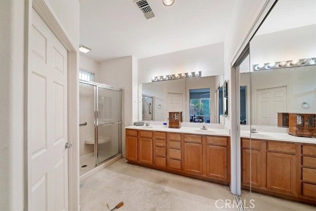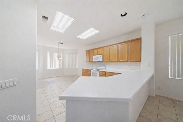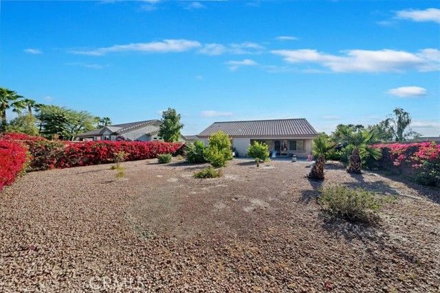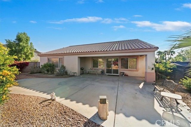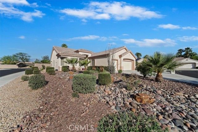 Located in the highly coveted, beautiful Del Webb community of Sun City Palm Desert this sought after Saint Croix plan sits on one of the largest and most desirable corner lots in the community. Step inside through the tiled foyer that opens to a spacious great room filled with natural light, perfectly connected to the adjacent formal dining area. The kitchen is a chef’s delight, featuring solid surface countertops, a convenient breakfast peninsula, and a center island prep station. A bright breakfast nook provides the ideal spot to enjoy your morning coffee. This versatile layout offers three bedrooms, or two bedrooms plus a den, and is uniquely enhanced by the addition of a separate bonus room with both interior access and direct entry from the garage—perfect for guests, hobbies, a studio, or private office space. The generous primary suite easily accommodates a large furniture set and includes room for a comfortable sitting area. The ensuite bath features dual sinks and a walk-in shower. Outdoor living is just as inviting with both a covered patio and an extended uncovered patio, ideal for entertaining. The backyard is beautifully framed by a flowering perimeter hedge and offers a rare opportunity to design your own outdoor oasis with space for a private pool, fire pit, game area, and more. Additional highlights include a two-car garage plus dedicated golf cart parking. Residents of Sun City Palm Desert enjoy resort-style living with incredible amenities including golf courses, lakes, waterfalls, swimming pools, clubhouses, restaurants, a library, technology center, bocce ball, tennis and sports courts, a theater, ballroom, and even a fishing lake. This is truly what desert resort retirement living is all about.
