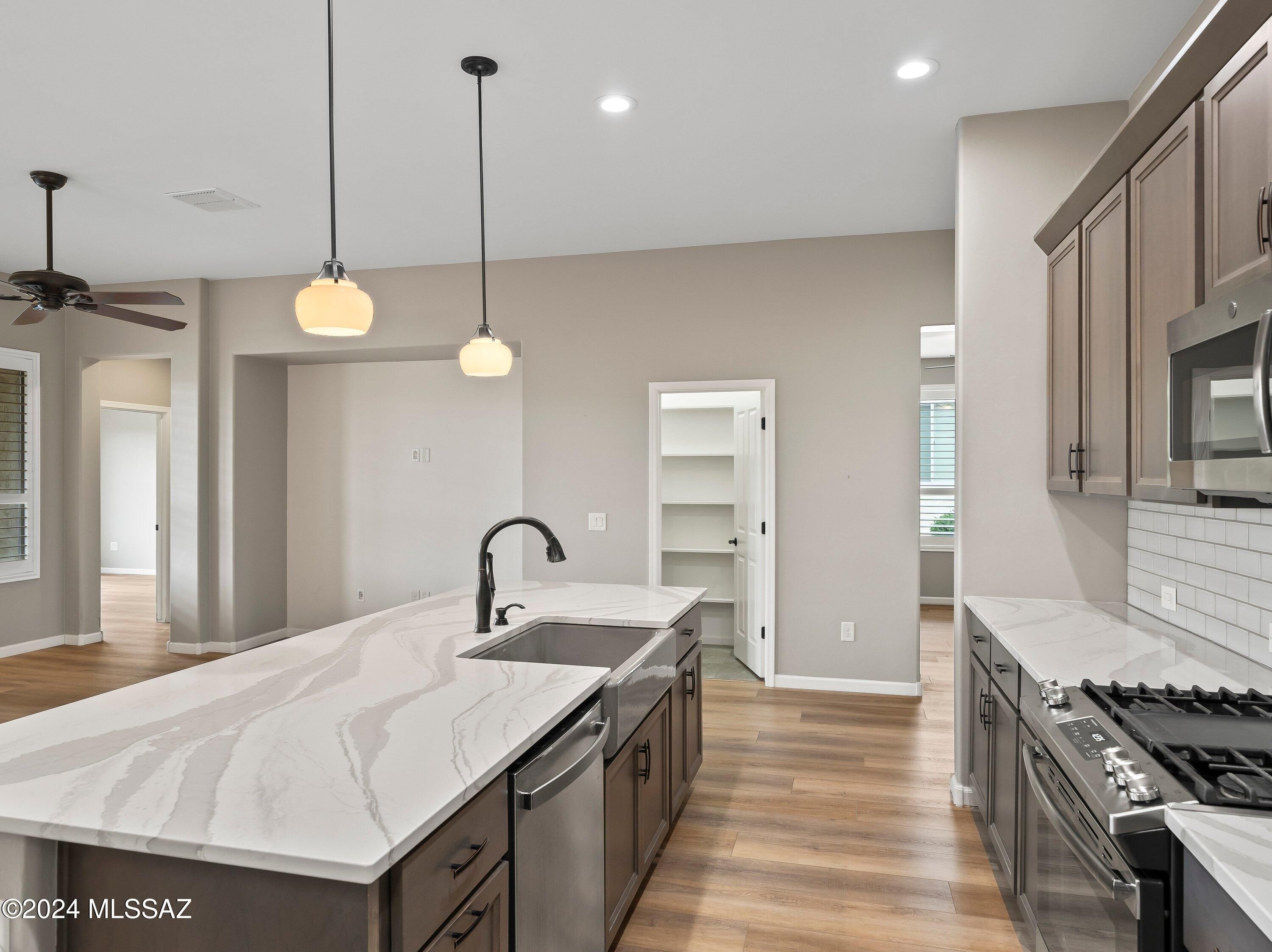 Your home is waiting. This 2-bedroom, 2-bath + den VIVA model is ready for you to move on in! The open-concept floor plan is enhanced by plank flooring throughout, offering a modern and easy-to-maintain space. The kitchen features a gas stove and stainless steel appliances, making cooking a breeze. Just off the kitchen is a convenient laundry room with a washer and dryer included, plus ample cabinet storage.Step outside onto your paved patio, ideal for relaxing and enjoying Arizona's stunning evenings. The 2-car garage is a real highlight, with a protective coating on the concrete floor, a utility sink, and a water softener for added convenience.The Unit 50 Villa Association covers exterior painting, landscaping, irrigation, and roof maintenance.