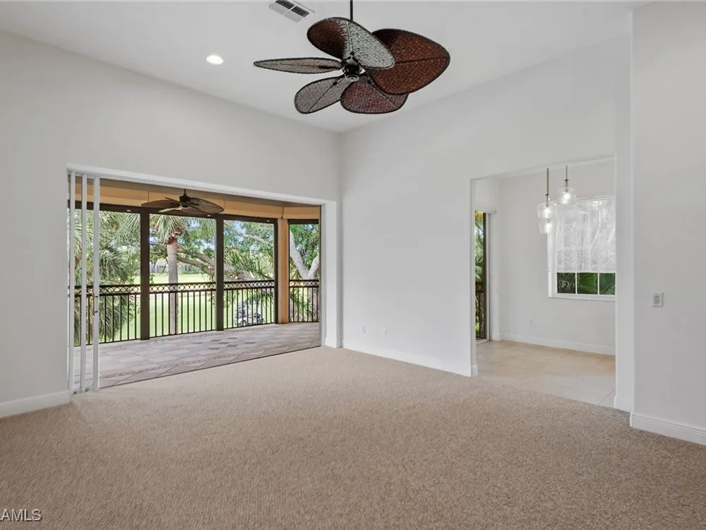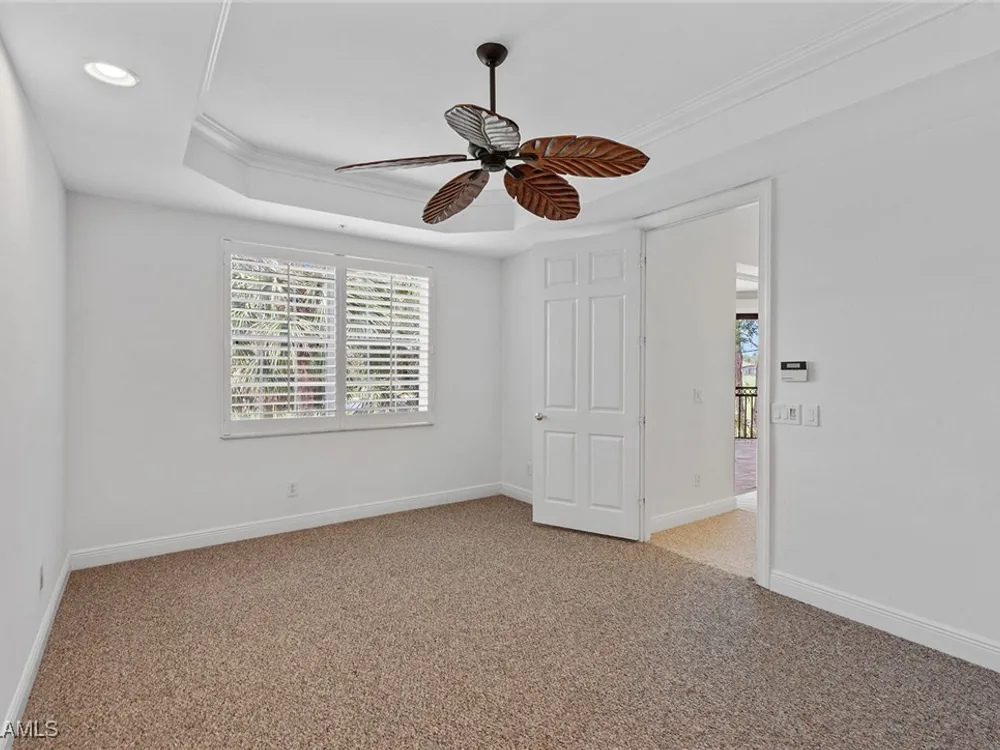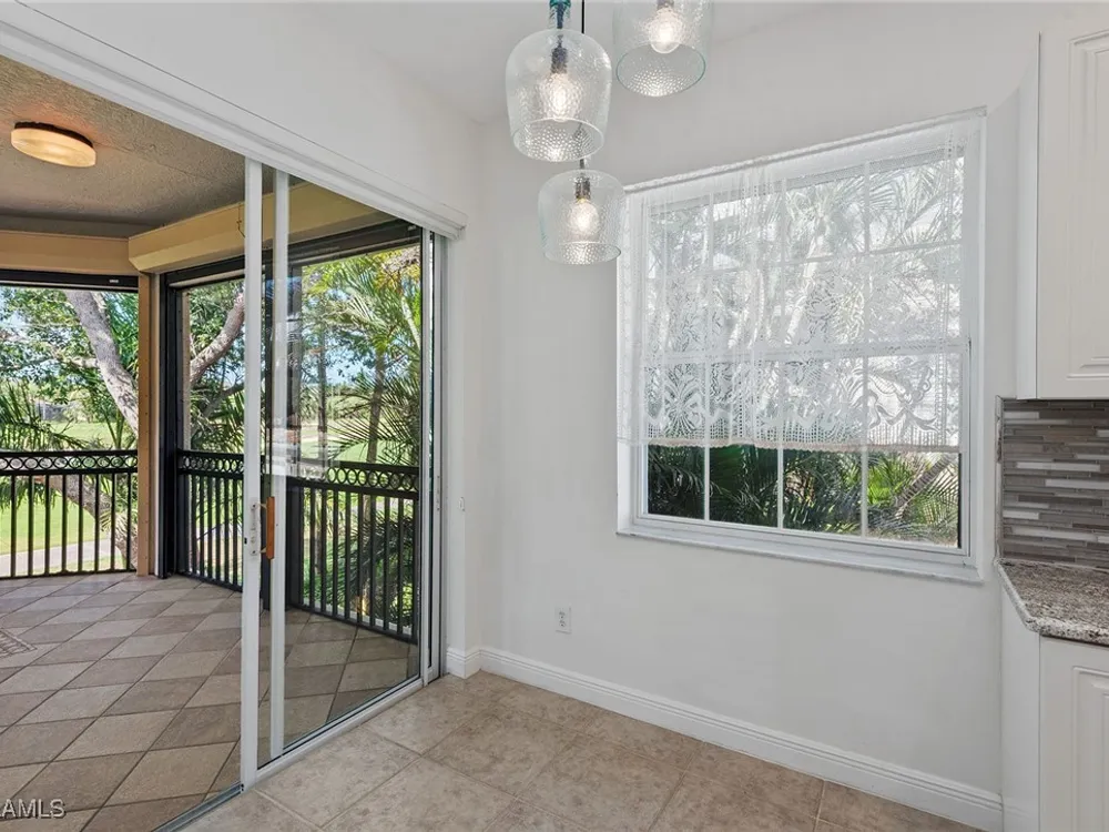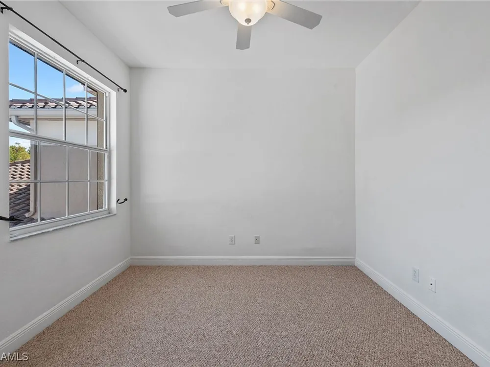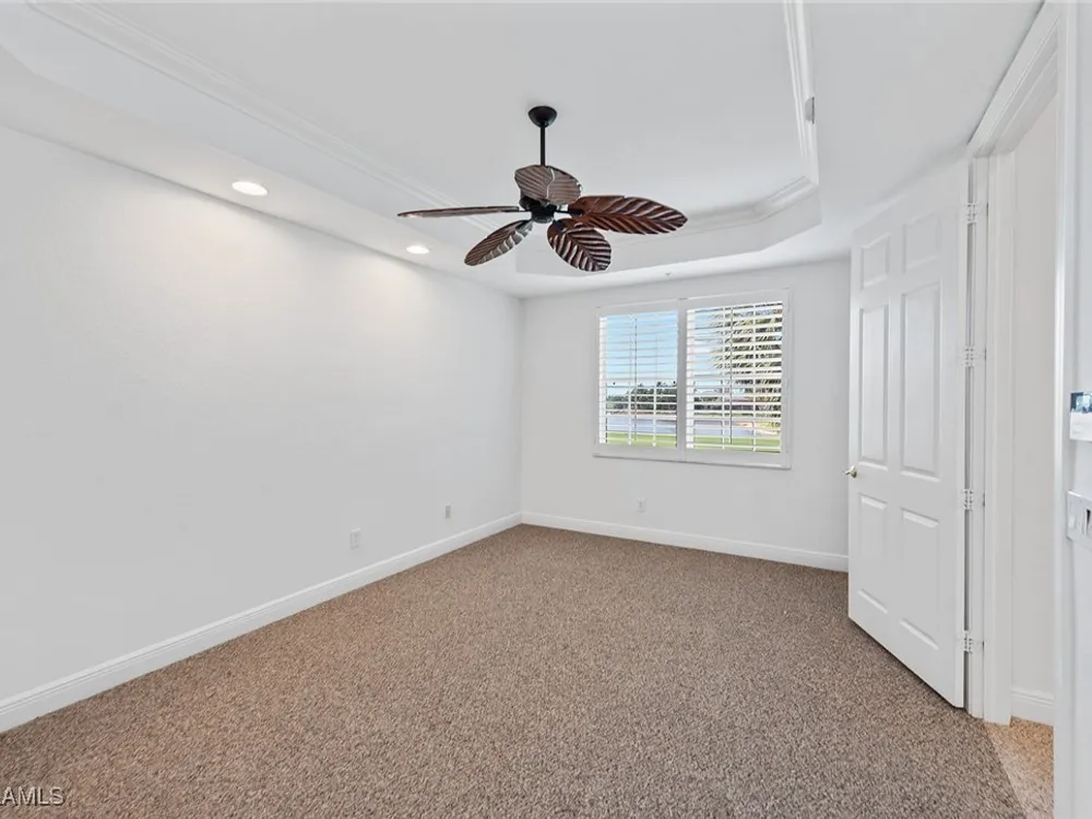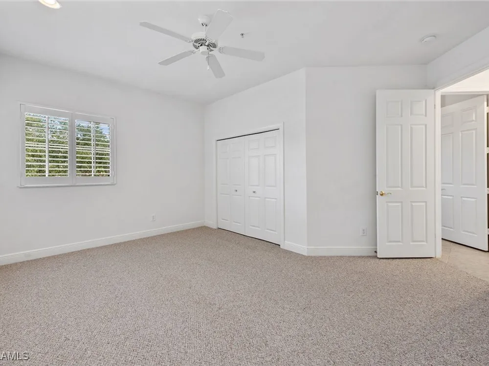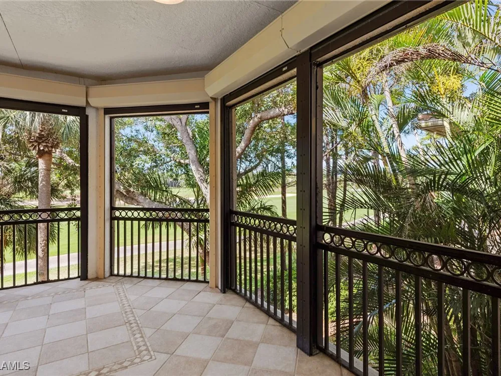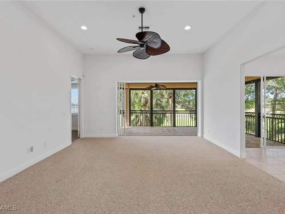 Are you looking for sun-filled southern exposure and stunning Rookery golf course and water views framed by swaying palms? This spacious second-floor end-unit coach home with a two-car garage in the desirable Deer Crossing village of Fiddler’s Creek offers both. Enjoy tranquil outdoor living from the covered screened lanai with tile flooring, electric storm shutters, and a peaceful backdrop of lush tropical landscaping overlooking the water and golf course – an ideal setting for relaxing or entertaining. Inside, the residence offers three bedrooms, a den, two baths and a two-car garage. Finishes include diagonal tile flooring and plush carpeting, recessed lighting, white plantation shutters, and tropical-inspired Tommy Bahama-style ceiling fans. The kitchen is both stylish and functional, featuring granite countertops, a mosaic glass tile backsplash, white shaker-style cabinetry and a window above the sink for natural light. Stainless steel LG appliances include a French-door refrigerator with an icemaker, range, microwave and dishwasher. The adjacent dining area and living room both offer access to the lanai, blending indoor and outdoor living. The owner’s suite features a tray ceiling, generous closet space, and a spacious en-suite bath with a dual-sink vanity, full-width mirror and a walk-in shower. Two guest bedrooms are located near a full bath with a shower-tub combo, ideal for hosting visitors. The den, which includes pocket doors to both the hallway and kitchen, offers flexible use as a study or home office. A dedicated laundry room includes overhead shelving, a utility sink, a washer and a dryer. The two-car garage features built-in shelving and a window for natural light. Additional peace of mind comes with a newer HVAC system. Deer Crossing offers gorgeous landscaping, a beautiful village pool and ample guest parking spaces. Located in the award-winning, gated community of Fiddler’s Creek, residents enjoy a full activity and event calendar with access to resort-style amenities including a luxurious clubhouse, spa services, active tennis and pickleball programs with leagues and clinics, bocce, fine and casual dining, and a state-of-the-art fitness center with trainers and classes. Optional memberships to the newly renovated golf course with immediate membership available and a spectacular brand-new private golf clubhouse. Beach club and marina memberships are also available. Miles of sidewalks perfect for walking, jogging and bicycling, surrounded by stunning flowers, trees, lakes and greenery. All of this is just minutes from downtown Naples and Marco Island, offering convenient access to beaches, yacht clubs, grocery shopping, boutiques, parks, restaurants, the executive airport and all popular Southwest Florida attractions. This is your opportunity to live a truly exceptional lifestyle. CDD bond paid in full.