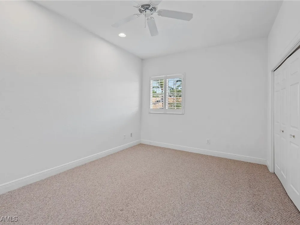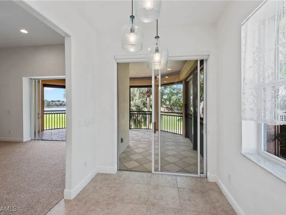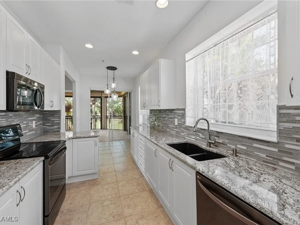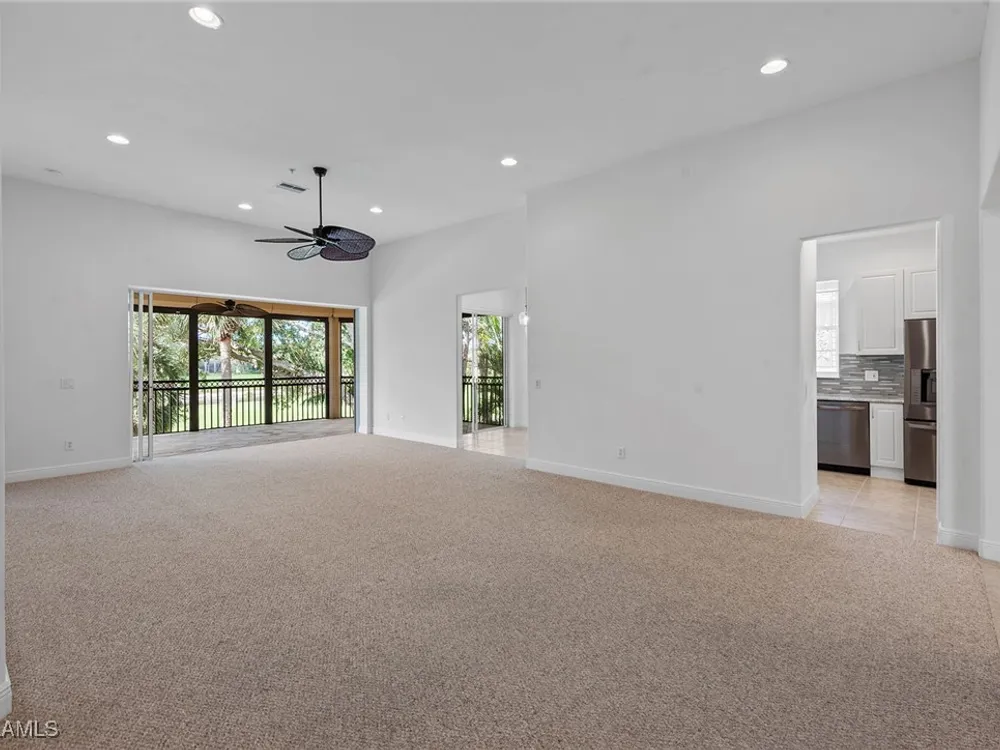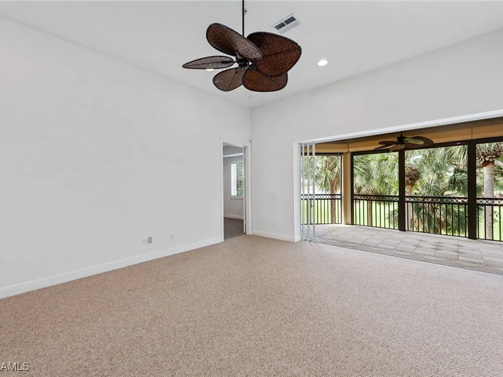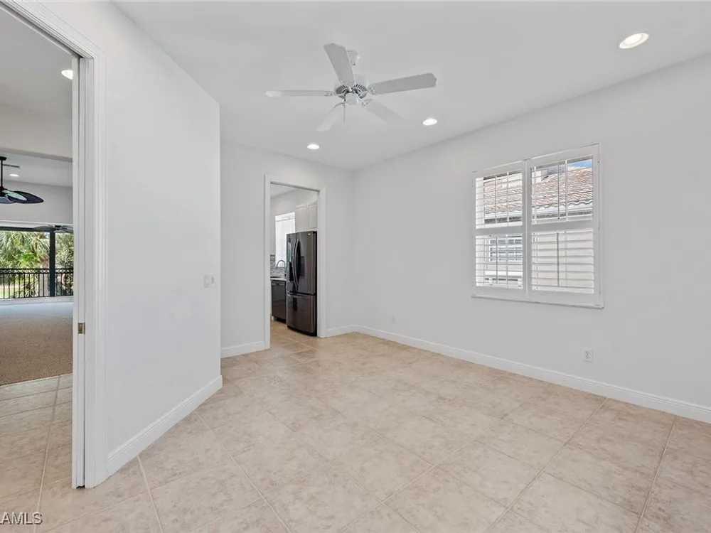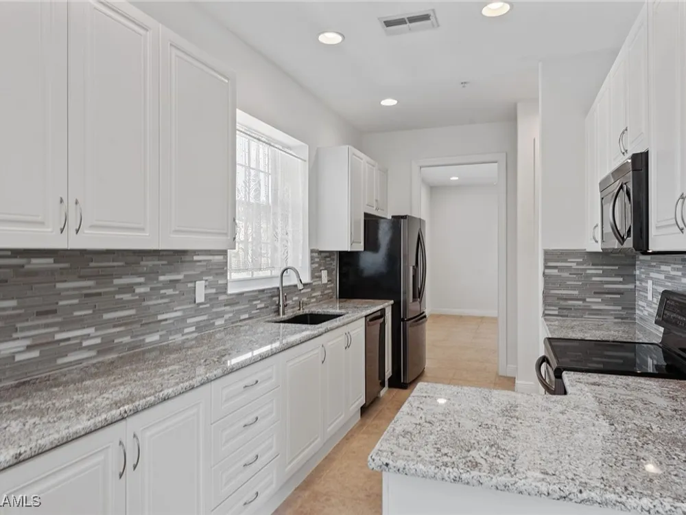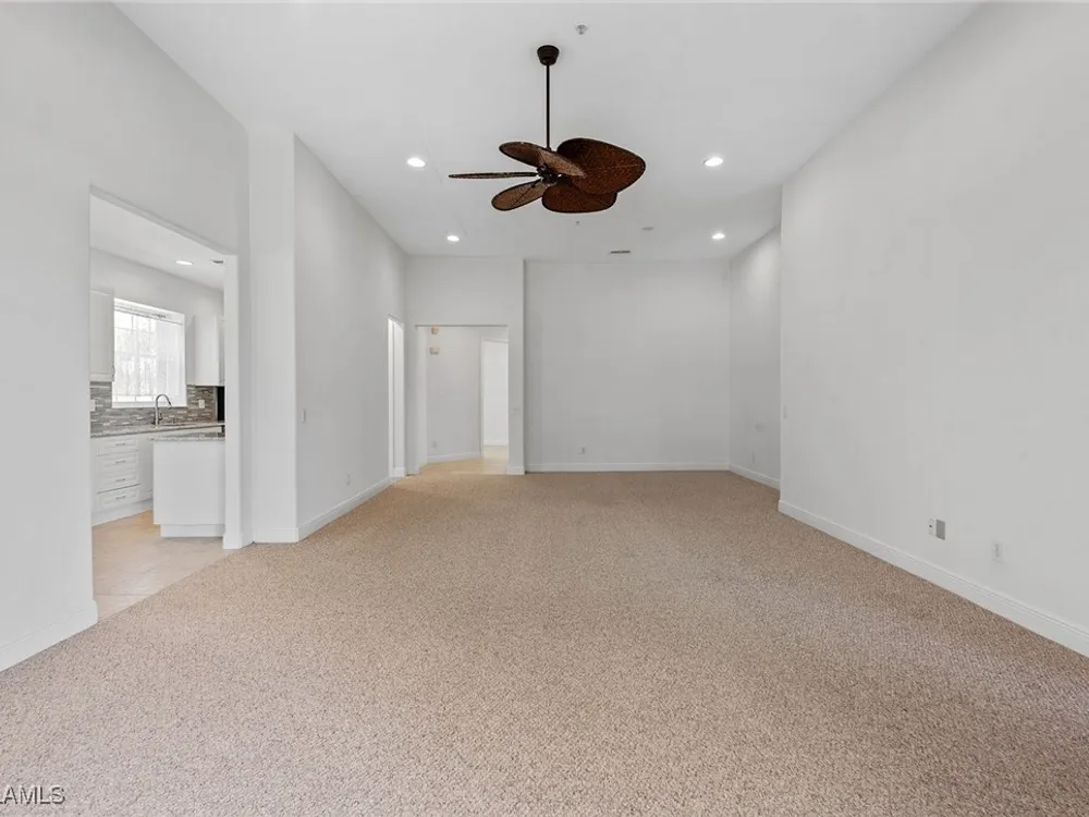 Are you looking for sun-filled southern exposure and stunning Rookery golf course and water views framed by swaying palms? This spacious second-floor end-unit coach home with a two-car garage in the desirable Deer Crossing village of Fiddler’s Creek offers both. Enjoy tranquil outdoor living from the covered screened lanai with tile flooring, electric storm shutters, and a peaceful backdrop of lush tropical landscaping overlooking the water and golf course – an ideal setting for relaxing or entertaining. Inside, the residence offers three bedrooms, a den, two baths and a two-car garage. Finishes include diagonal tile flooring and plush carpeting, recessed lighting, white plantation shutters, and tropical-inspired Tommy Bahama-style ceiling fans. The kitchen is both stylish and functional, featuring granite countertops, a mosaic glass tile backsplash, white shaker-style cabinetry and a window above the sink for natural light. Stainless steel LG appliances include a French-door refrigerator with an icemaker, range, microwave and dishwasher. The adjacent dining area and living room both offer access to the lanai, blending indoor and outdoor living. The owner’s suite features a tray ceiling, generous closet space, and a spacious en-suite bath with a dual-sink vanity, full-width mirror and a walk-in shower. Two guest bedrooms are located near a full bath with a shower-tub combo, ideal for hosting visitors. The den, which includes pocket doors to both the hallway and kitchen, offers flexible use as a study or home office. A dedicated laundry room includes overhead shelving, a utility sink, a washer and a dryer. The two-car garage features built-in shelving and a window for natural light. Additional peace of mind comes with a newer HVAC system. Deer Crossing offers gorgeous landscaping, a beautiful village pool and ample guest parking spaces. Located in the award-winning, gated community of Fiddler’s Creek, residents enjoy a full activity and event calendar with access to resort-style amenities including a luxurious clubhouse, spa services, active tennis and pickleball programs with leagues and clinics, bocce, fine and casual dining, and a state-of-the-art fitness center with trainers and classes. Optional memberships to the newly renovated golf course with immediate membership available and a spectacular brand-new private golf clubhouse. Beach club and marina memberships are also available. Miles of sidewalks perfect for walking, jogging and bicycling, surrounded by stunning flowers, trees, lakes and greenery. All of this is just minutes from downtown Naples and Marco Island, offering convenient access to beaches, yacht clubs, grocery shopping, boutiques, parks, restaurants, the executive airport and all popular Southwest Florida attractions. This is your opportunity to live a truly exceptional lifestyle. CDD bond paid in full.