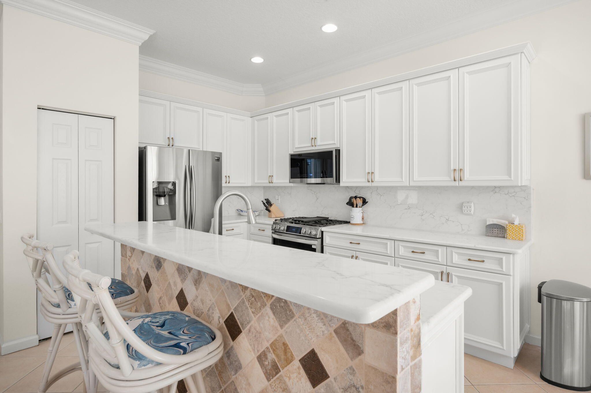 Magnificent and updated Port St Lucie 3 bedrooms, 2 bathrooms single-family home offers a thoughtfully designed living space, blending comfort, elegance, and peace of mind. Step inside to find ceramic tile flooring throughout the main living areas and new carpet in all bedrooms, complemented by fresh interior paint, crown molding throughout, recessed lighting, and a desirable split floor plan. The fully renovated kitchen is a standout, featuring white all-wood cabinetry, white quartz countertops and backsplash, pull-out pantry shelving, an extra-large stainless-steel sink with new under-sink water filtration, and upscale Wi-Fi-enabled LG gas appliances including stove, microwave, and dishwasher. The spacious primary suite offers a tray ceiling and sitting area, creating a luxurious and open retreat. The primary bathroom includes dual vanities, while the second bathroom has been completely redesigned with floor-to-ceiling designer tiles, a walk-in shower, a new vanity, updated lighting, and an illuminated medicine cabinet. A third bedroom or den provides flexible space for guests, hobbies, or a home office. This home has been meticulously upgraded for modern living, including a whole-house generator, HVAC replacement, electronic key lock, Hunter Douglas electronic shades on the sliding doors, EV charging hookup in the garage, and hurricane accordion shutters throughout. All plumbing lines under sinks and toilets have been replaced with new stainless-steel valves and water lines, along with a new exterior main water shut-off featuring copper piping and updated valves. Enhanced landscaping adds to the home's curb appeal. Enjoy serene outdoor living from the extended south-facing lanai offering beautiful lake views and stunning southeastern sunrises, the perfect setting for morning coffee or evening relaxation. The Cascades offers a low-maintenance, amenity-rich lifestyle, with HOA services including golf, lawn care, cable, internet, and access to a grand clubhouse, resort-style pool, hot tub, and a full calendar of year-round activities. Conveniently located near I-95, Tradition, St. Lucie West, shopping, dining, beaches, and top medical facilities. Ideal for retirees, snowbirds, or relocation homebuyers, this exceptional home delivers quality, comfort, and lifestyle in one of Port St. Lucie's most sought-after active adult communities.