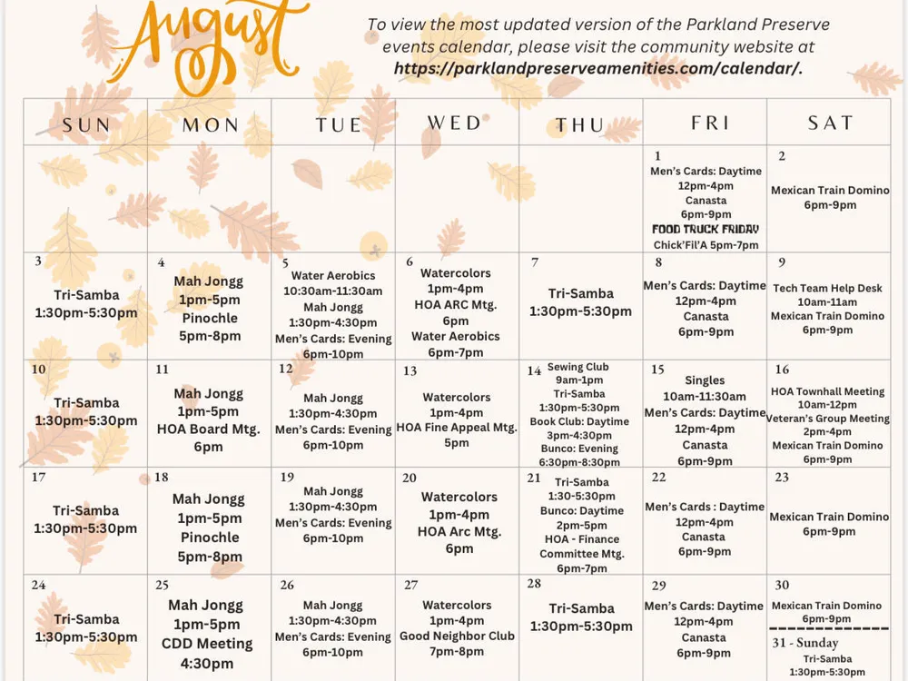 There are plenty of activities available in Parkland Preserve. Here is a sample of some of the clubs, activities and classes offered here.