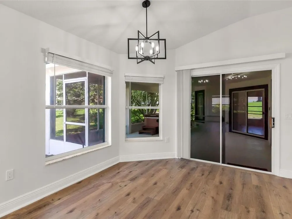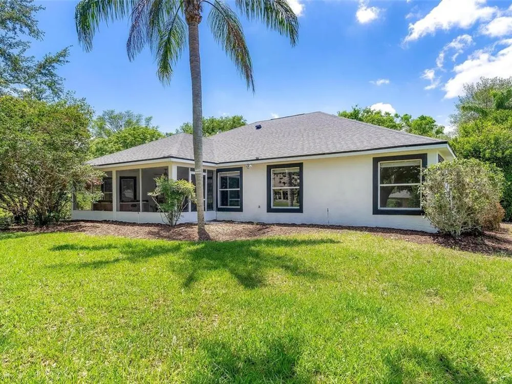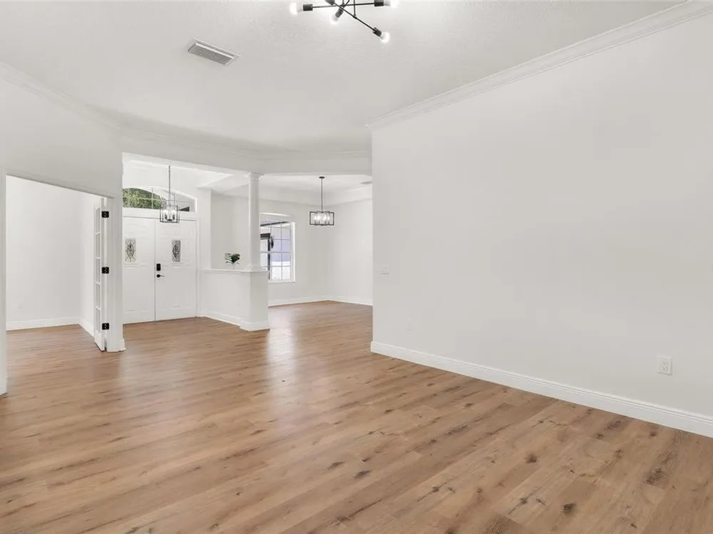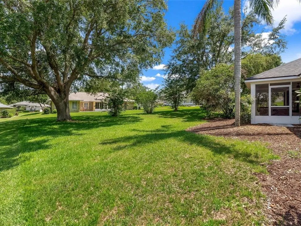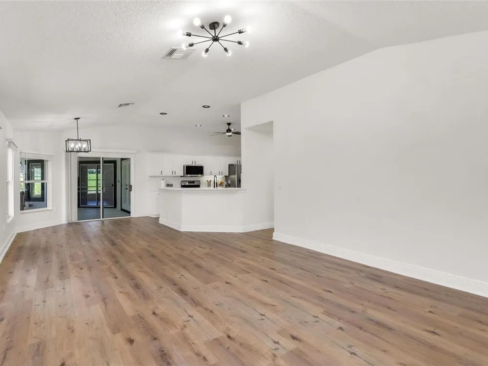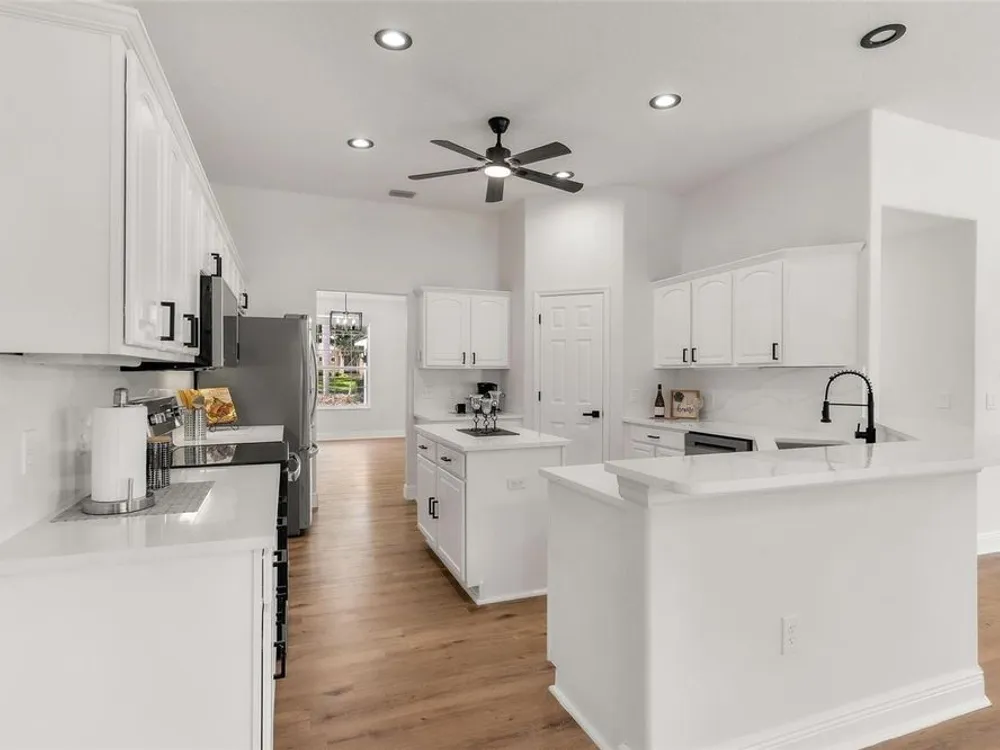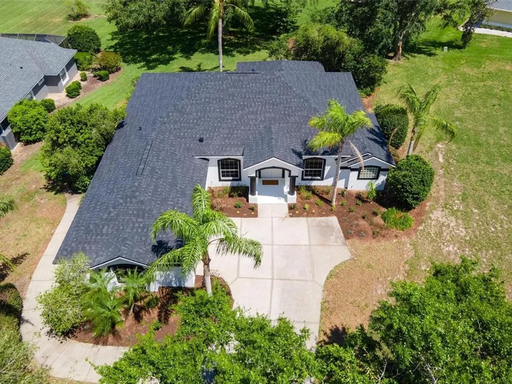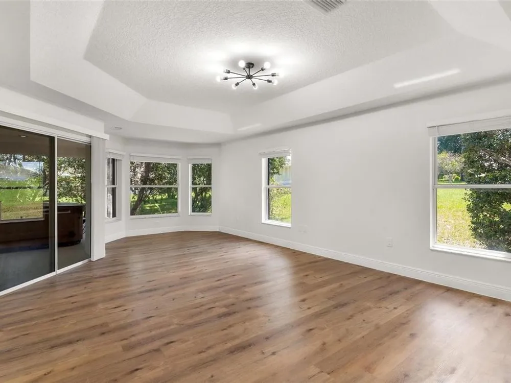LOOK NO MORE…LIKE NEW HOME! Newly renovated home…New Roof! Double door entrance to foyer opens to a formal living room with French doors to lanai & separate dining with volume ceilings and crown molding. Enjoy your private den/office with french doors! You will love the oversized kitchen with lighted walk in pantry that features upscale “Calacatta” countertops and full backsplash plus island great for entertaining and additional food prep. Upgraded appliances to include refrigerator, smooth top range and brand new dishwasher & microwave. Large snack bar opens to the family room with “room for everybody and sliding doors to the screen porch where you can enjoy your own “hot tub” for year round relaxation!! Primary suite with sitting area and bay window will be your “happy place” with sliding doors to the lanai and an amazing 12 x 12 irregular shaped bath with separate dual vanities and dual rain shower heads in the oversized glass walk in shower. Plus…one deep walk in & another large wall closet gives lots of clothes storage. Your guests will love the split plan design that lead to bedroom 2 & 3 with volume ceilings and share the hall bath with a tub/shower combo. UPGRADES GALORE and improvements included: New Vinyl “Wood Look” floors in entire home plus newly painted inside and out! All light switches/fixtures, recessed lights, hardware, ceiling fans, and chandeliers were replaced. New blinds. Large two car garage with separate golf cart access with new epoxy coating on the floor! You will have no regrets making this your next "HOME SWEET HOME"!