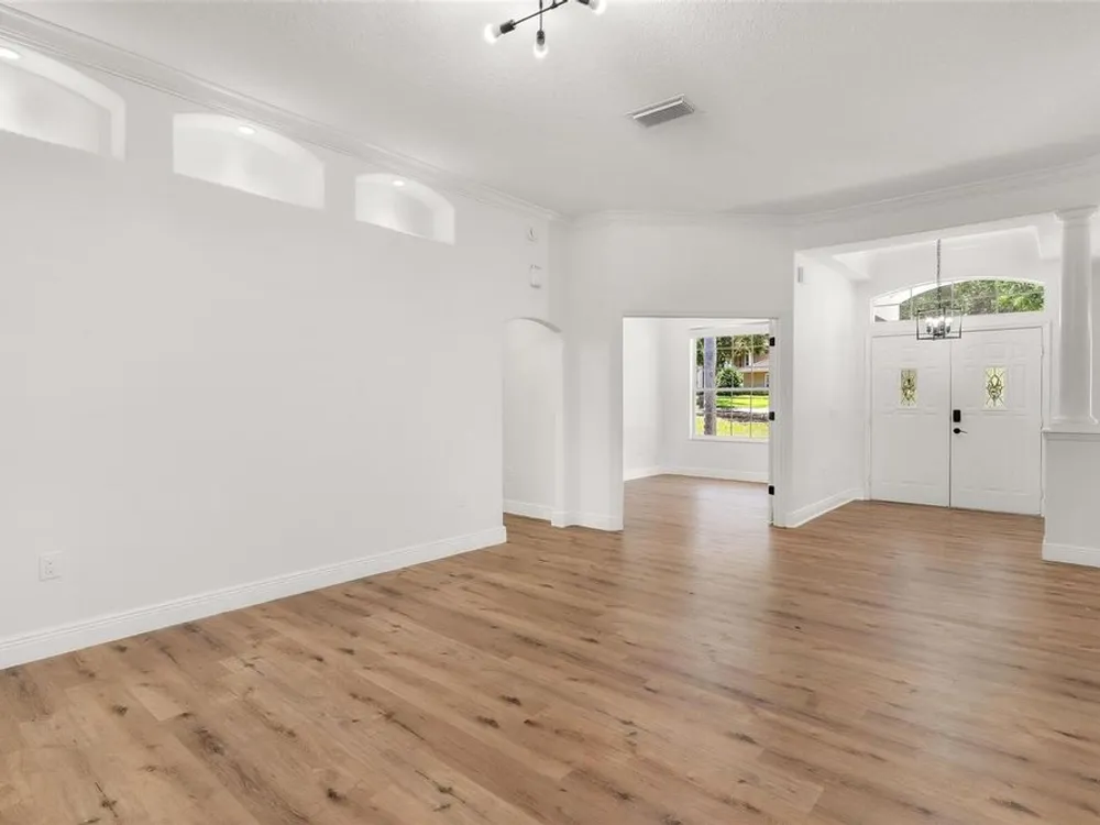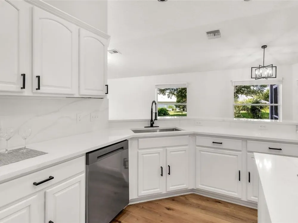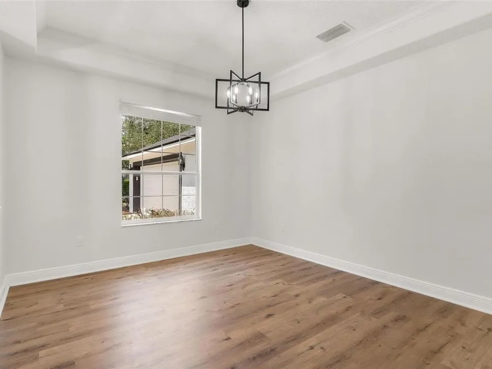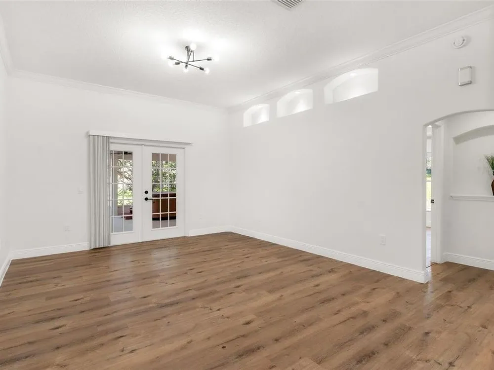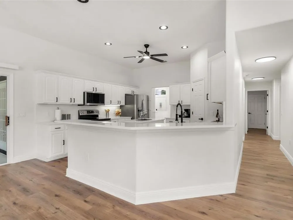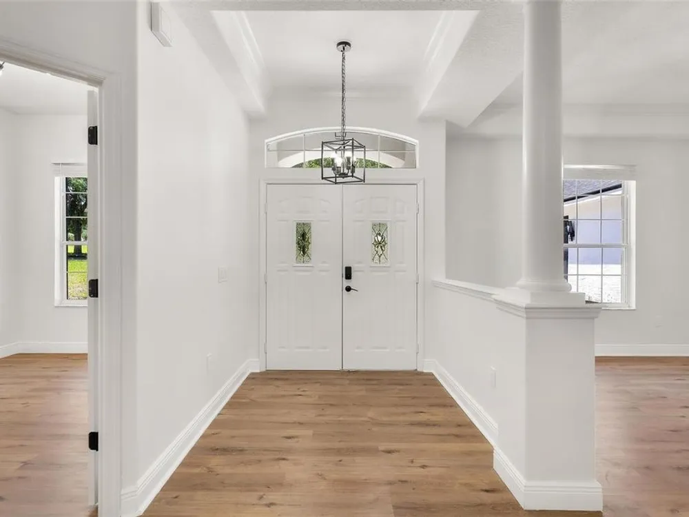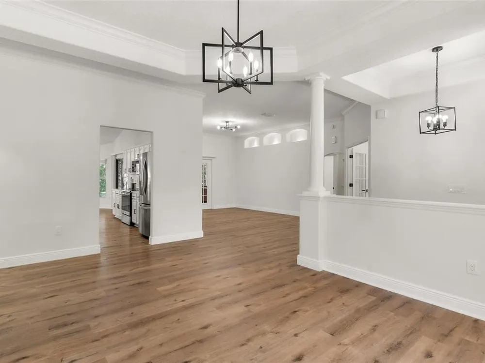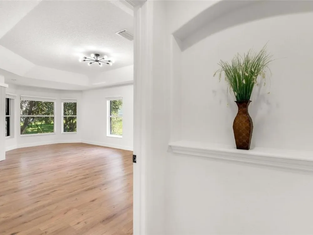 LOOK NO MORE…LIKE NEW HOME! Newly renovated home…New Roof! Double door entrance to foyer opens to a formal living room with French doors to lanai & separate dining with volume ceilings and crown molding. Enjoy your private den/office with french doors! You will love the oversized kitchen with lighted walk in pantry that features upscale “Calacatta” countertops and full backsplash plus island great for entertaining and additional food prep. Upgraded appliances to include refrigerator, smooth top range and brand new dishwasher & microwave. Large snack bar opens to the family room with “room for everybody and sliding doors to the screen porch where you can enjoy your own “hot tub” for year round relaxation!! Primary suite with sitting area and bay window will be your “happy place” with sliding doors to the lanai and an amazing 12 x 12 irregular shaped bath with separate dual vanities and dual rain shower heads in the oversized glass walk in shower. Plus…one deep walk in & another large wall closet gives lots of clothes storage. Your guests will love the split plan design that lead to bedroom 2 & 3 with volume ceilings and share the hall bath with a tub/shower combo. UPGRADES GALORE and improvements included: New Vinyl “Wood Look” floors in entire home plus newly painted inside and out! All light switches/fixtures, recessed lights, hardware, ceiling fans, and chandeliers were replaced. New blinds. Large two car garage with separate golf cart access with new epoxy coating on the floor! You will have no regrets making this your next "HOME SWEET HOME"!