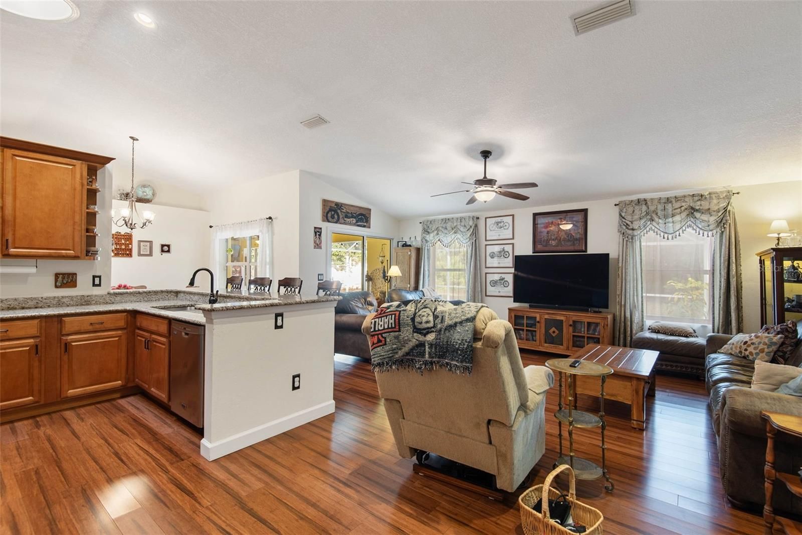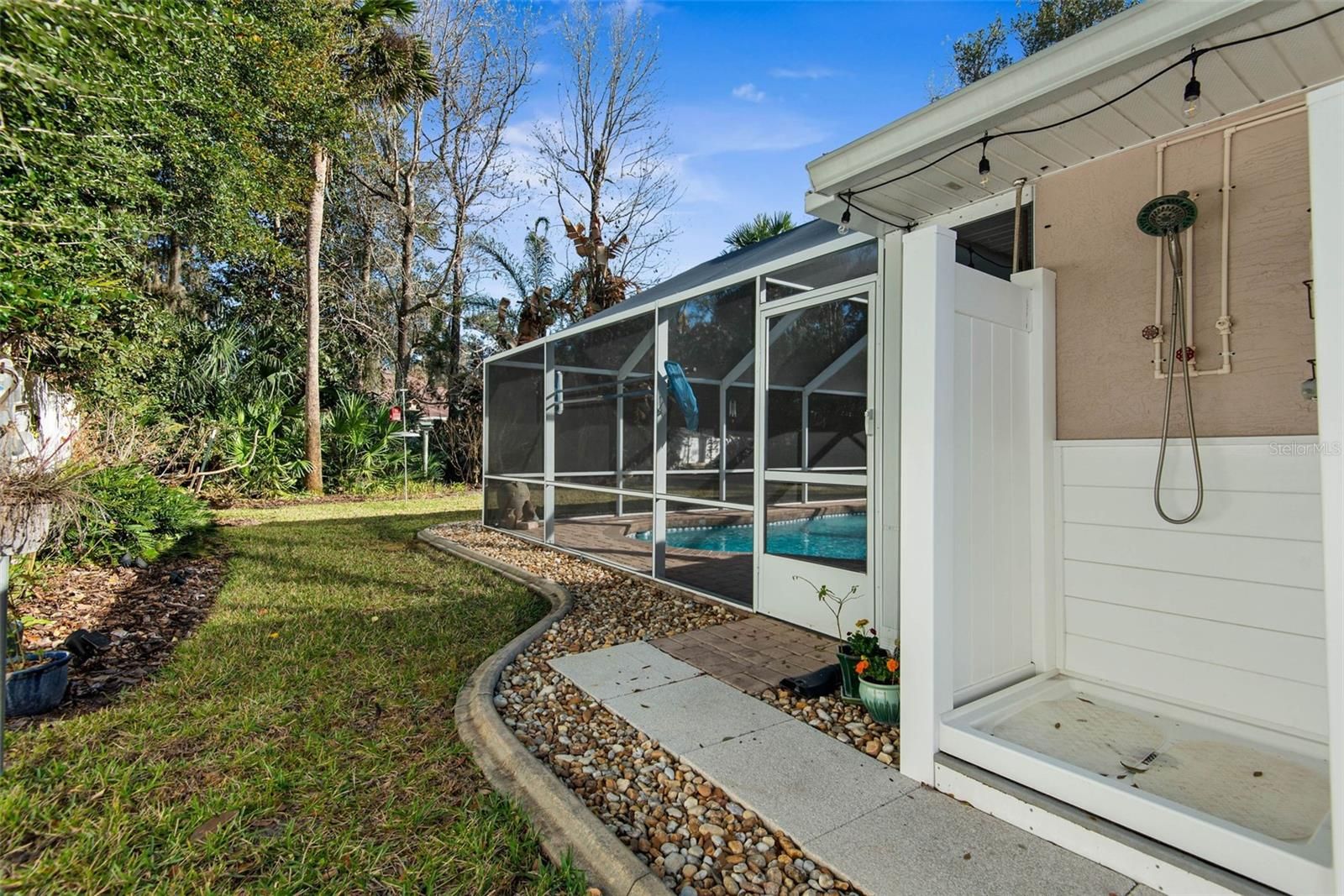 Spacious and inviting 3-bedroom, 2-bath home built in 1999, offering a versatile layout designed for both comfort and functionality. This well-maintained property features a separate family room, living room, and dining room—perfect for entertaining or everyday living. The heart of the home is the beautifully appointed kitchen, complete with granite countertops, quality Kraftmaid cabinetry with soft-close drawers, and a convenient eat-at counter that comfortably seats four. Vaulted ceilings enhance the open feel, while a blend of wood, tile, travertine, and vinyl flooring adds both style and durability throughout. Step outside to your own private retreat featuring a solar-heated, chlorine pool and an expansive lanai—ideal for relaxing or hosting gatherings. The fully fenced backyard offers exceptional privacy and includes a rare outdoor stall shower with its own dedicated water heater, perfect after a swim or working outdoors. Situated on a large lot—approximately half an acre or more—this property also includes a well for irrigation, city water, gutters, and a recently pumped septic system for added peace of mind. Major updates have already been taken care of, including a roof (2017), water heater (2017), and AC (2015). A termite bond with Cody is also in place. With its combination of indoor comfort, outdoor living, and thoughtful upgrades, this home offers the perfect blend of space, privacy, and convenience.