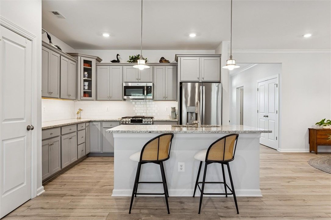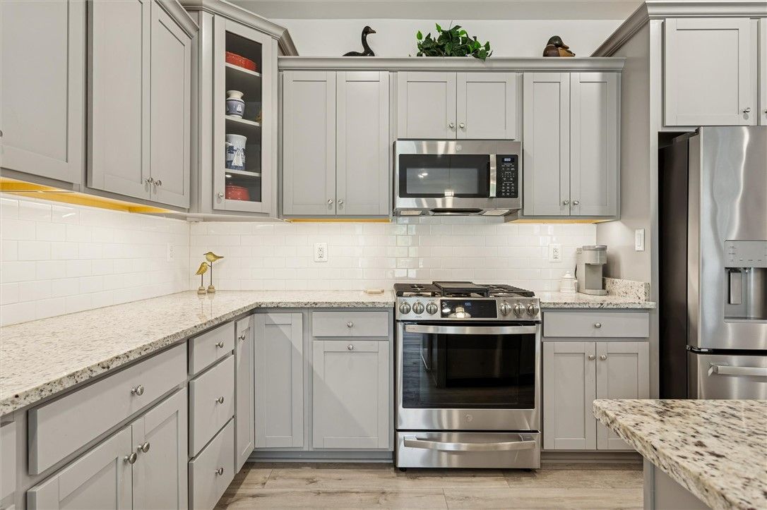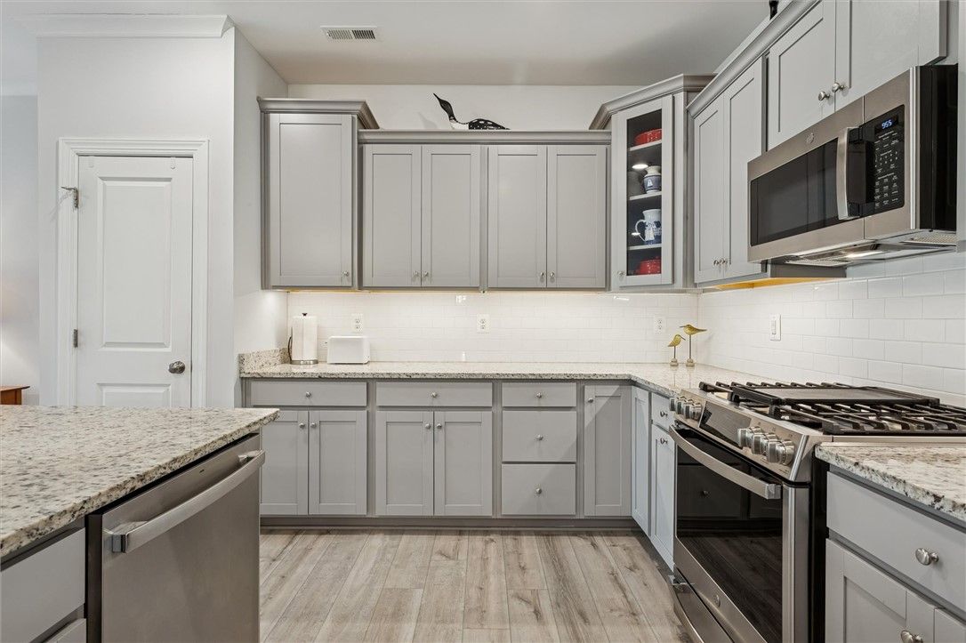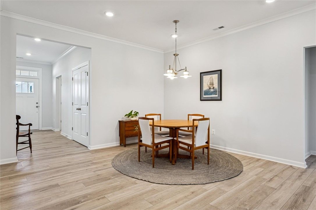 - Dining Area, Double Vanity, Eat-in Kitchen, Granite Counters, High Ceilings, Kitchen Island, Recessed Lighting, Walk-In Closet(s), Window Treatments