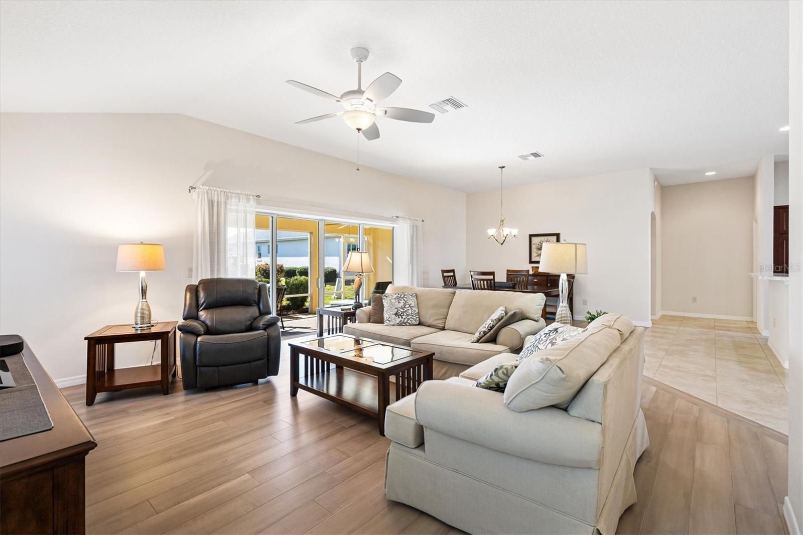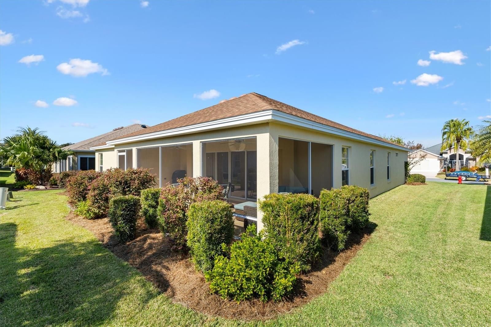 WHAT A GREAT LOCATION -- Minutes to BROWNWOOD PADDOCK SQUARE. Mrs. CLEAN LIVES here and there is NO CARPET! This beautiful 3 bedroom 2 bath GARDENIA is 1963 sq ft, has had 1 owner and has been used as a snowbird home. It's being sold **TURNKEY ALSO INCLUDED is a 2011 YAMAHA GAS GOLF CART** Nestled in LAKE DEATON, this lovely home has great curb appeal with Florida plants and a peek-a-boo of the pond. Step inside to an OPEN CONCEPT floor plan with CERAMIC TILE flooring in the kitchen and wet areas with BEAUTIFUL ENGINEERED HARDWOOD FLOORING throughout the rest of the home! The kitchen has stair stepped cabinetry, high definition laminate counters and STAINLESS STEEL appliances (NEW OVEN). The dining and living room open out to a 27 x 10 screened lanai. The spacious primary suite has 2 WALK-IN closets an EN-SUITE bath w/a tiled ROMAN SHOWER, dual vanities and a separate water closet. The guest bedrooms are on the other side of the home and have a shared guest bath with laminate countertops and a tub/shower combo. Lake Deaton is one of The Villages most sought-after locations, situated just north of Highway 44 and close to Brownwood Paddock Square, where you’ll enjoy GOLF, shopping, dining, and nightly ENTERTAINMENT. This home has been meticulously maintained and barely lived in....Don't walk....RUN...Make your appointment to see this home today! Roof (2014) HVAC (2014) Water Heater (2014). Bond balance is $16,850.14.